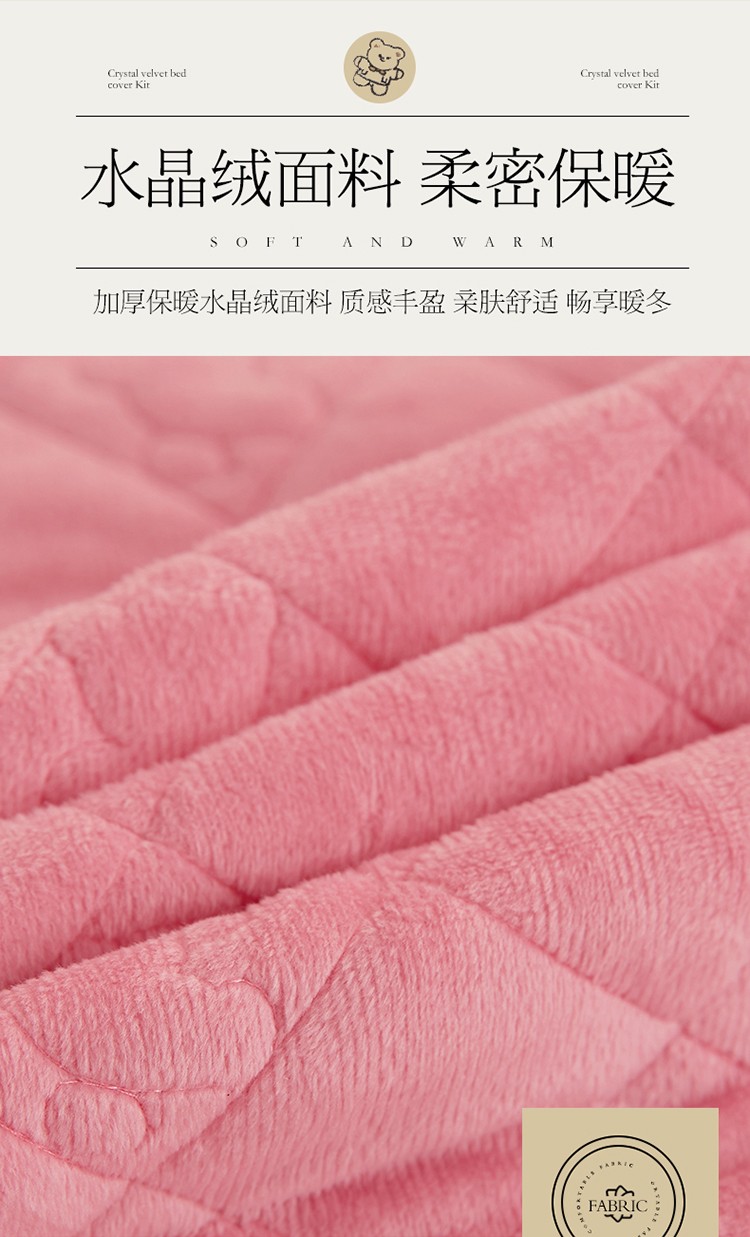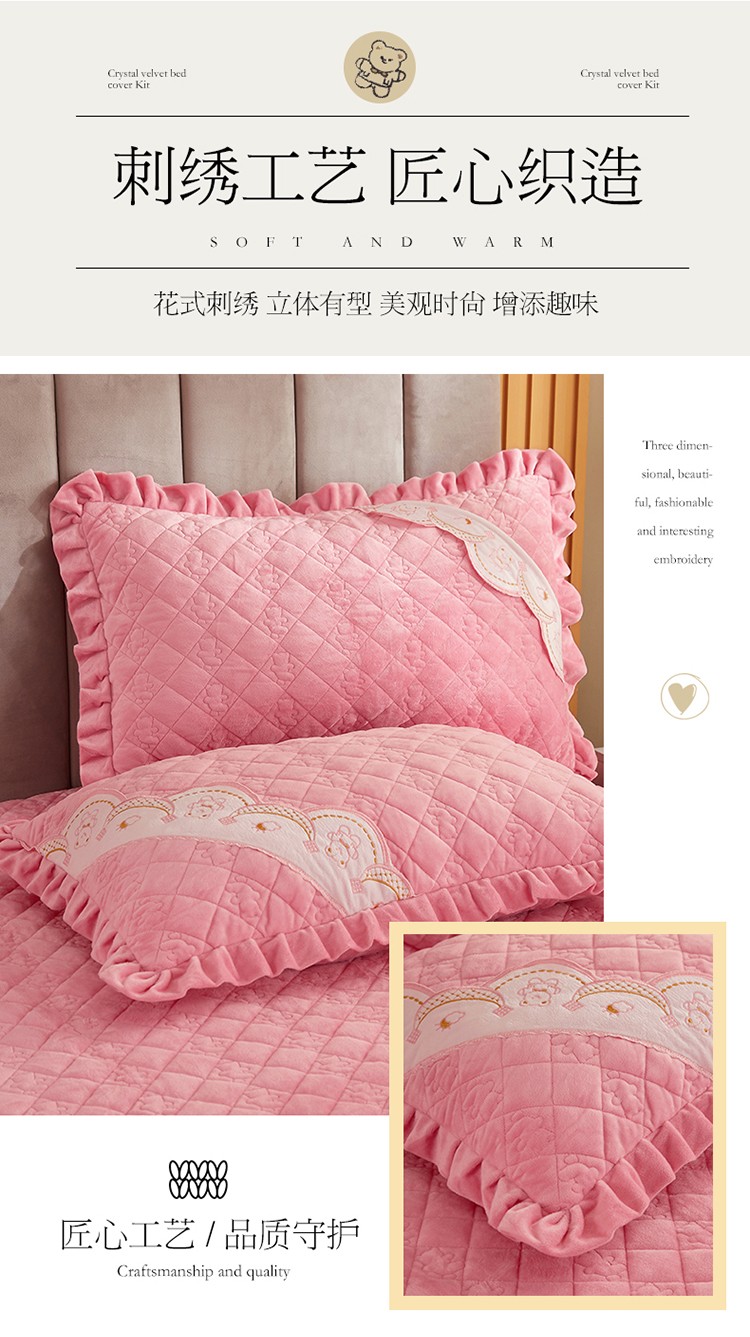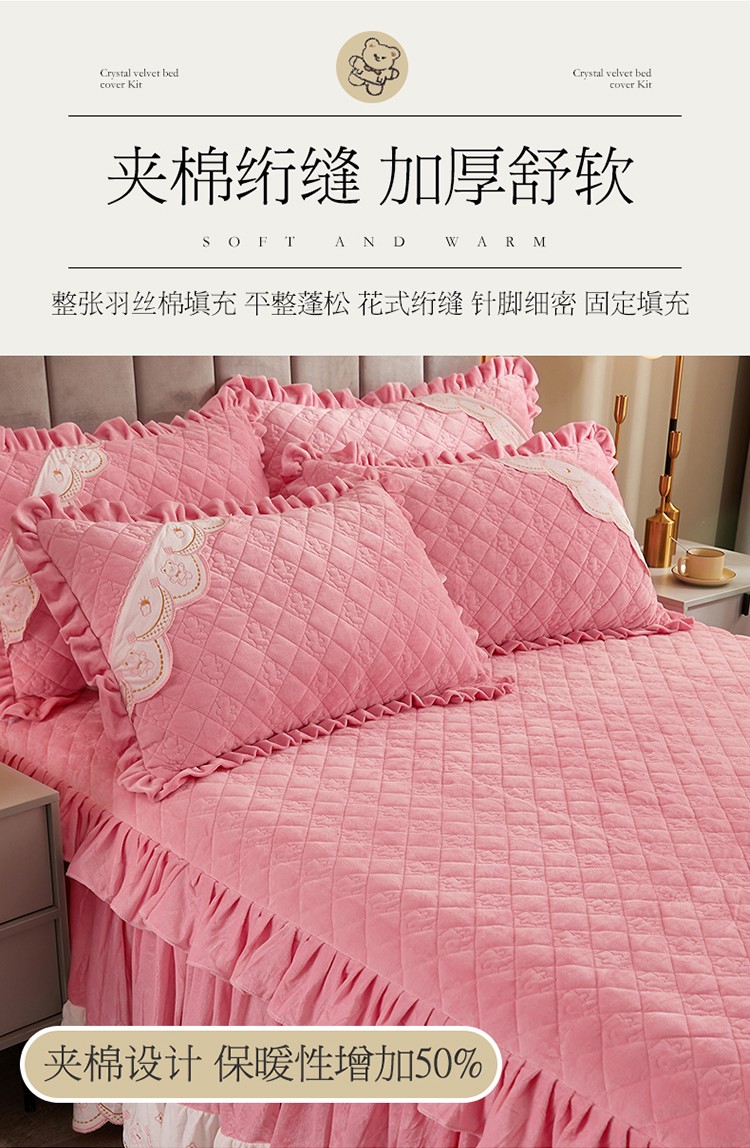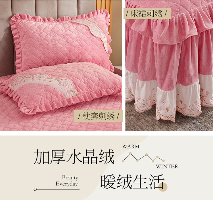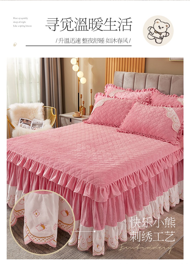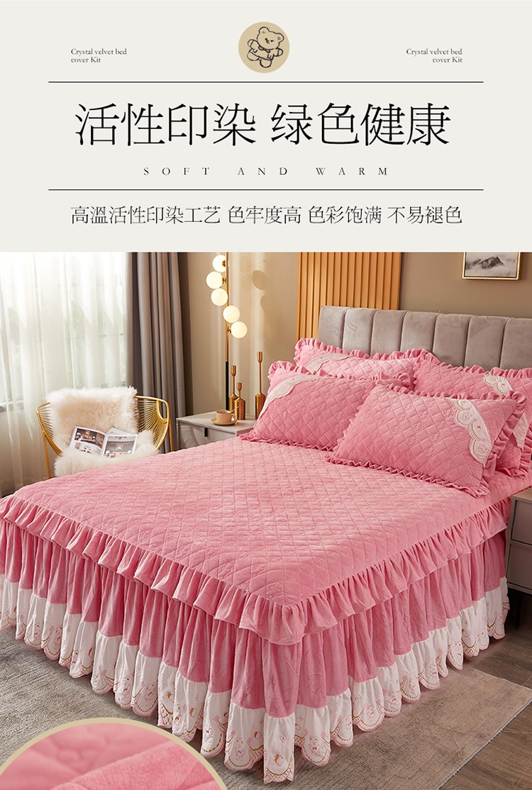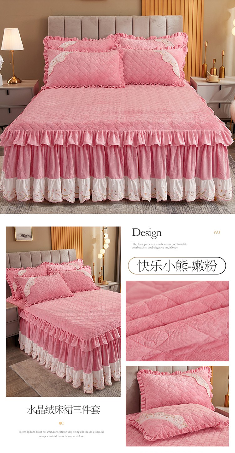 商品名称:宜凡家纺 2021新款水晶绒夹棉绗缝床裙三件套快乐小熊-嫩粉