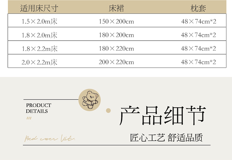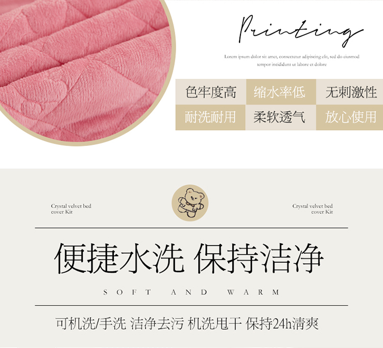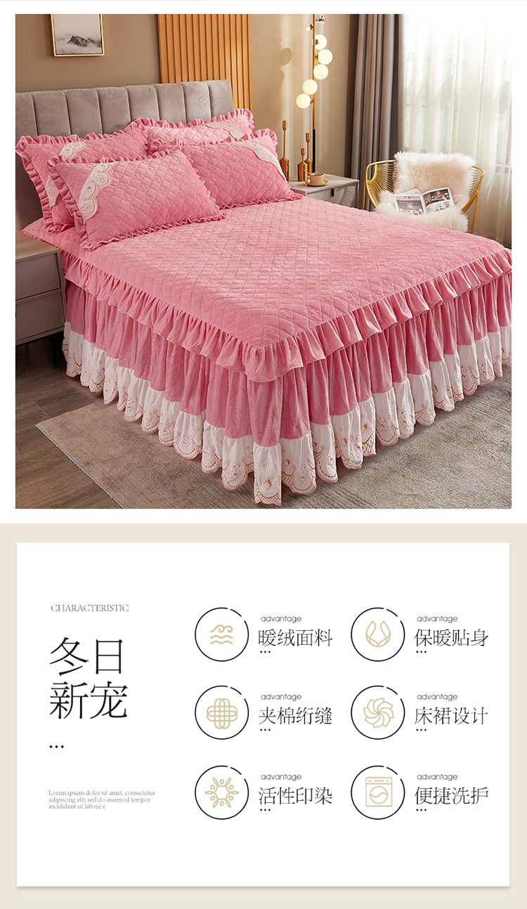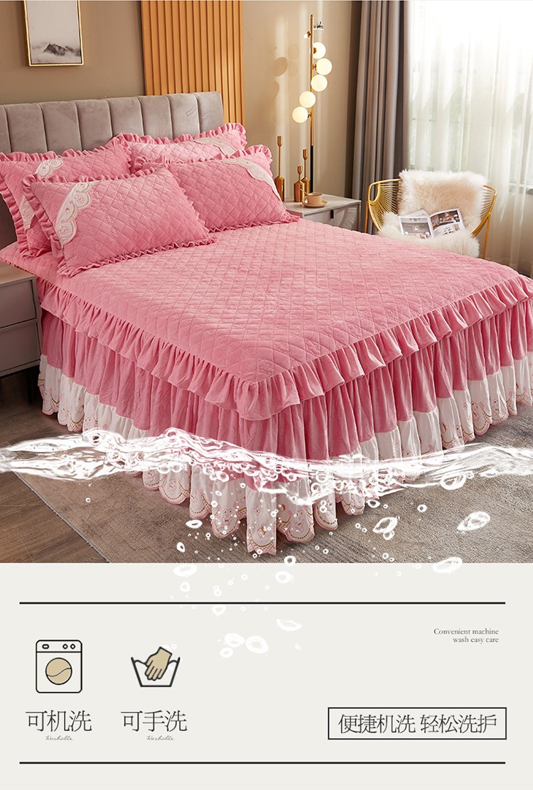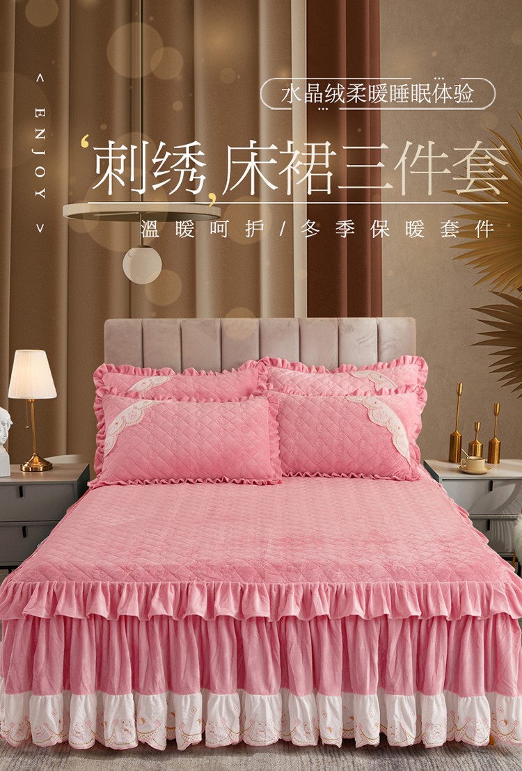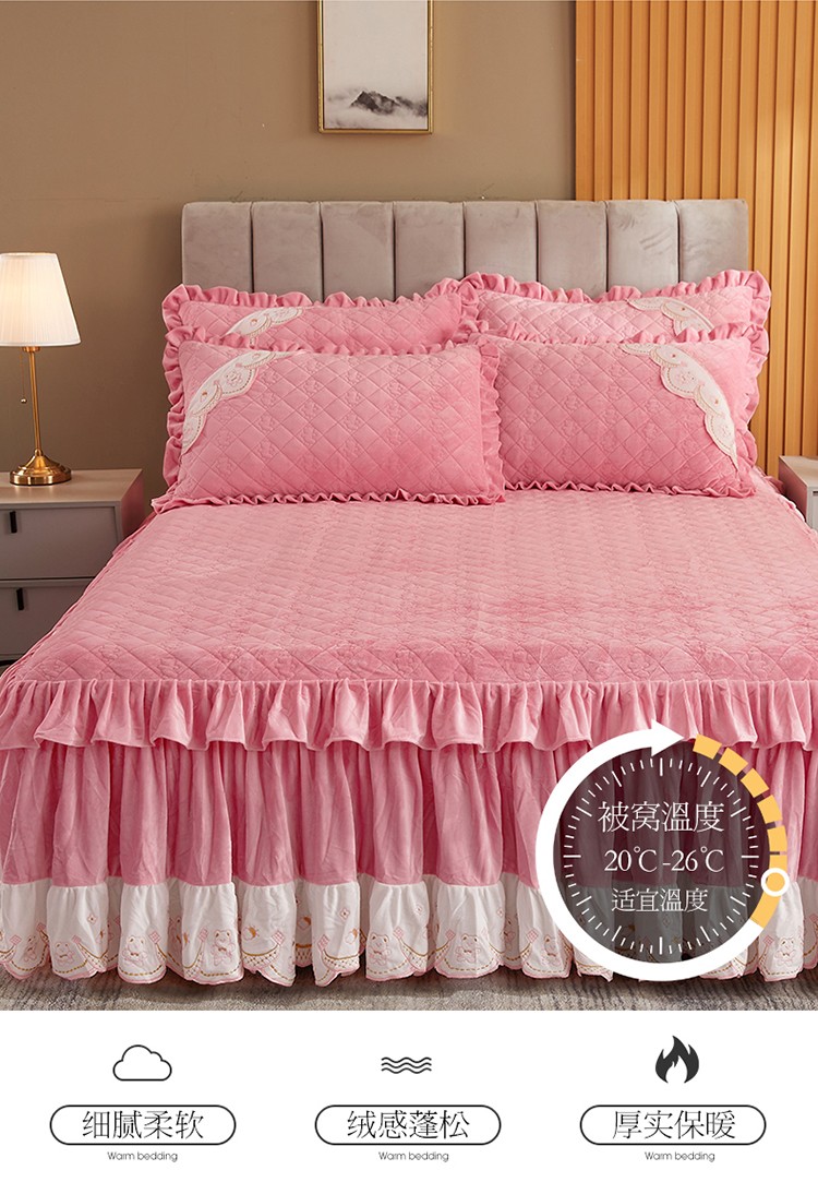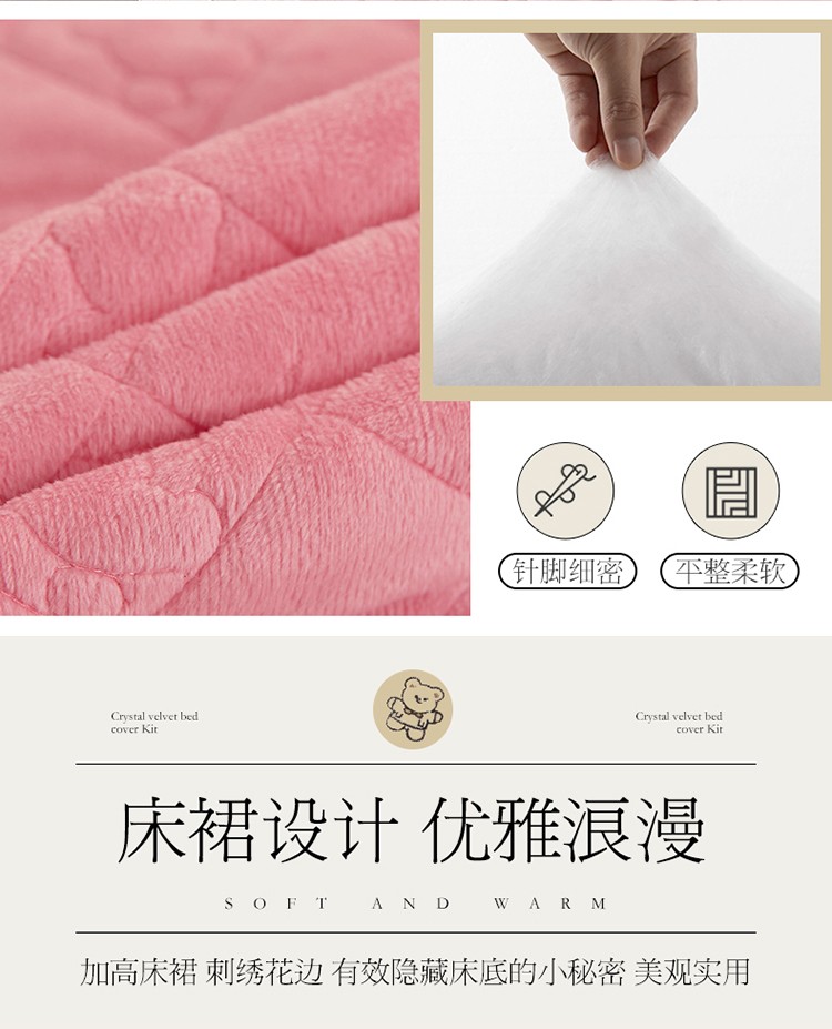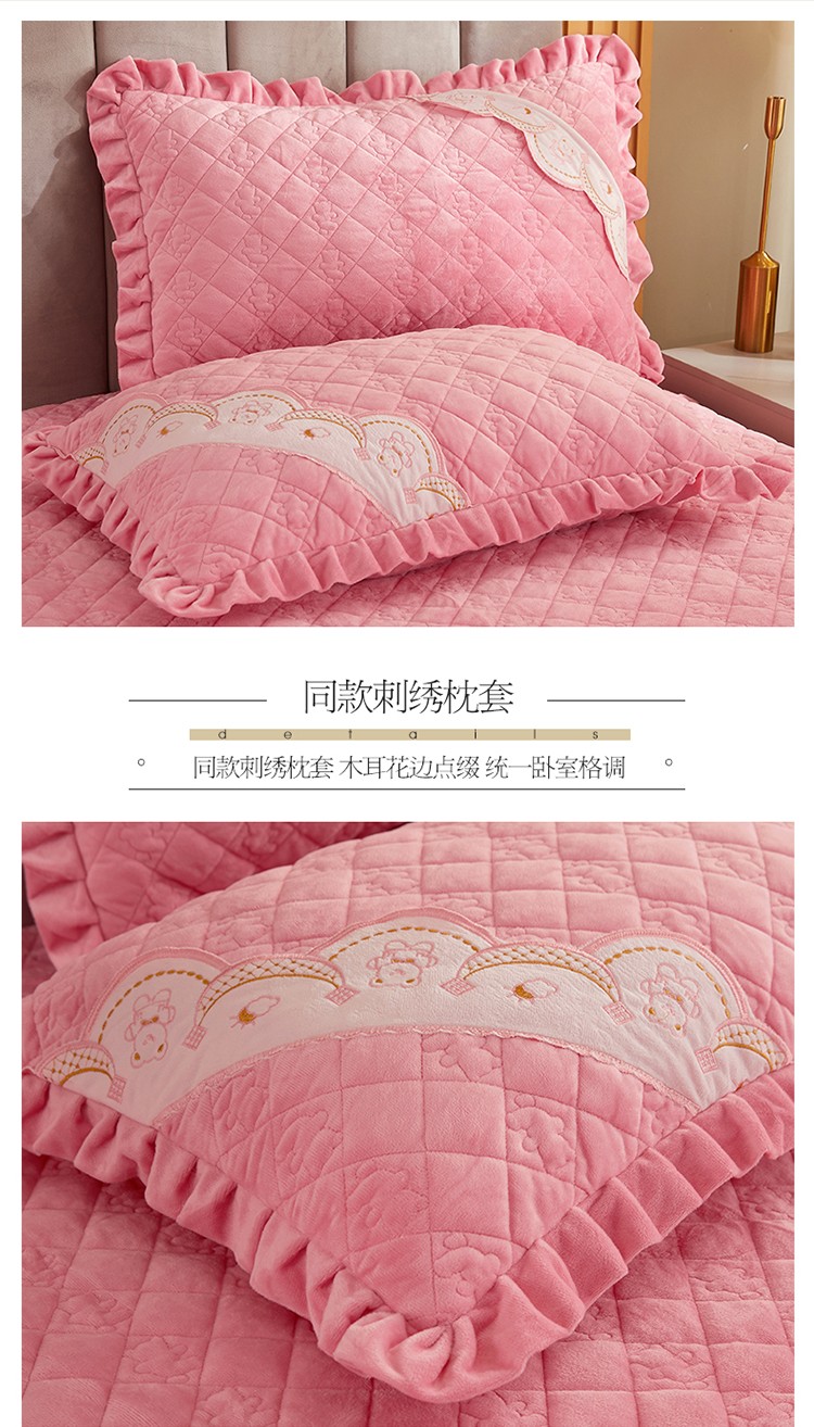 商品名称:宜凡家纺 2021新款水晶绒夹棉绗缝床裙三件套快乐小熊-嫩粉