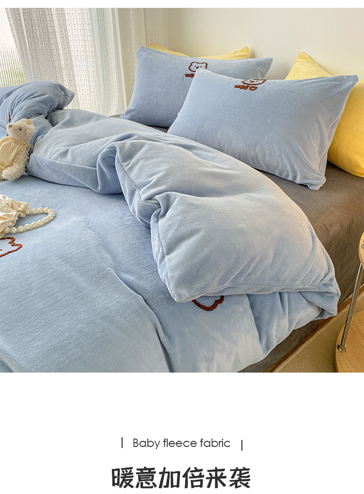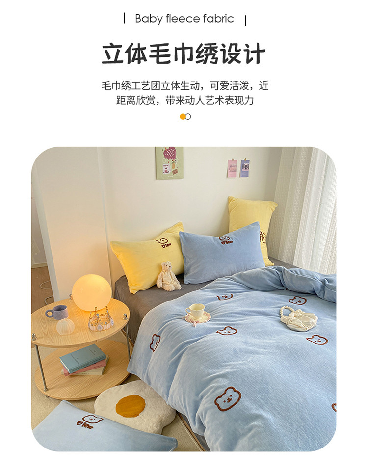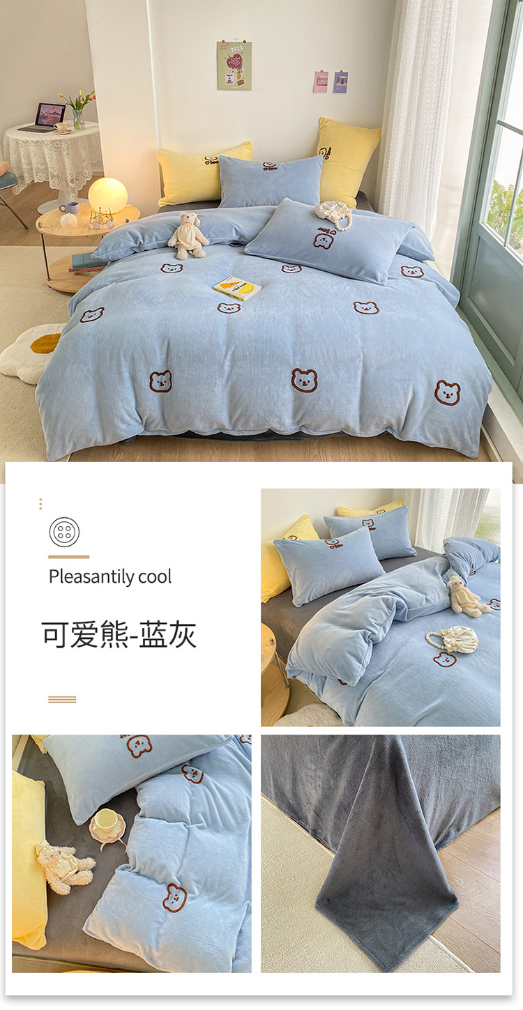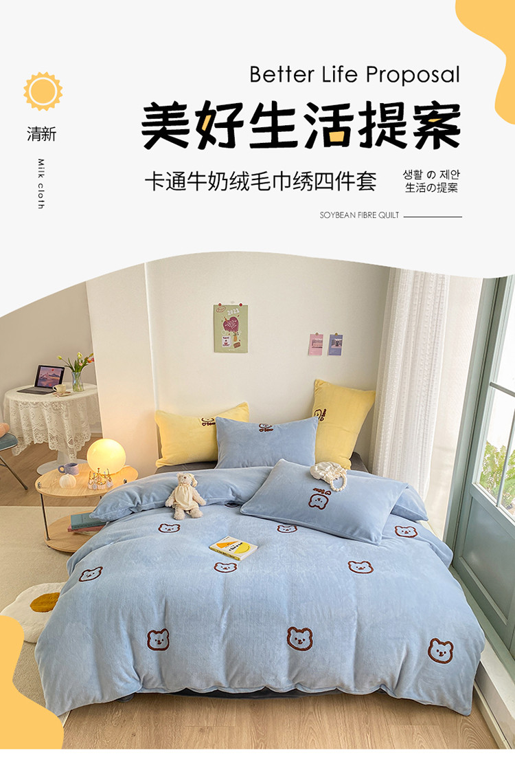 商品名称:雅居纺 2022新款牛奶绒毛巾绣四件套拍摄风格2 可爱熊-蓝灰