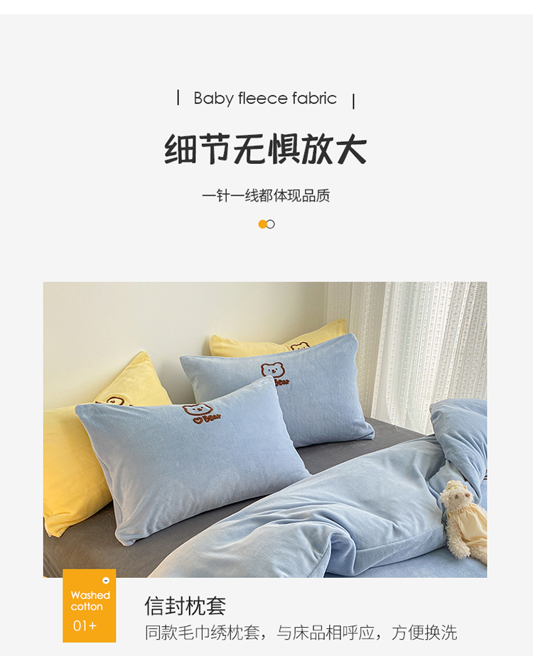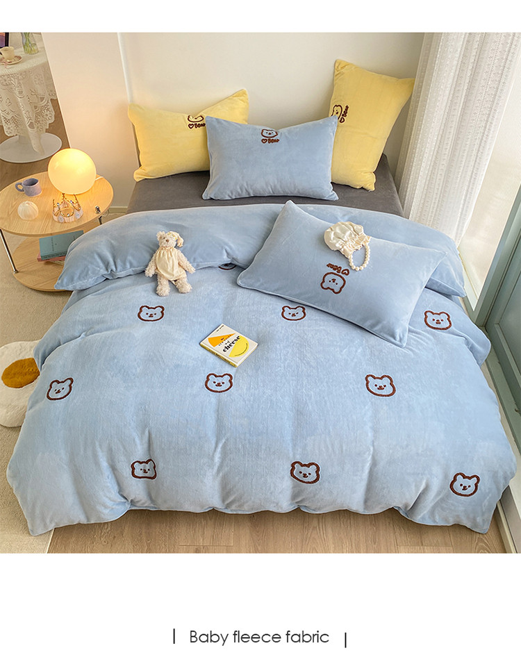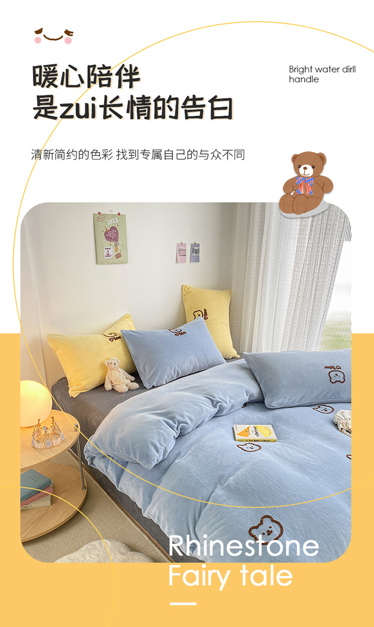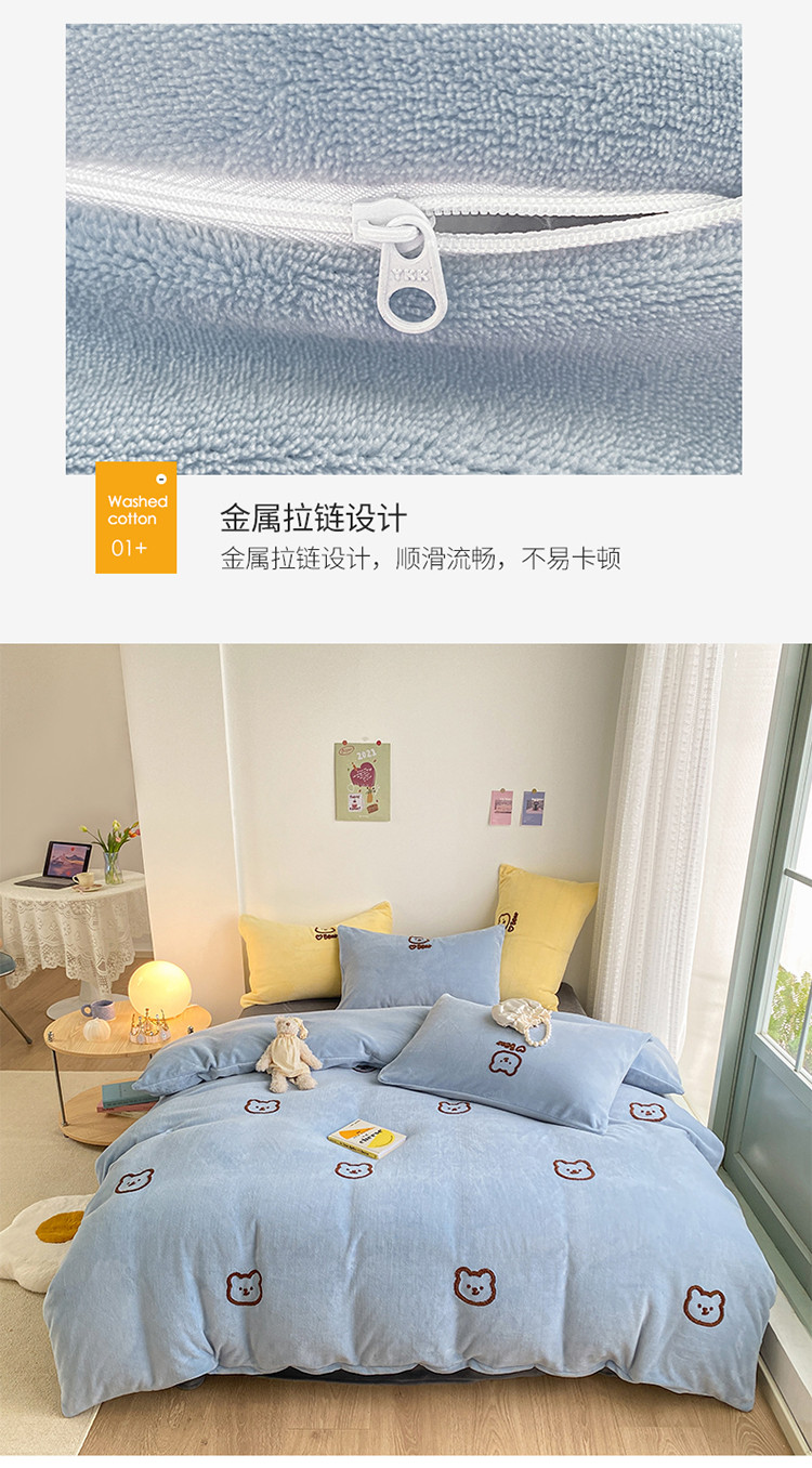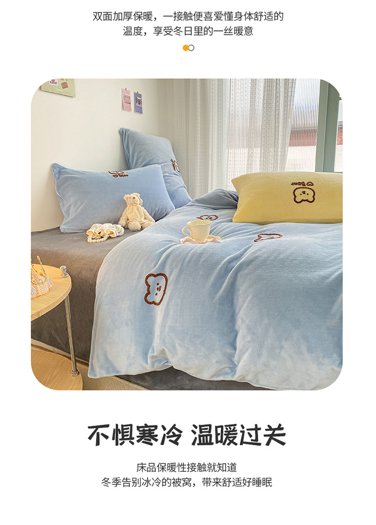 商品名称:雅居纺 2022新款牛奶绒毛巾绣四件套拍摄风格2 可爱熊-蓝灰
