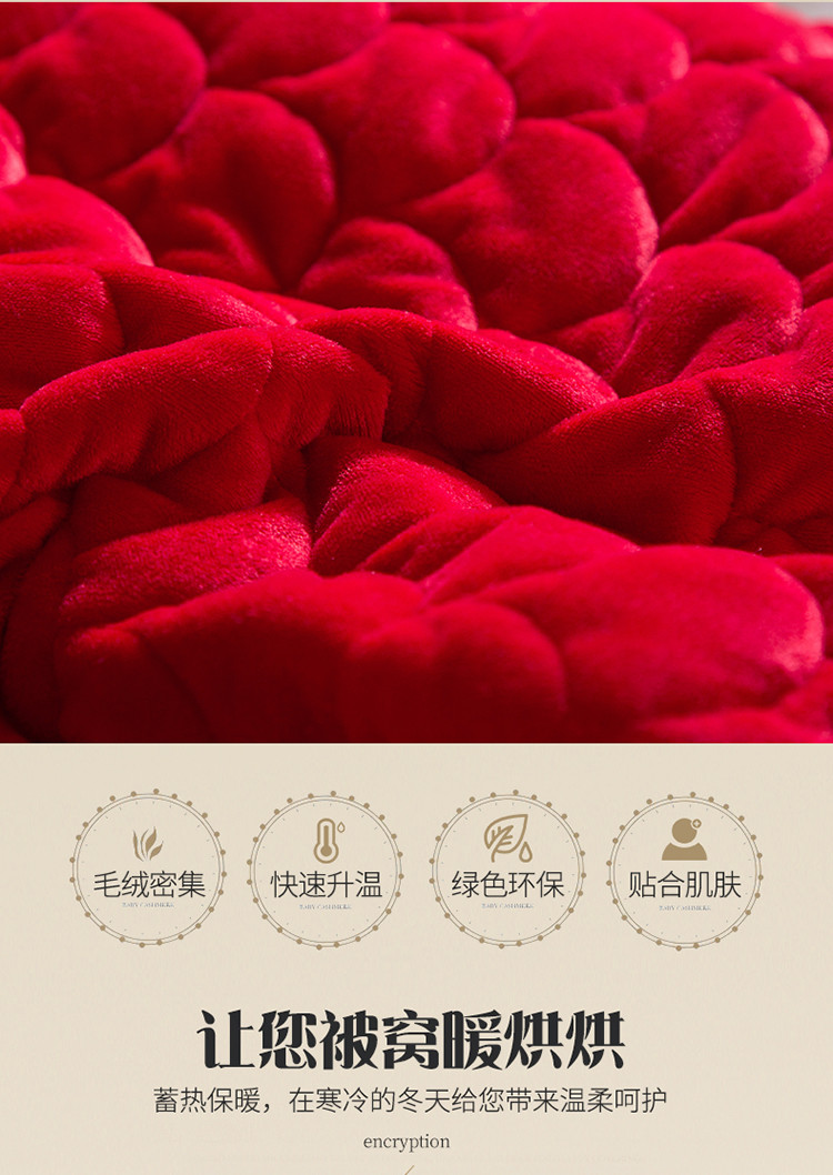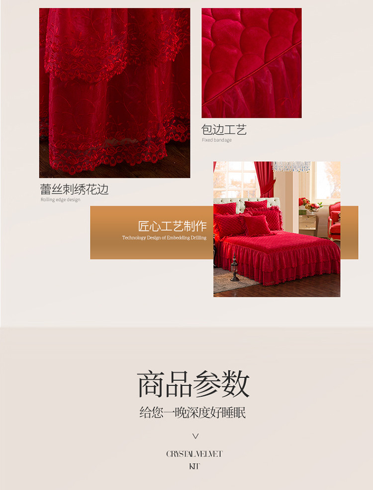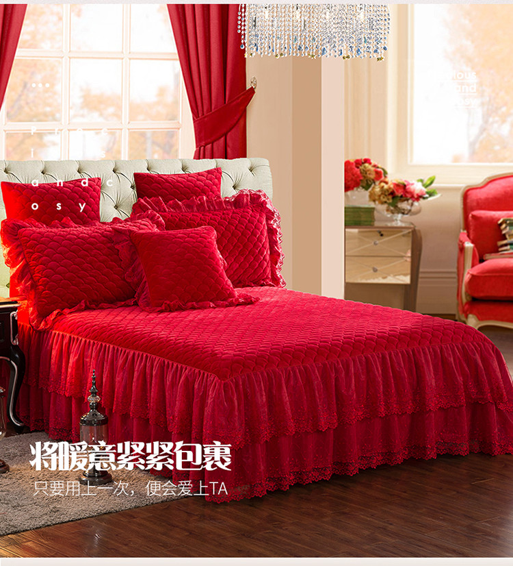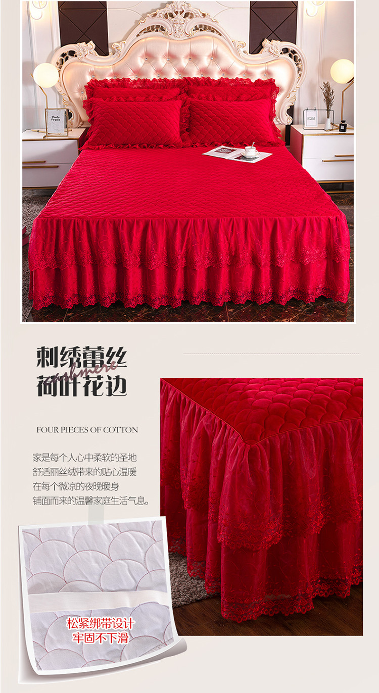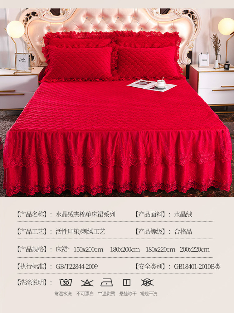 恒爱 2021新款水晶绒夹棉刺绣单床裙 翩翩花舞-大红色