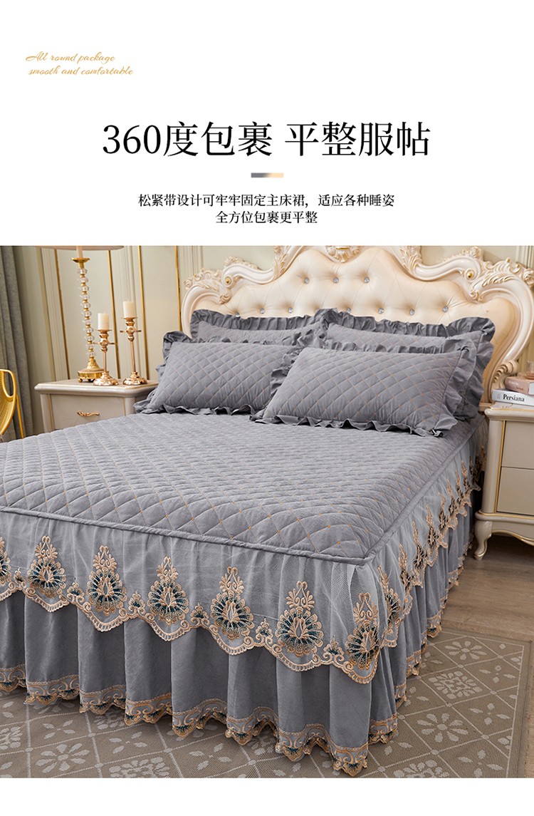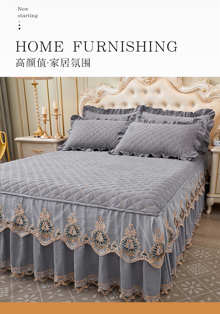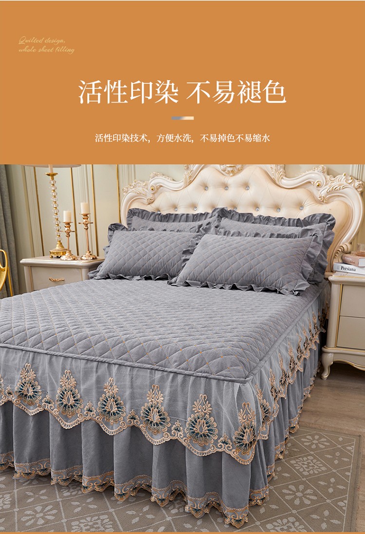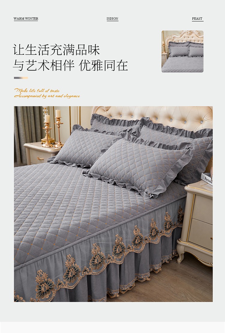 (总)屹成家纺2025新款水晶绒夹棉绗缝蕾丝床裙三件套(塞纳河畔)床裙单件起售价不低于105元,大红,豆沙,翡翠绿,粉玉,橄榄绿,蔚蓝,银灰