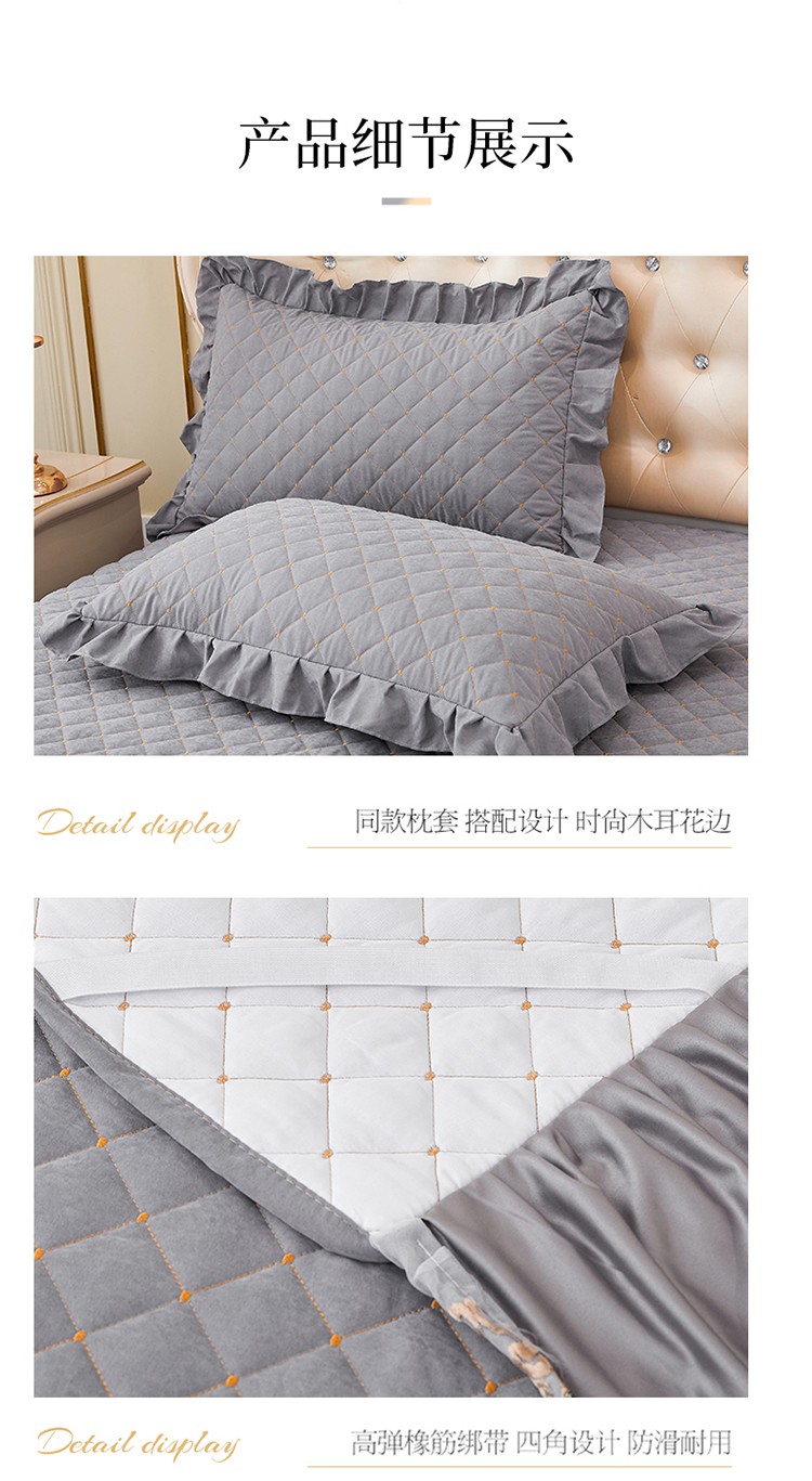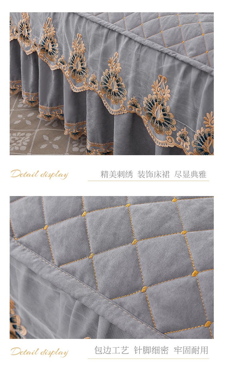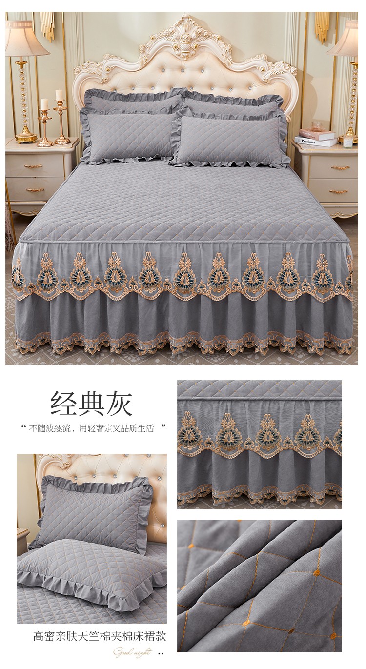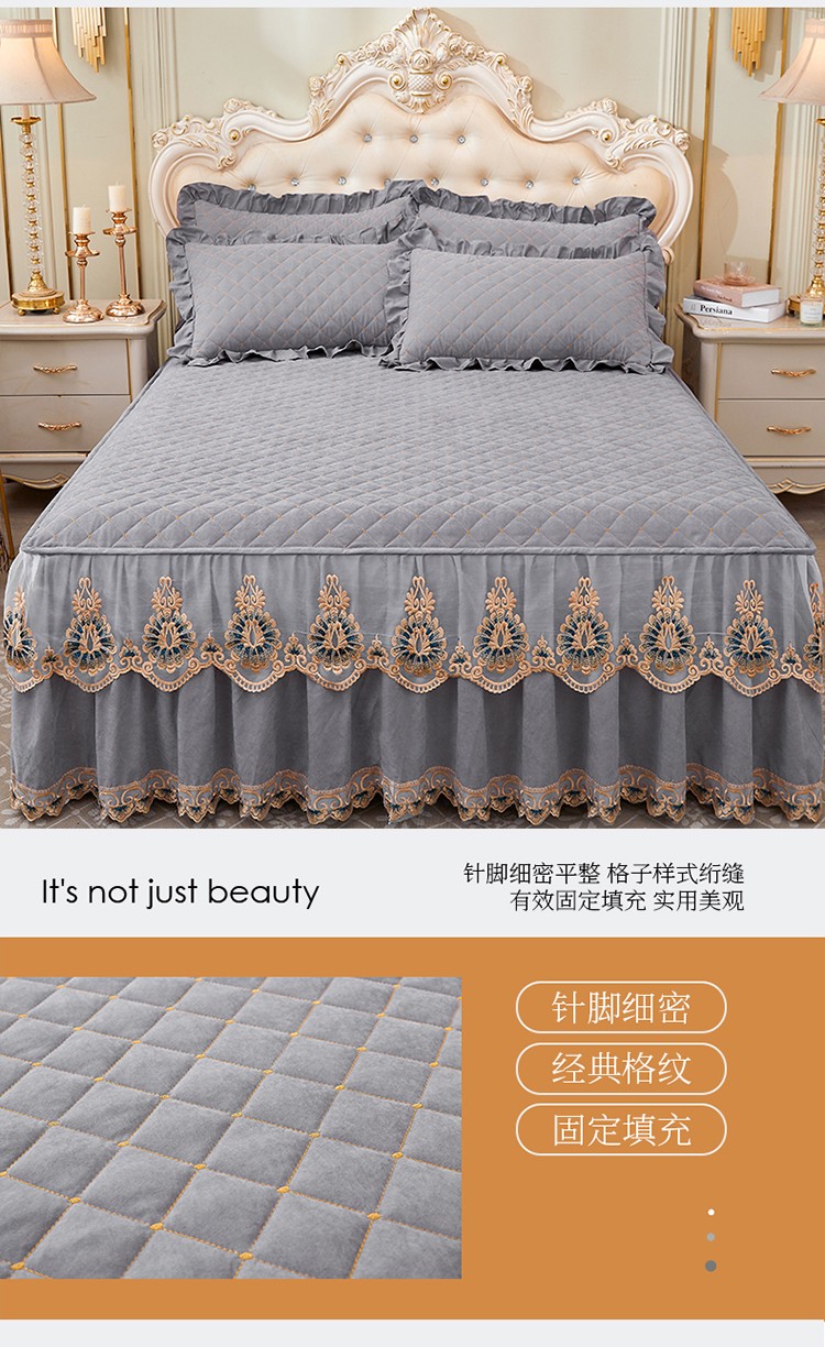 (总)屹成家纺2025新款水晶绒夹棉绗缝蕾丝床裙三件套(塞纳河畔)床裙单件起售价不低于105元,大红,豆沙,翡翠绿,粉玉,橄榄绿,蔚蓝,银灰