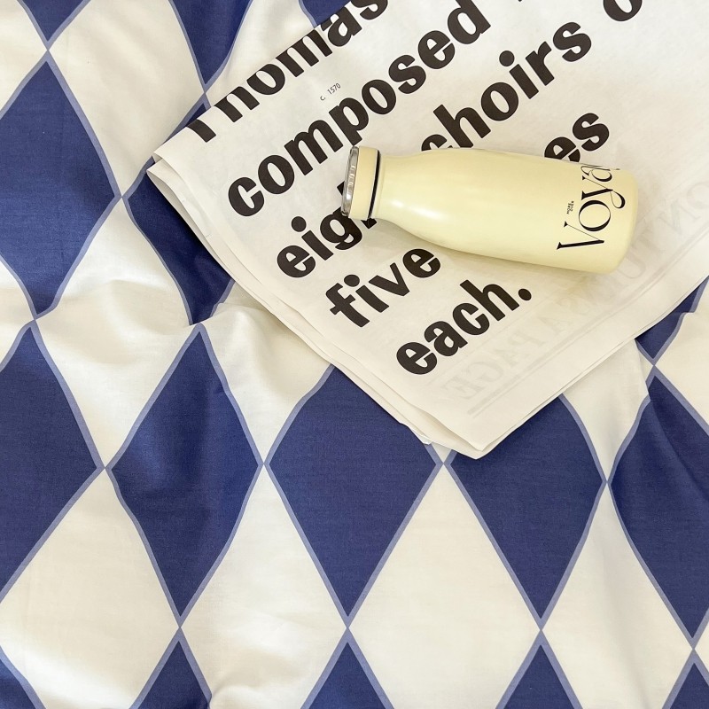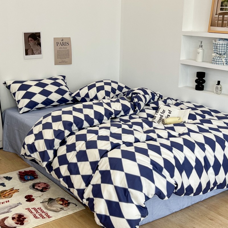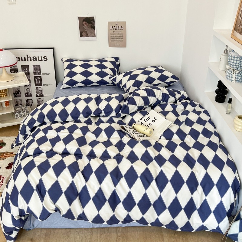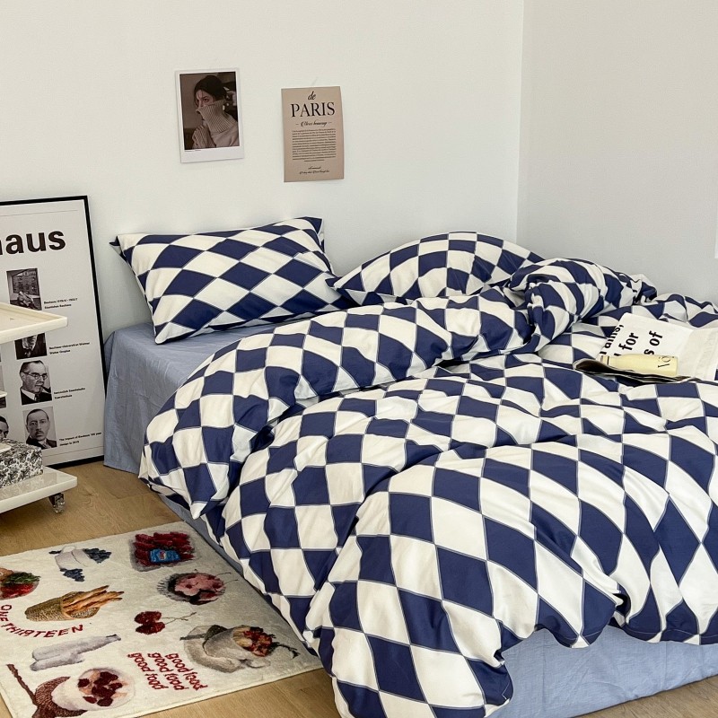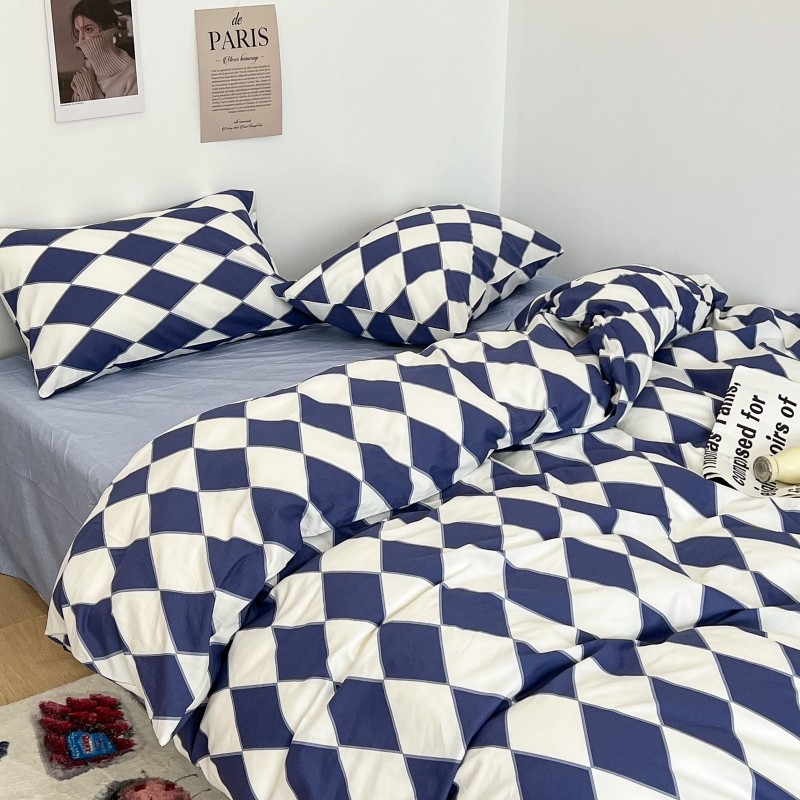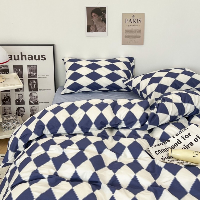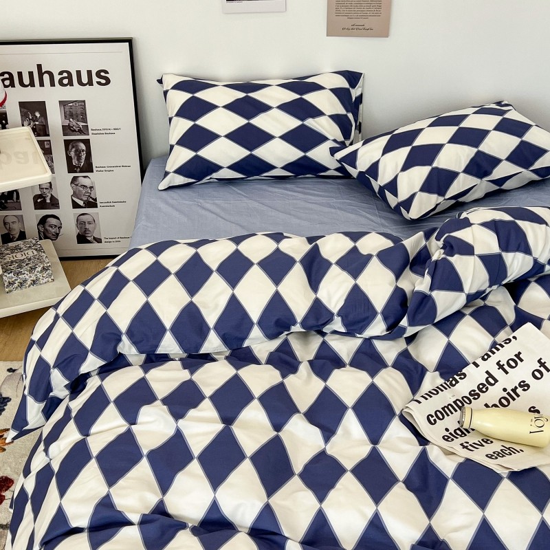 昔可家纺 2022新款简约几何北欧风全棉四件套 蓝菱格1