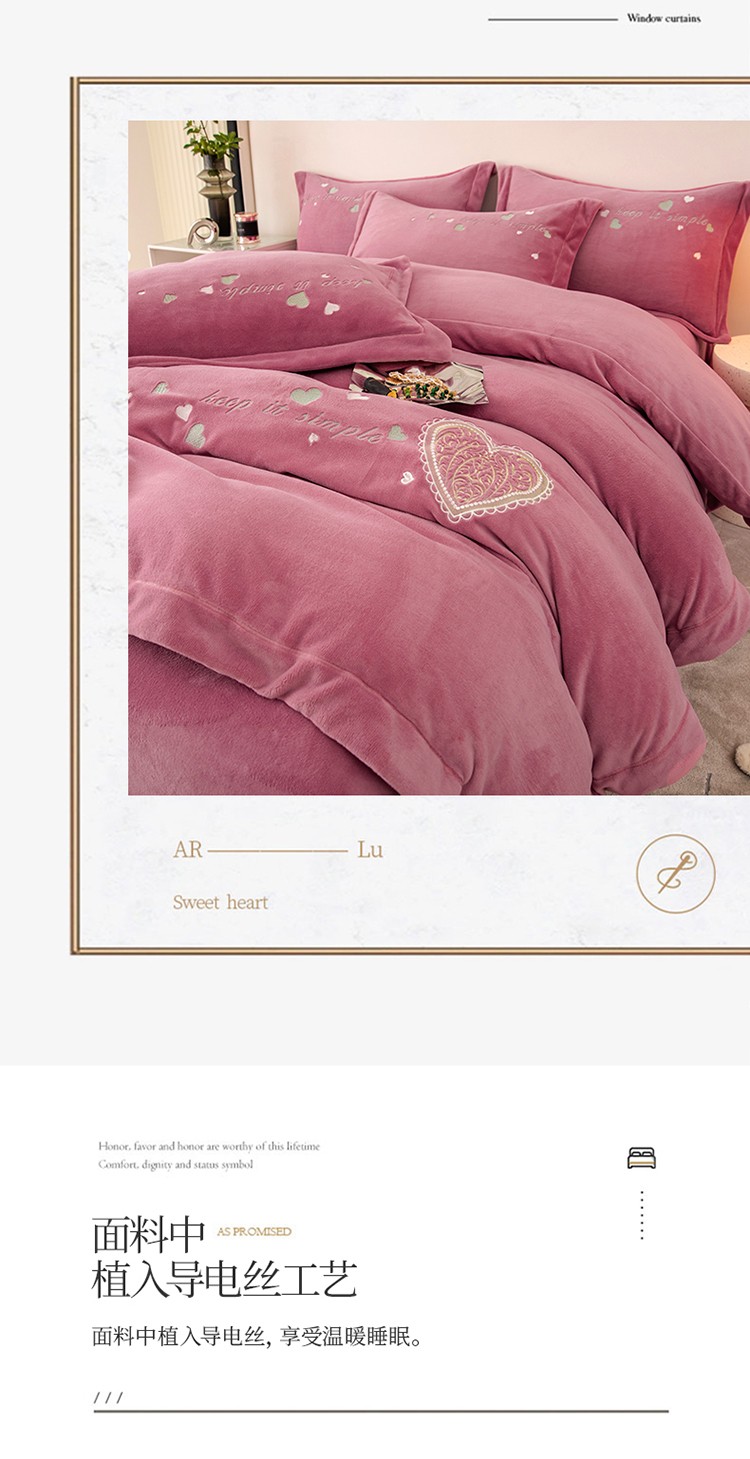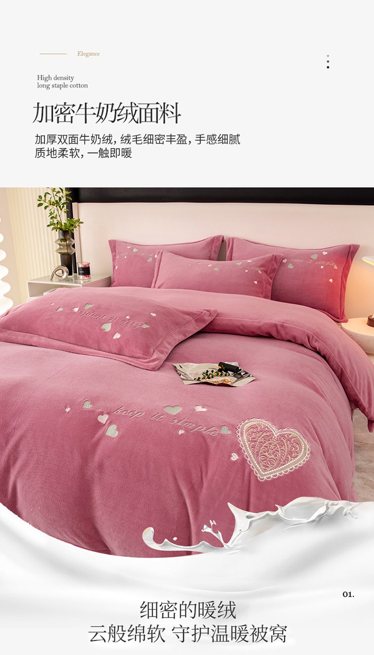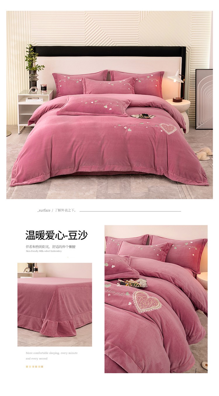 绒博士新款牛奶绒刺绣压线款四件套-温暖爱心 温暖爱心-豆沙