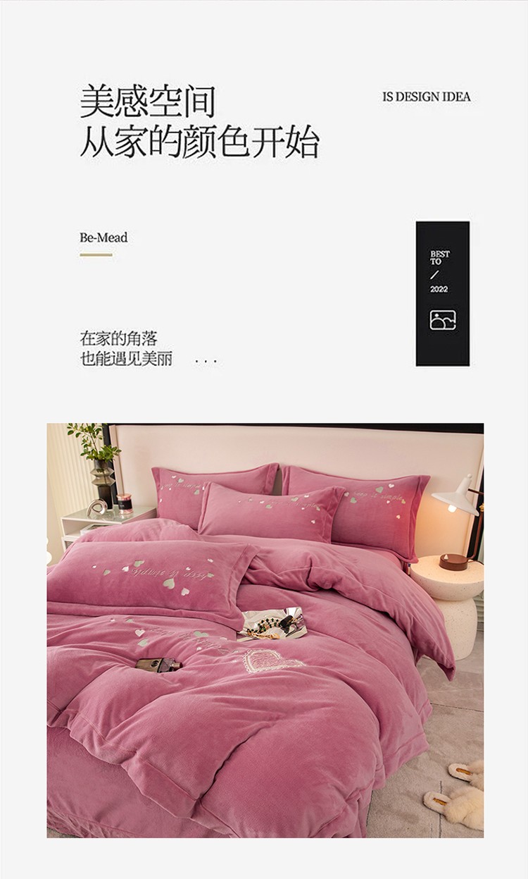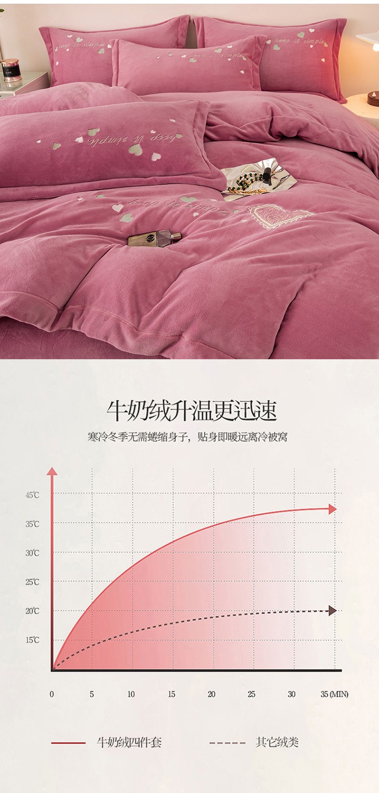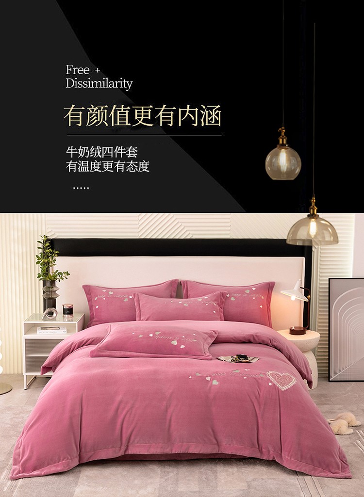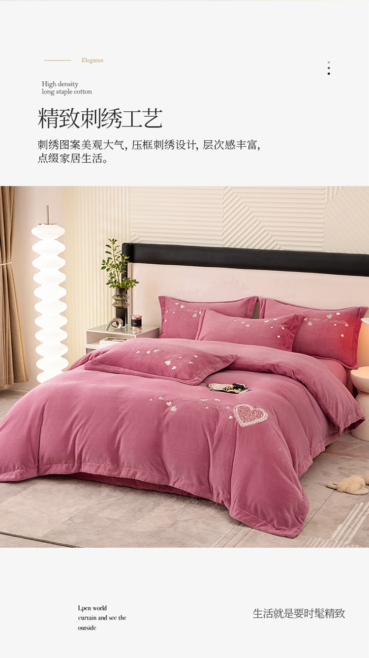 绒博士新款牛奶绒刺绣压线款四件套-温暖爱心 温暖爱心-豆沙