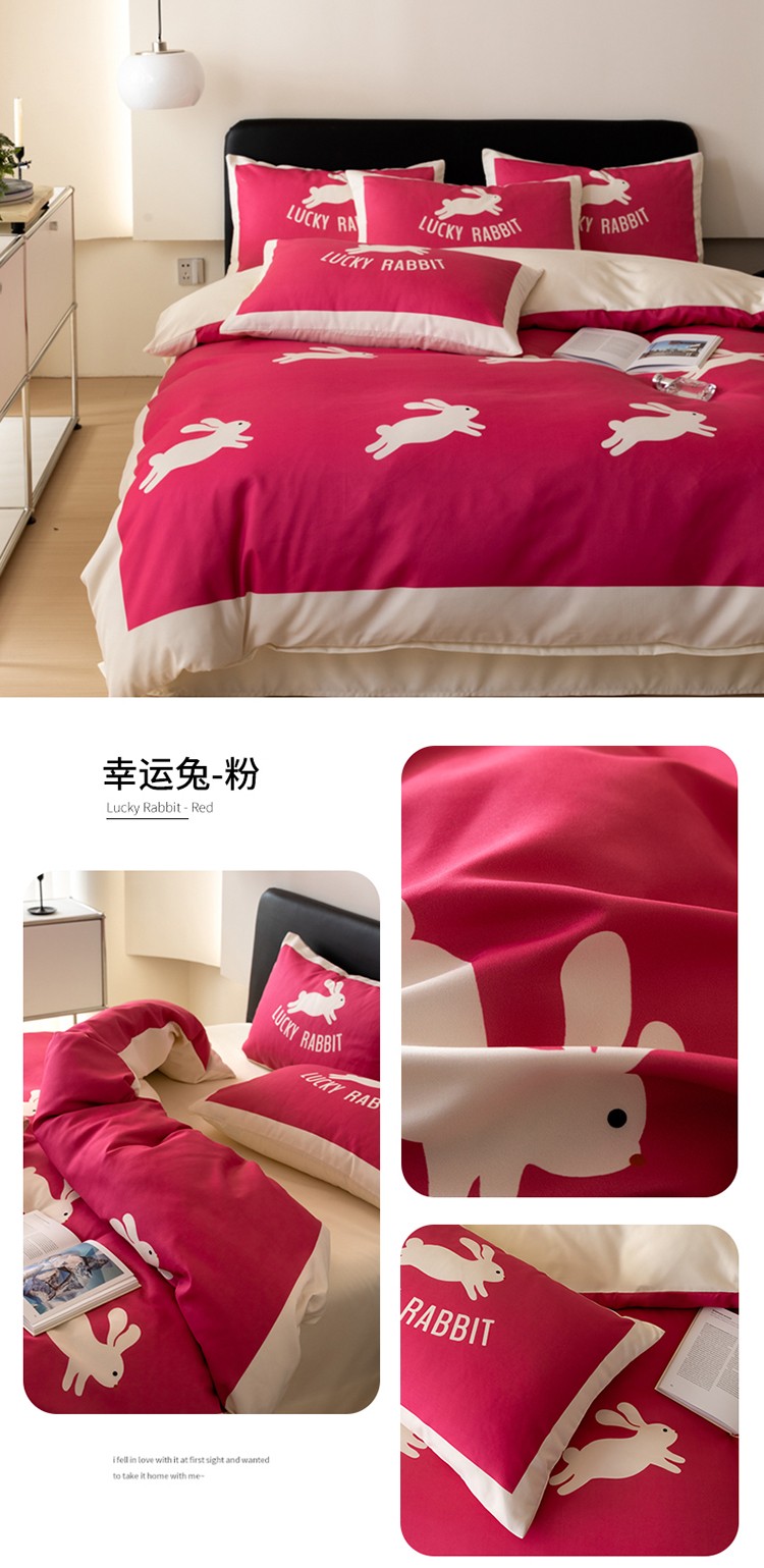 商品名称:色鬼布艺 2023新款真丝棉数码印花床单床笠款冰丝四件套网红兔红色婚庆
