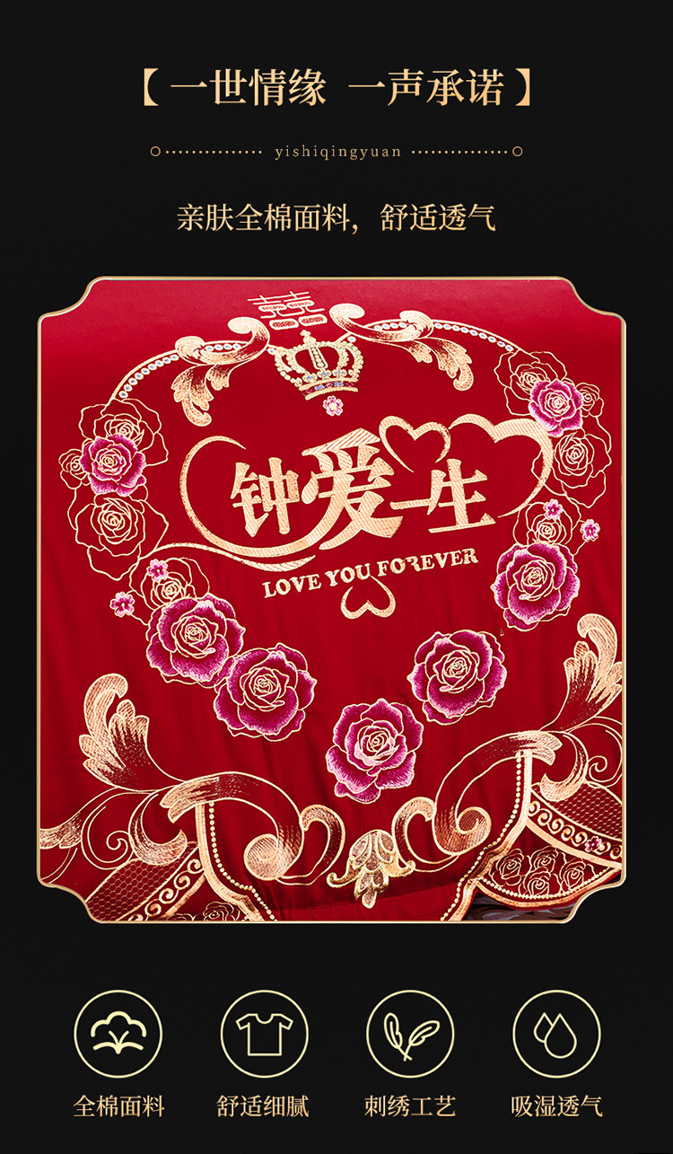 商品名称:慕她婚庆四件套大红色大花结婚全棉纯棉刺绣花多件套直播 情定一生