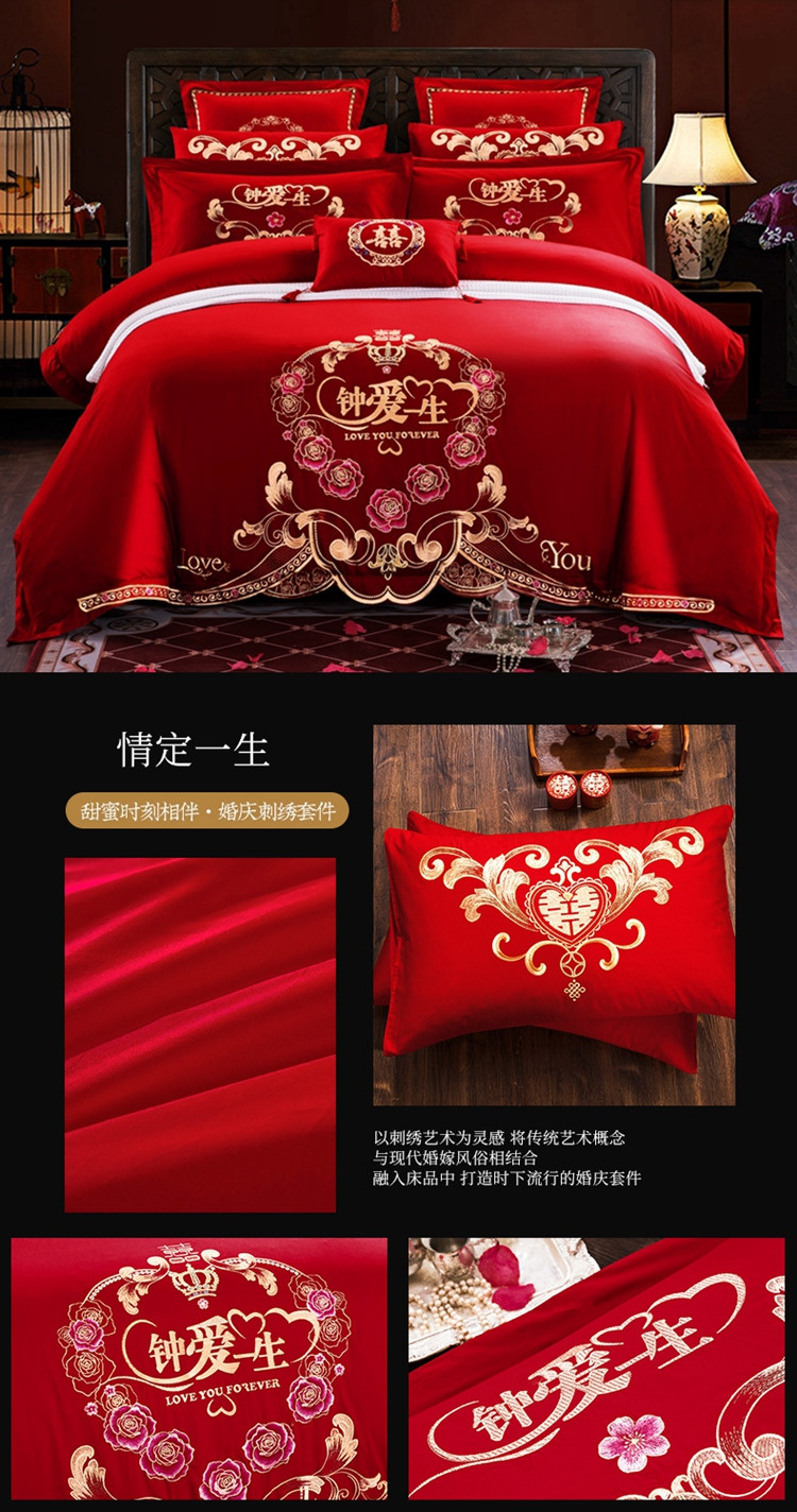 慕她婚庆四件套大红色大花结婚全棉纯棉刺绣花多件套直播 情定一生