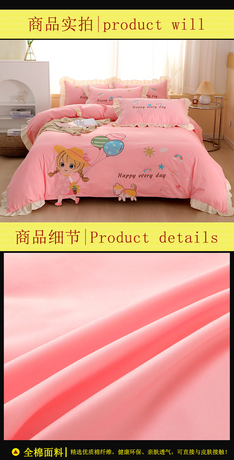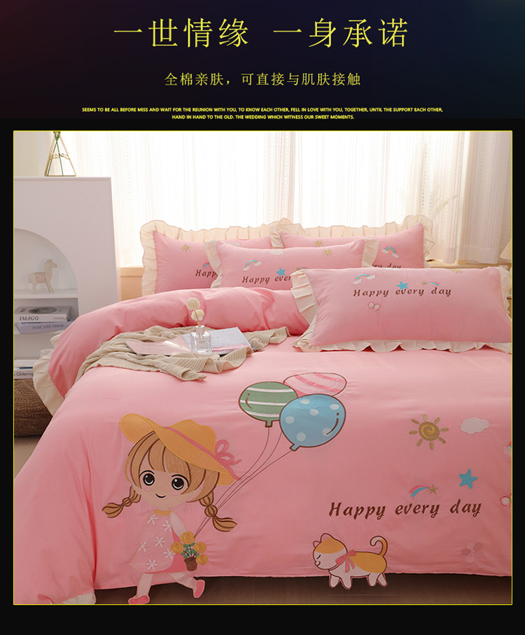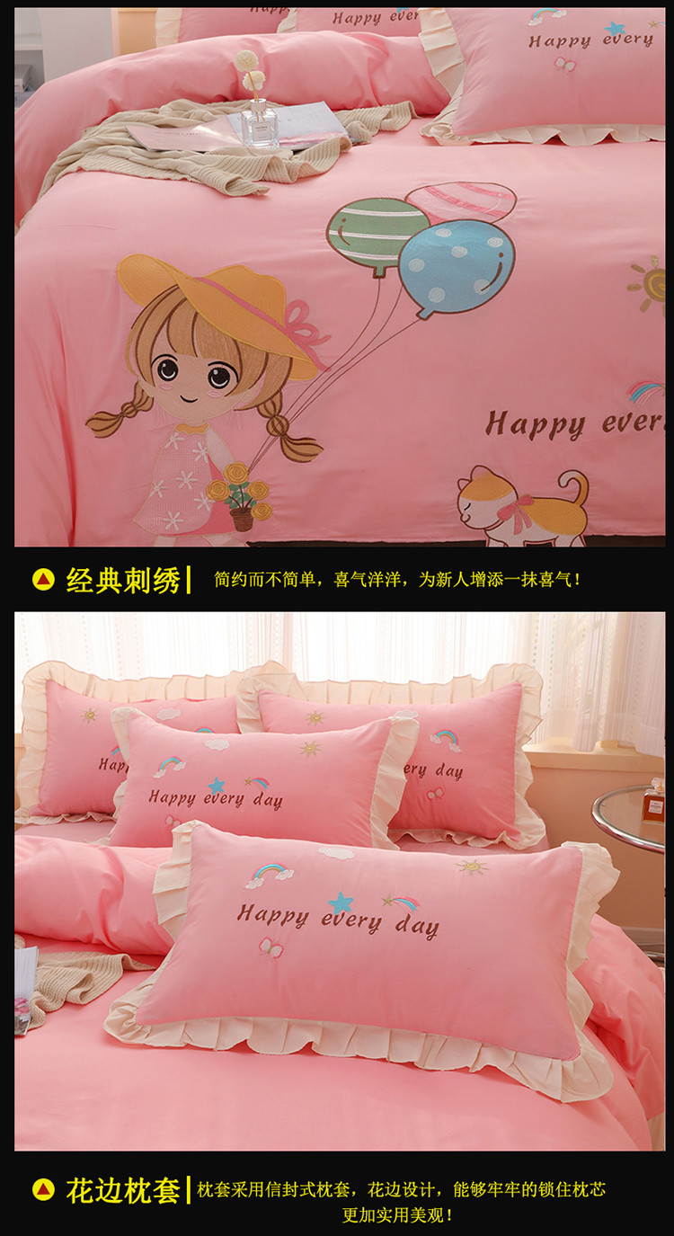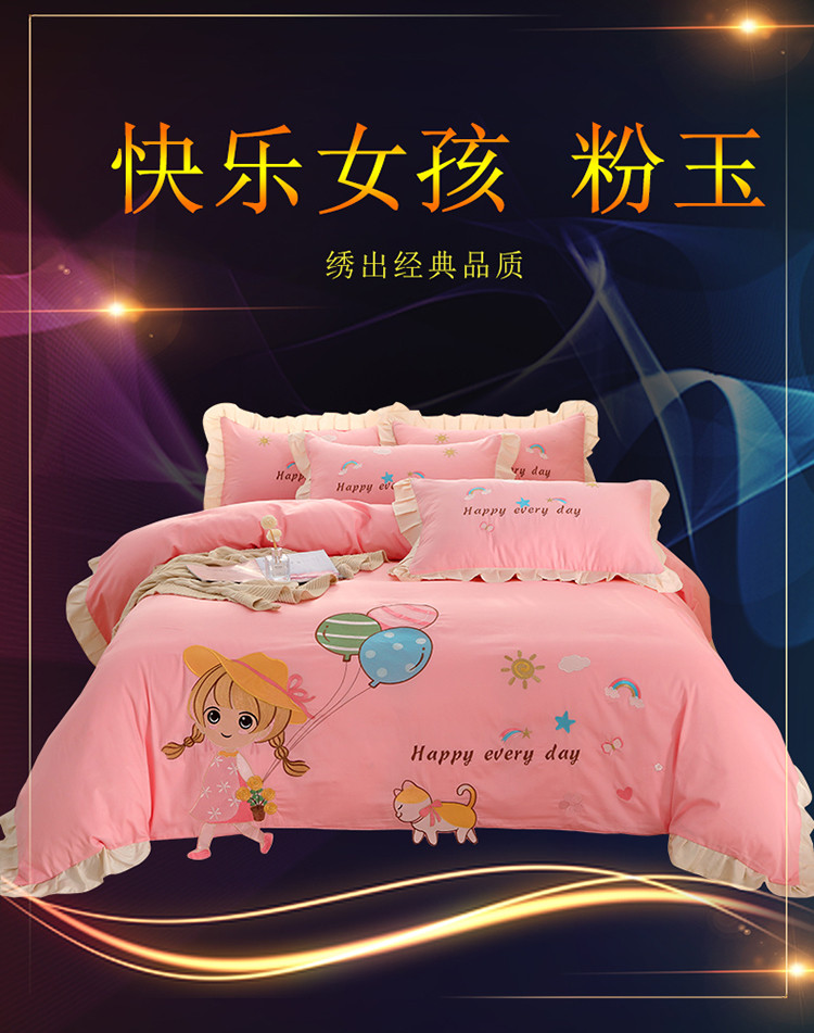 商品名称:慕她婚庆四件套大红色结婚全棉纯棉刺绣花多件套直播 快乐女孩粉玉