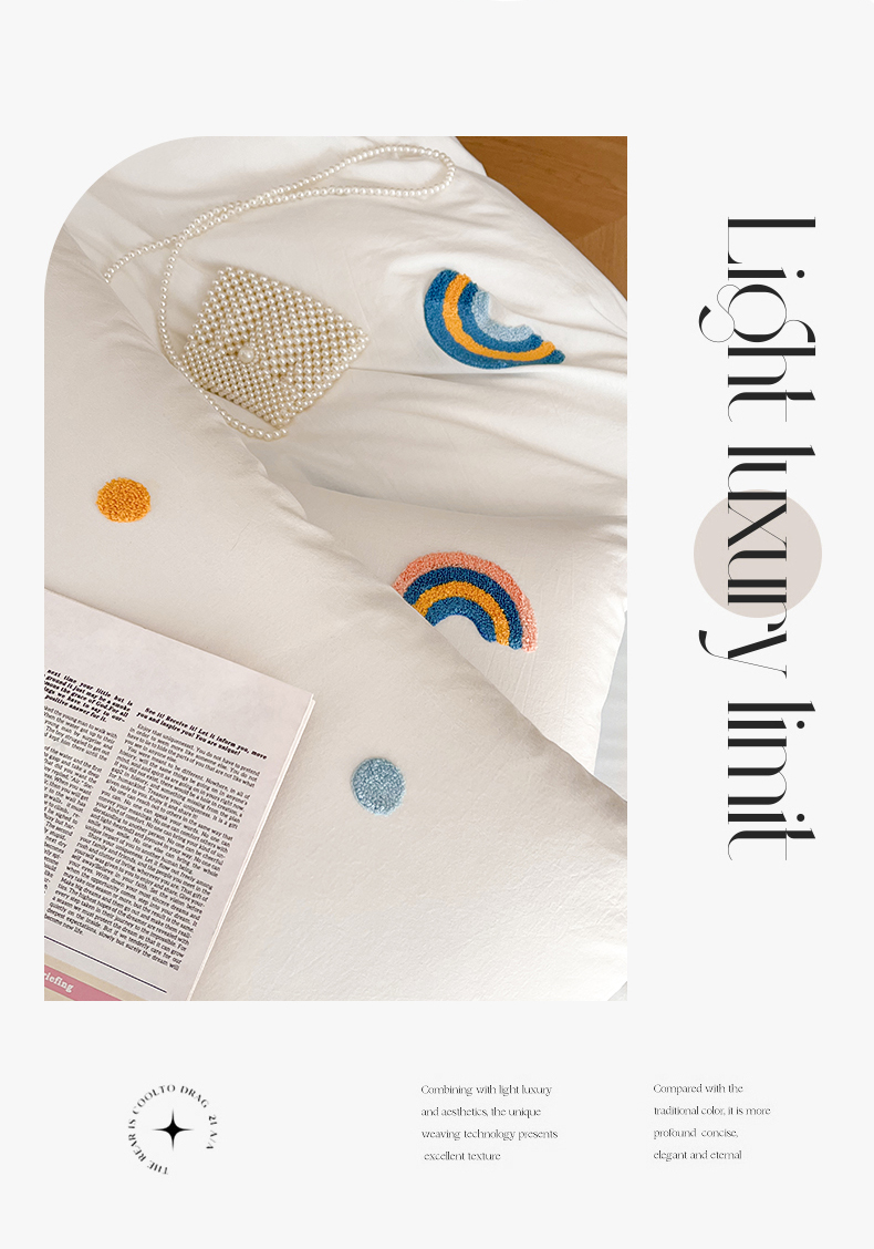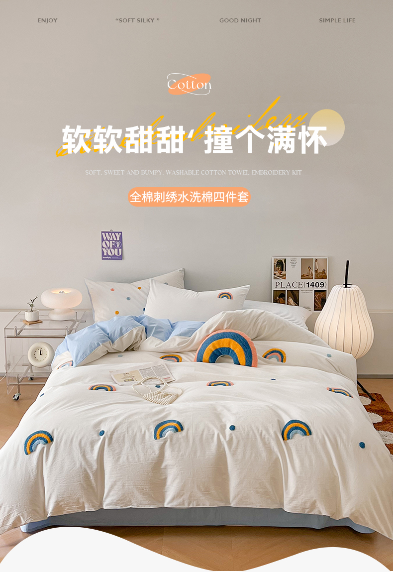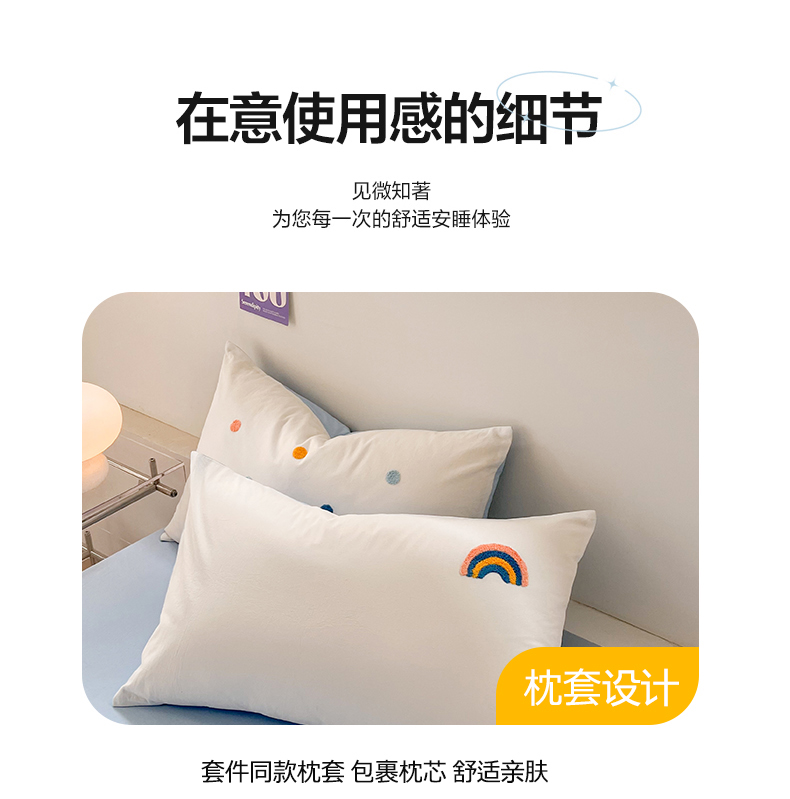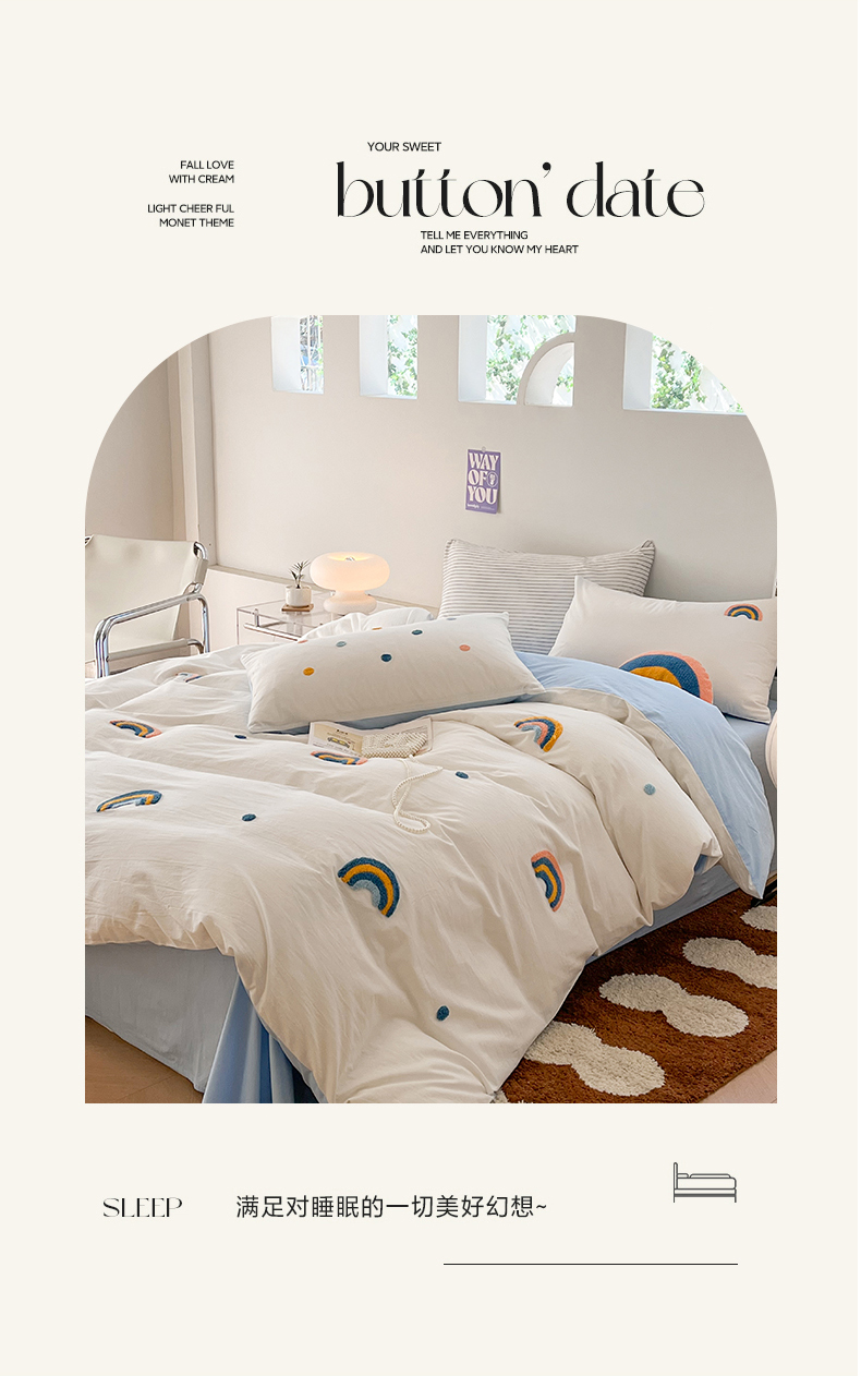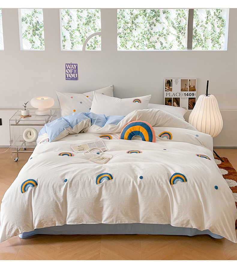 当前位置: 91家纺网 > 商品网购 > 床品套件 > 四件套 > 水洗棉四件套 > 慕尚家纺 2025新款全棉水洗棉毛巾绣四件套 彩虹-白蓝