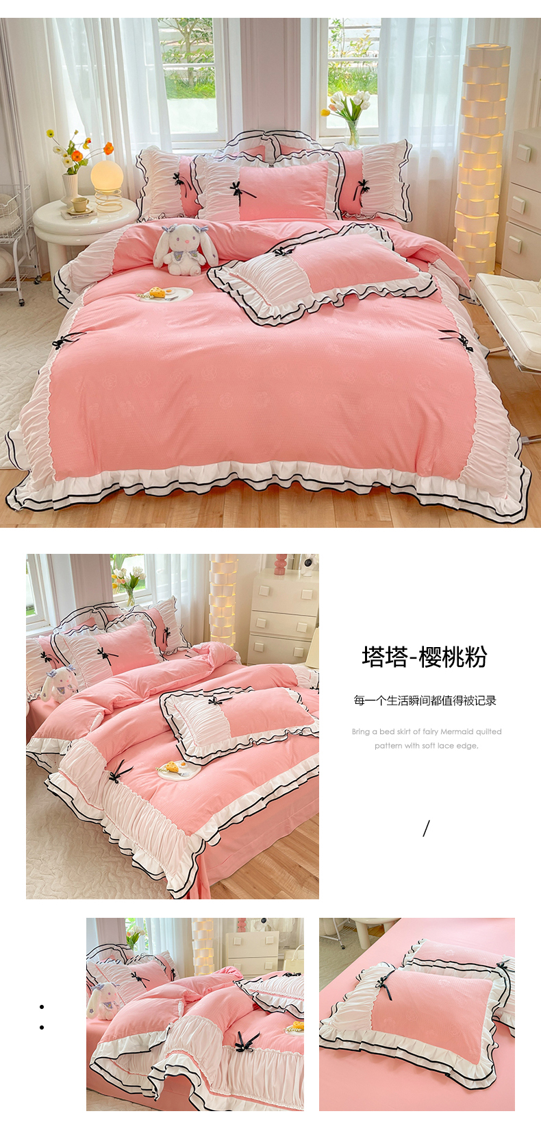 商品名称:逸尚阁 2023新款高支密水洗磨毛花边四件套-塔塔 塔塔-樱桃粉
