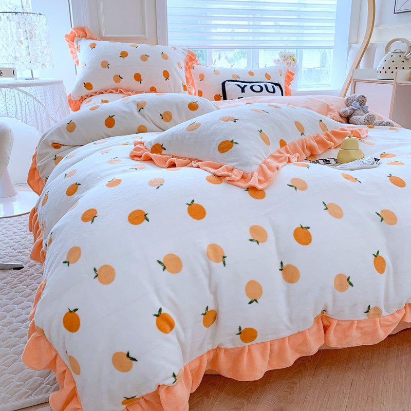 商品名称:吾欢心 2024新款韩版花边牛奶绒四件套 小柑橘