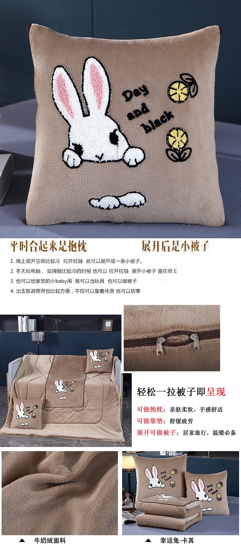 商品名称:伊可爱抱枕被 2023新款牛奶绒绣花抱枕被 幸运兔-卡其