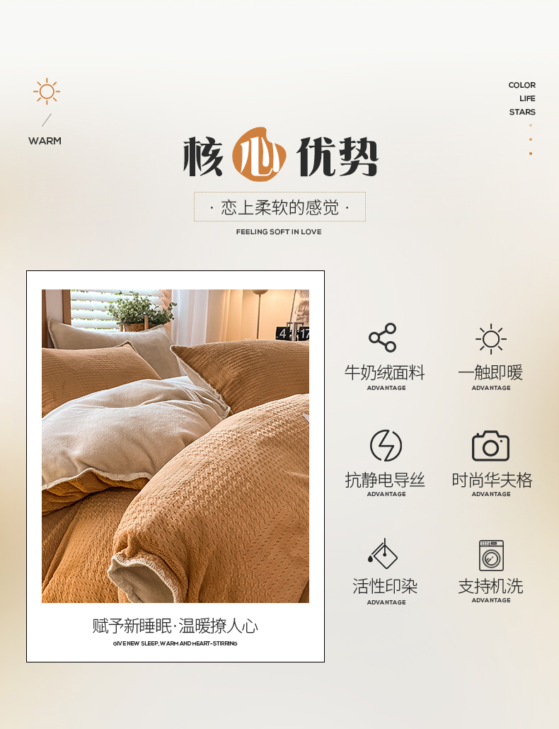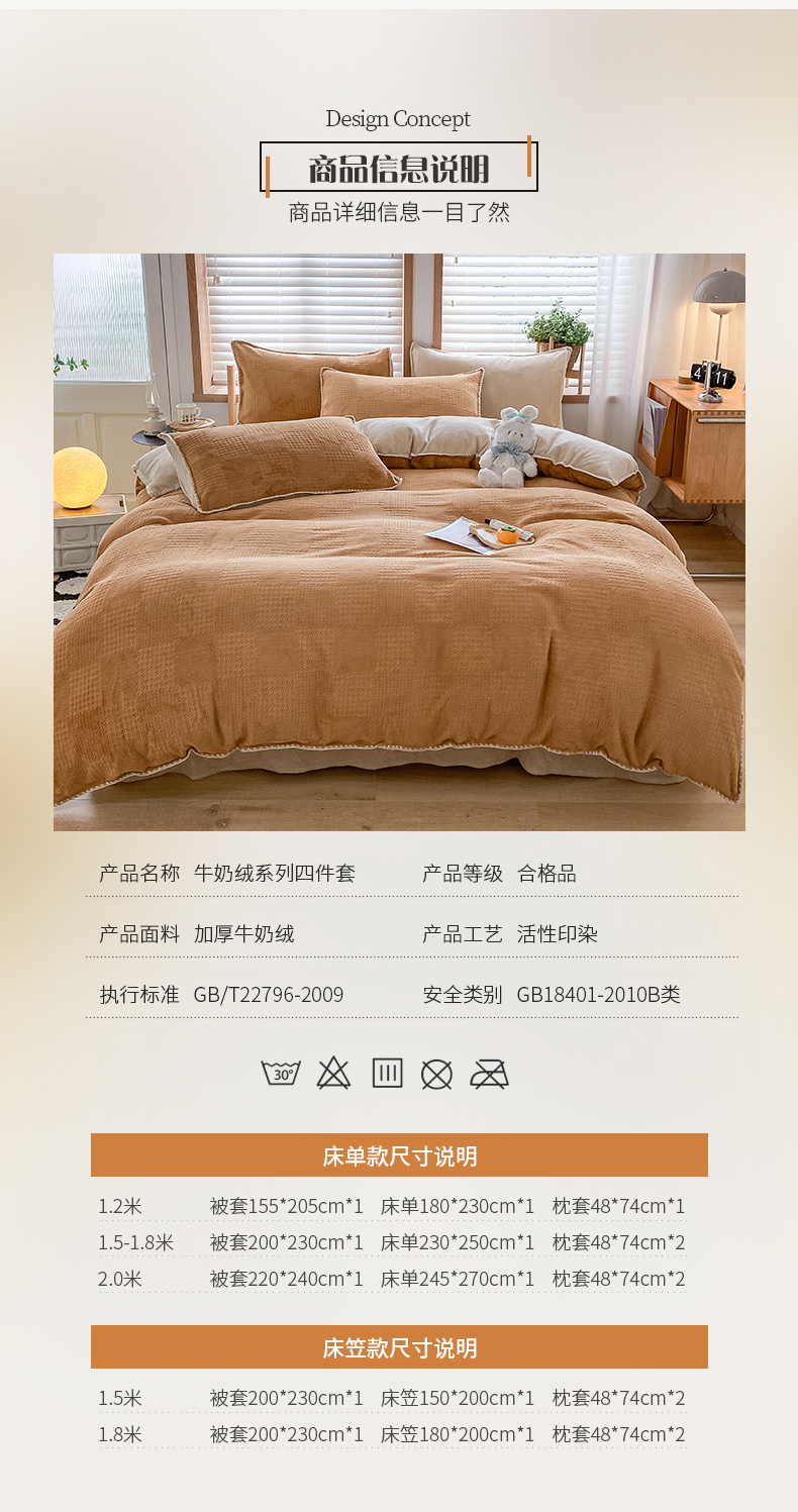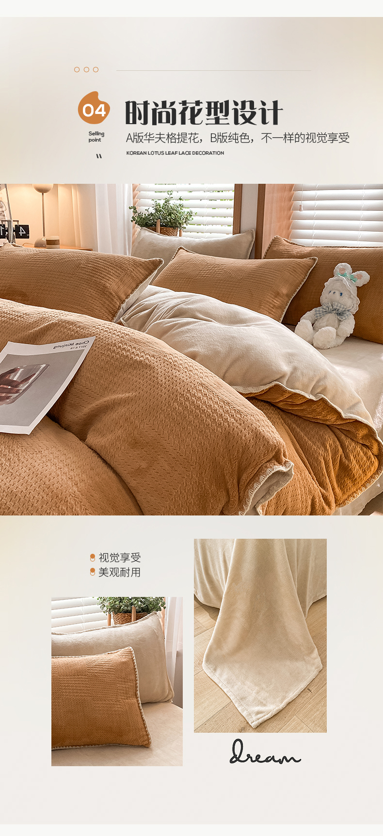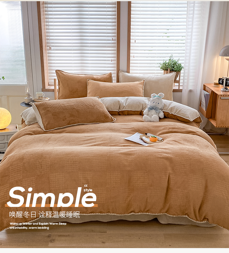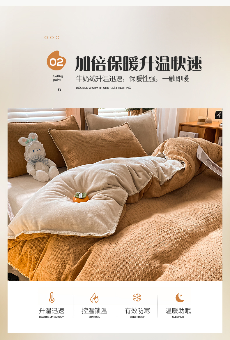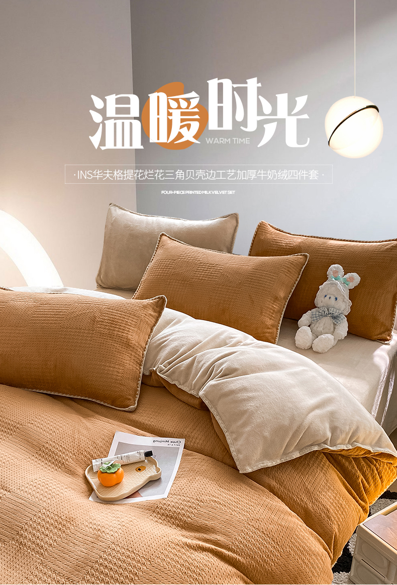 桃子家居 2023新款A类无印ins华夫格提花烂花雕花剪花三角贝壳边工艺加厚牛奶绒四件套 绒华夫格-爱橙