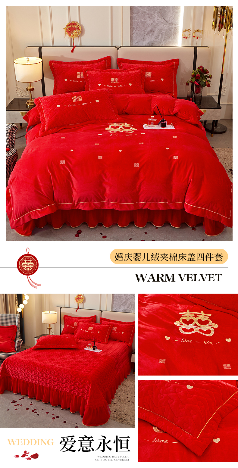 当前位置: 91家纺网 > 商品网购 > 床品套件 > 四件套 > 婚庆四件套 > 宜凡家纺 2023秋冬新品婴儿绒婚庆床盖四件套 爱意永恒