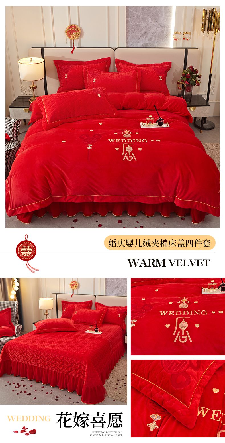 当前位置: 91家纺网 > 商品网购 > 床品套件 > 四件套 > 婚庆四件套 > 宜凡家纺 2023秋冬新品婴儿绒婚庆床盖四件套 花嫁喜愿