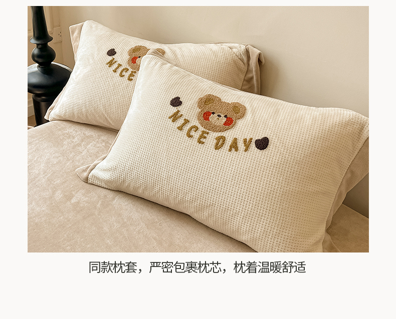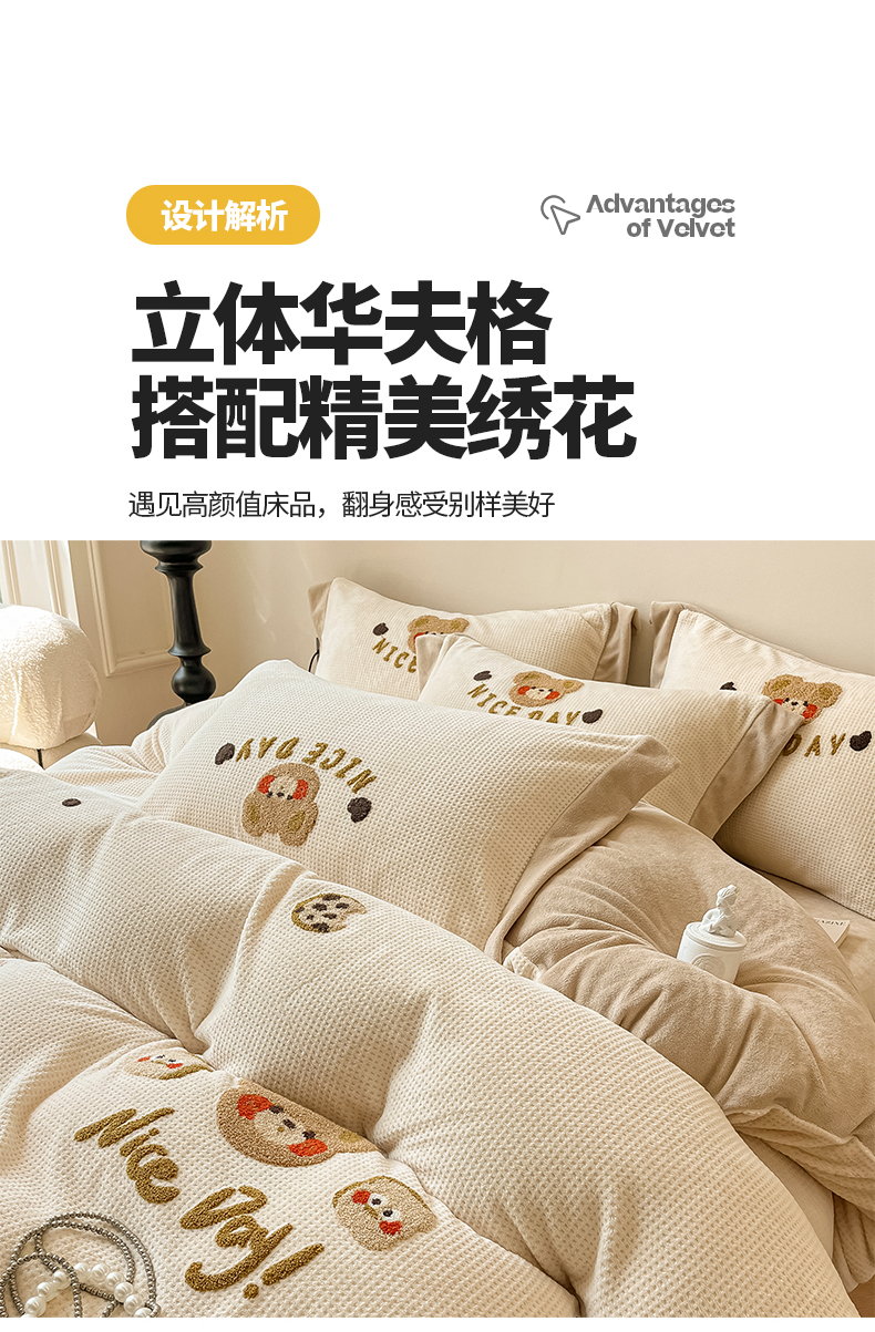 商品名称:懒猫家纺 2024新款【华夫格绣花】牛奶绒四件套 面包熊