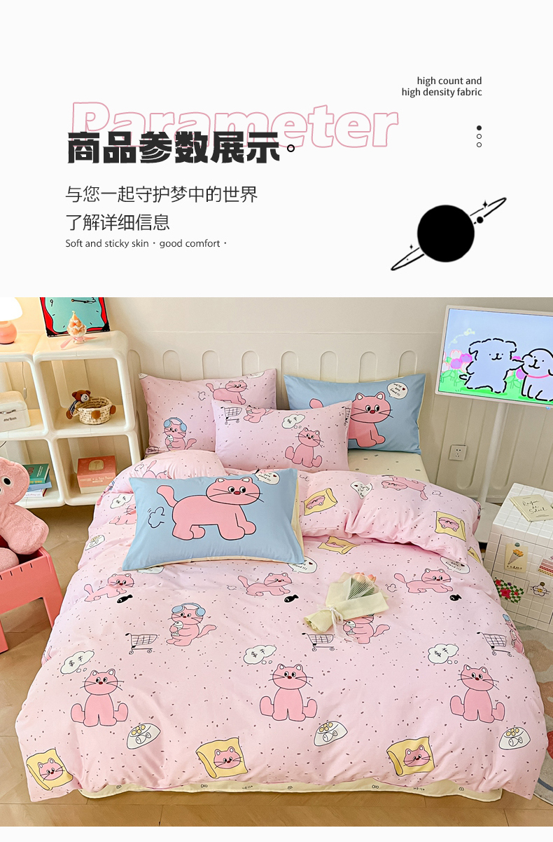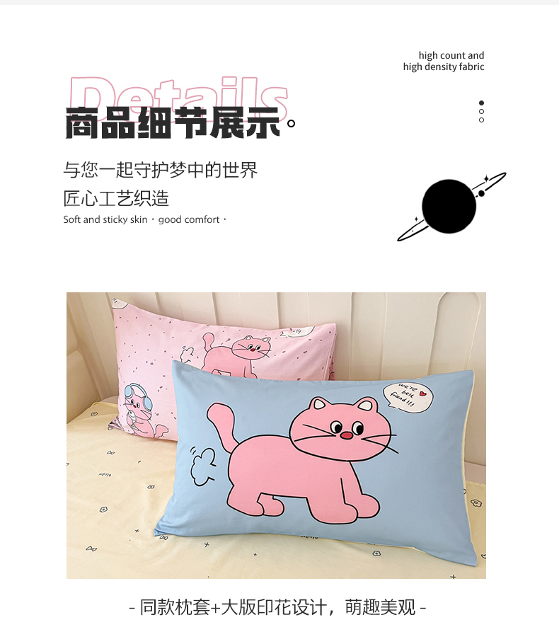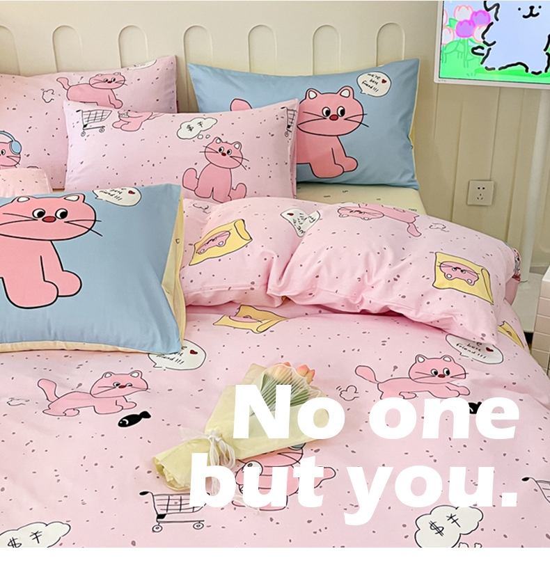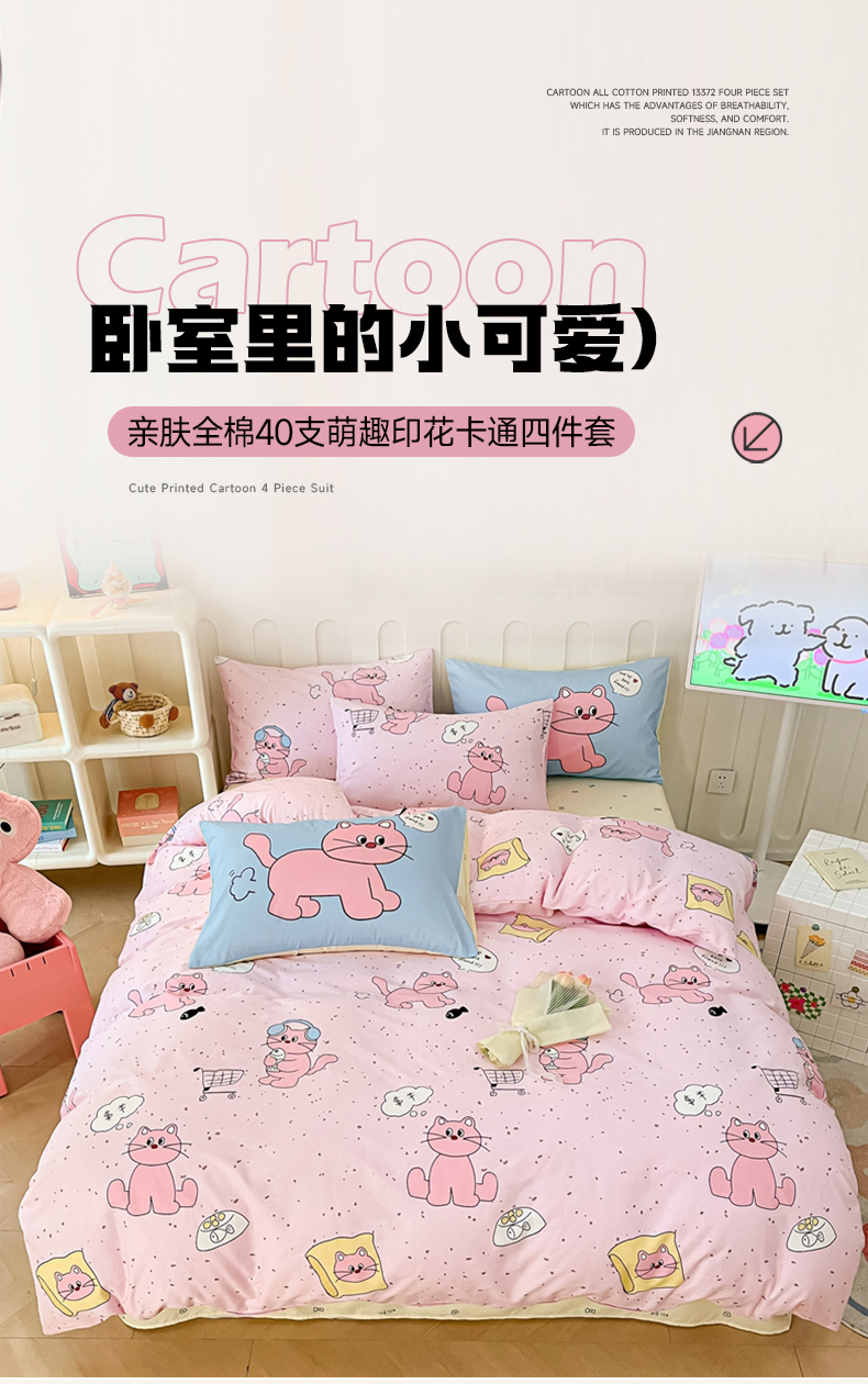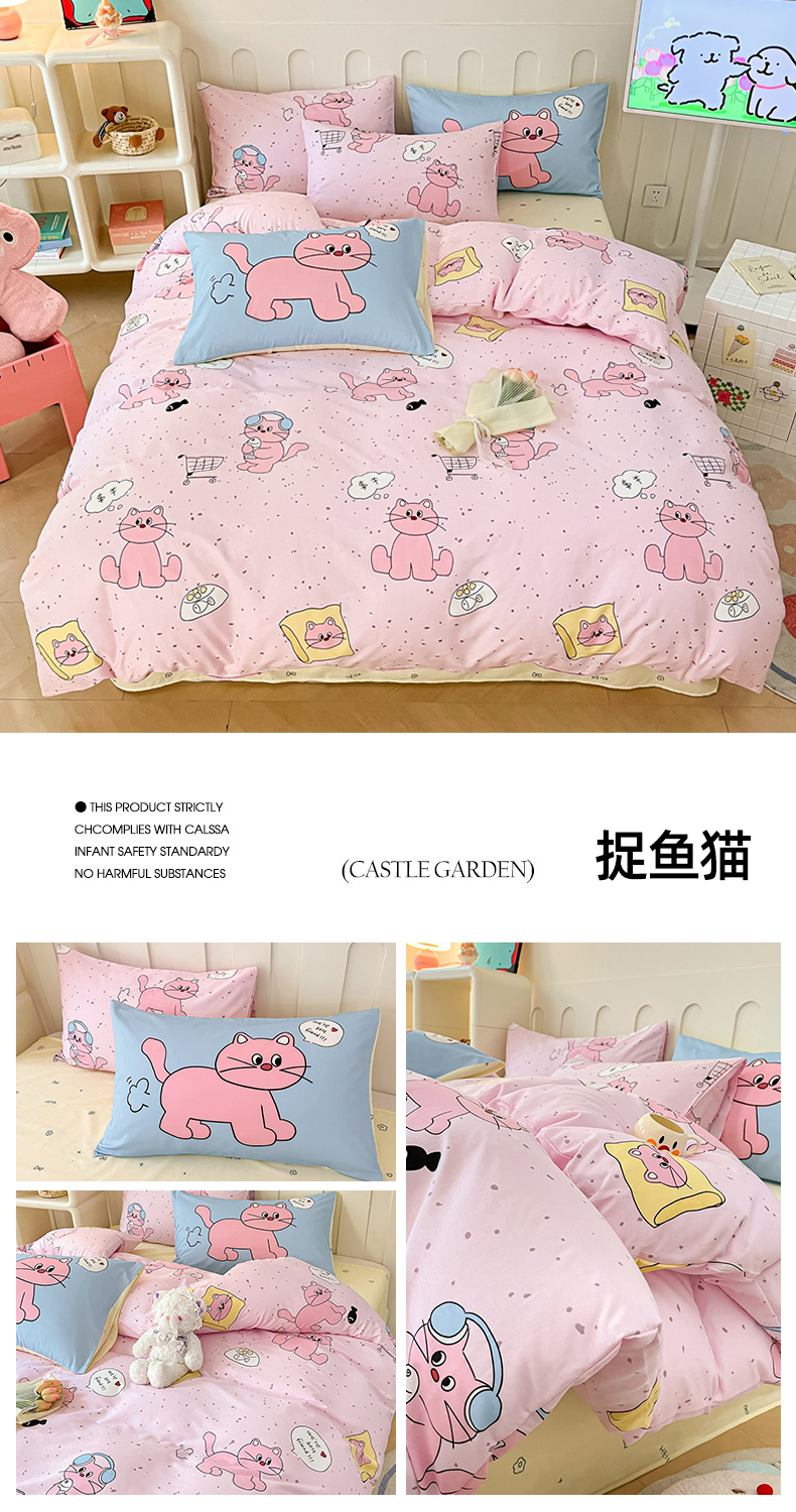 商品名称:呗旺鹿 2024新款舒适亲肤全棉40支大平网定位枕萌趣印花卡通四件套 捉鱼猫
