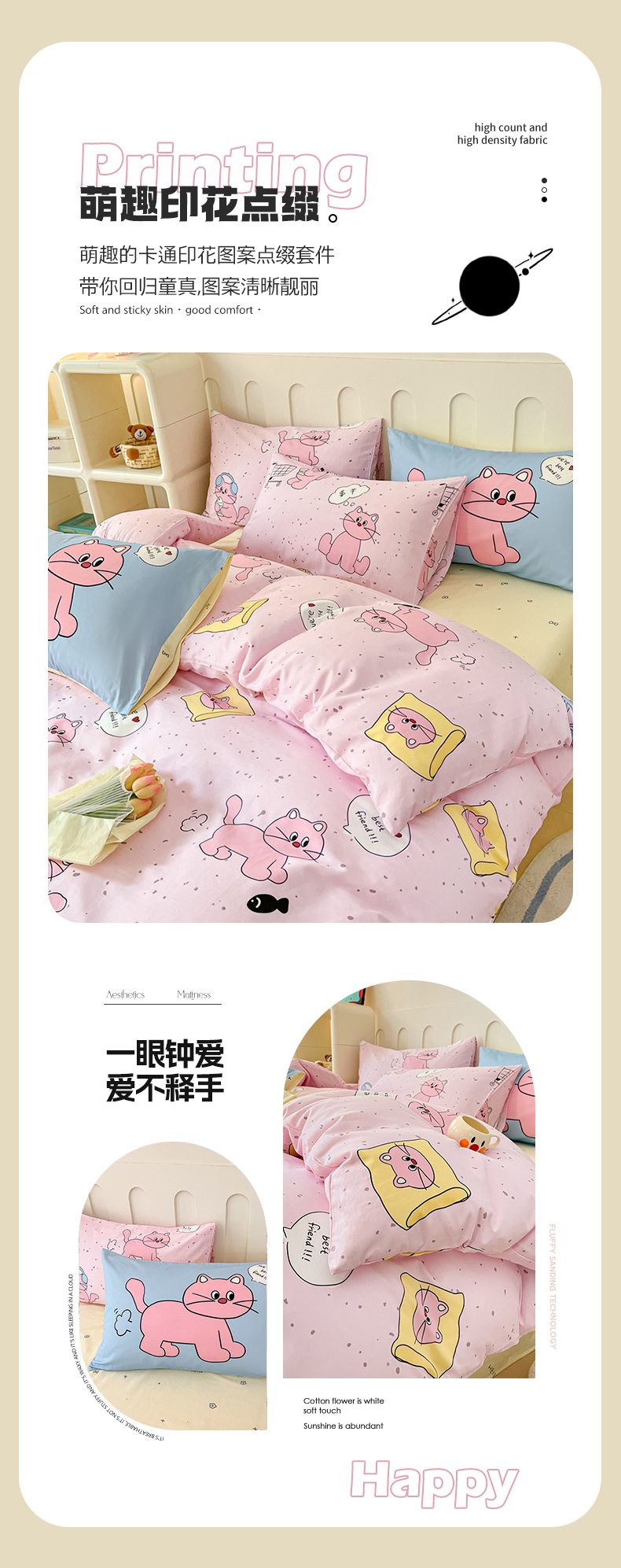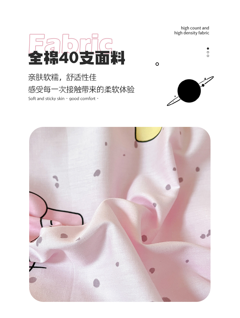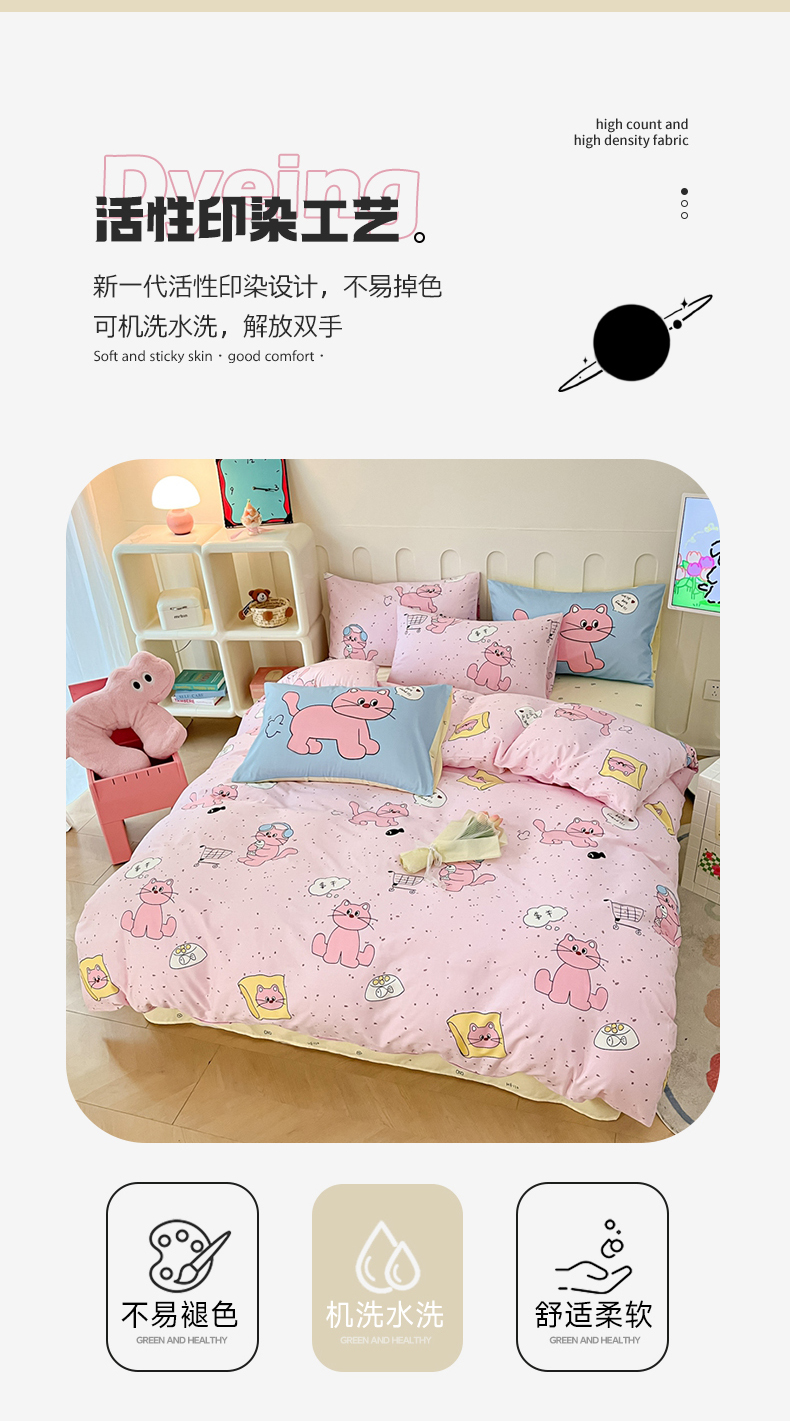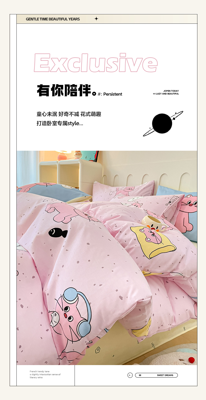 商品名称:呗旺鹿 2024新款舒适亲肤全棉40支大平网定位枕萌趣印花卡通四件套 捉鱼猫