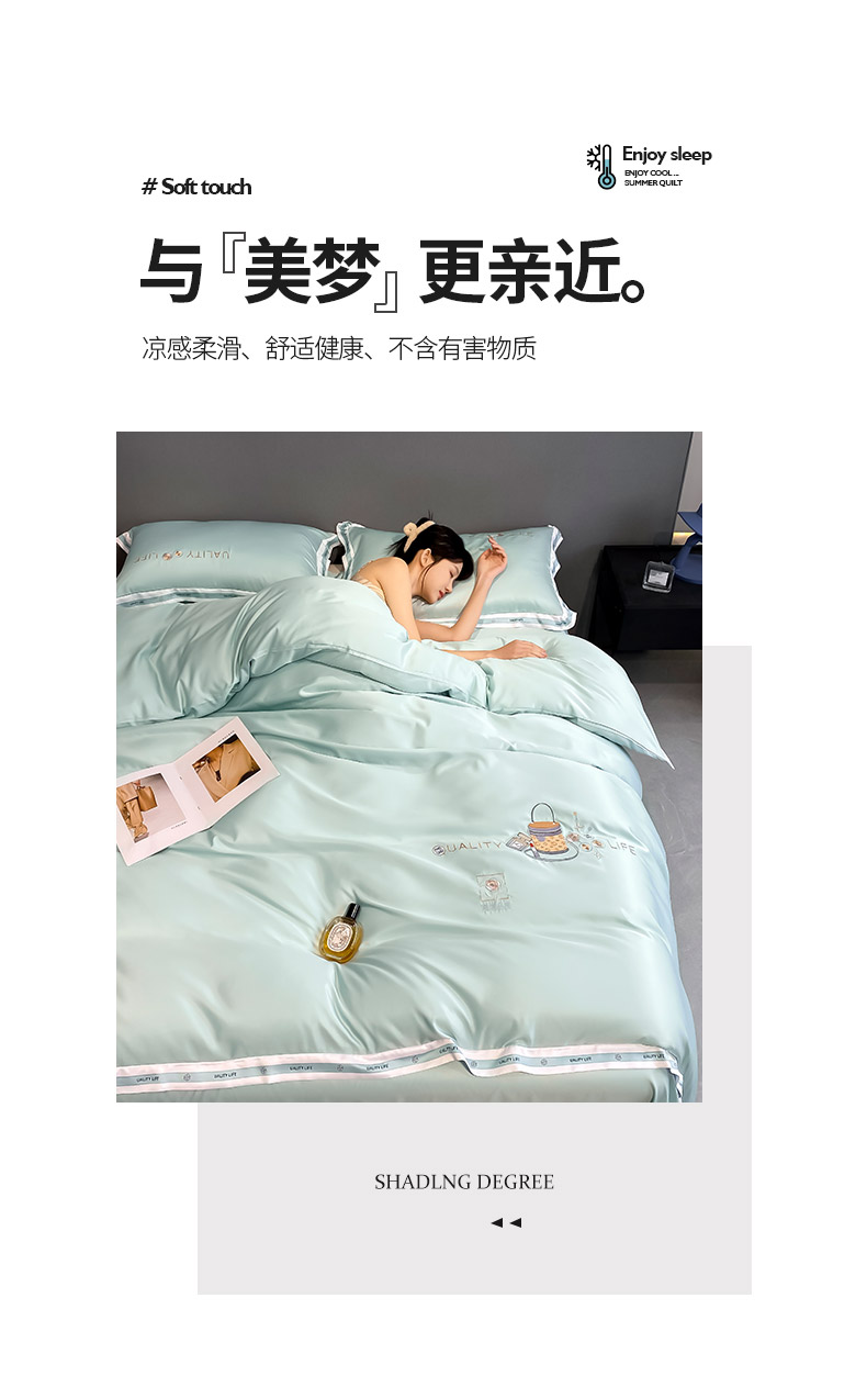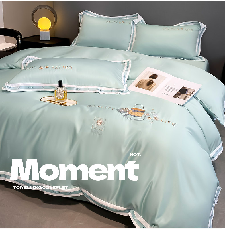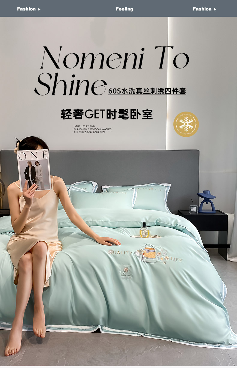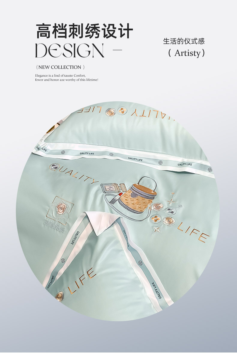 欧冠家纺 2024新款大牌风60S水洗真丝刺绣床笠被套四件套香奈系列 香奈-白茶绿