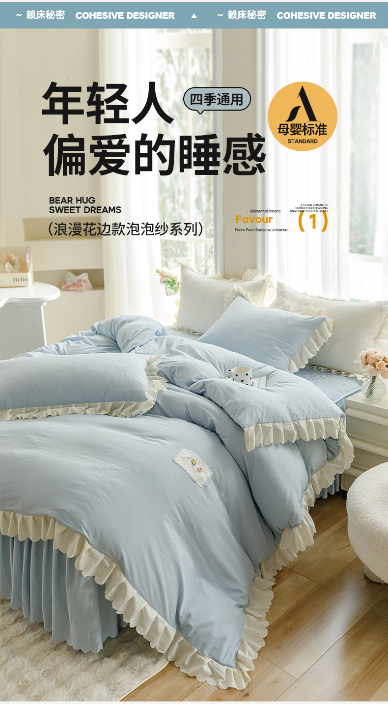 • 91家纺网 家纺一手货源 找家纺 绒世界 绒世界 2025新款四季款夹棉泡泡纱床裙床笠被套四件套 慕蓝