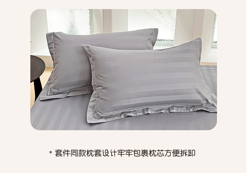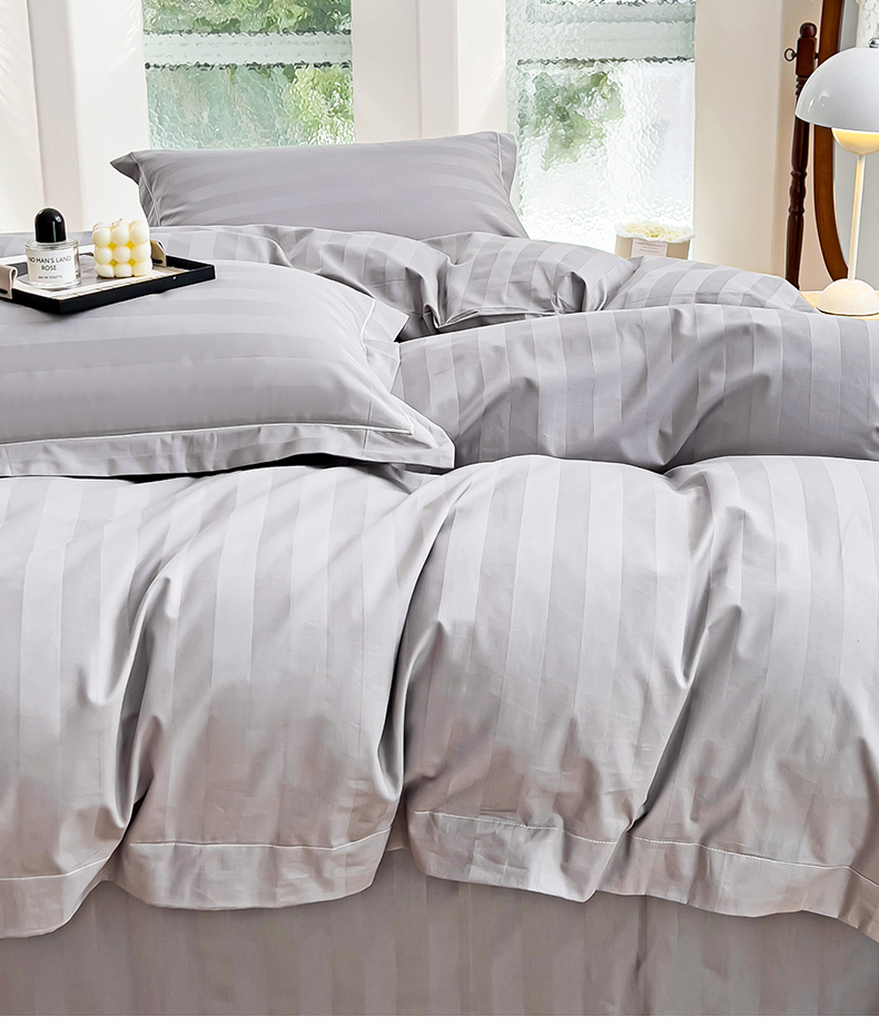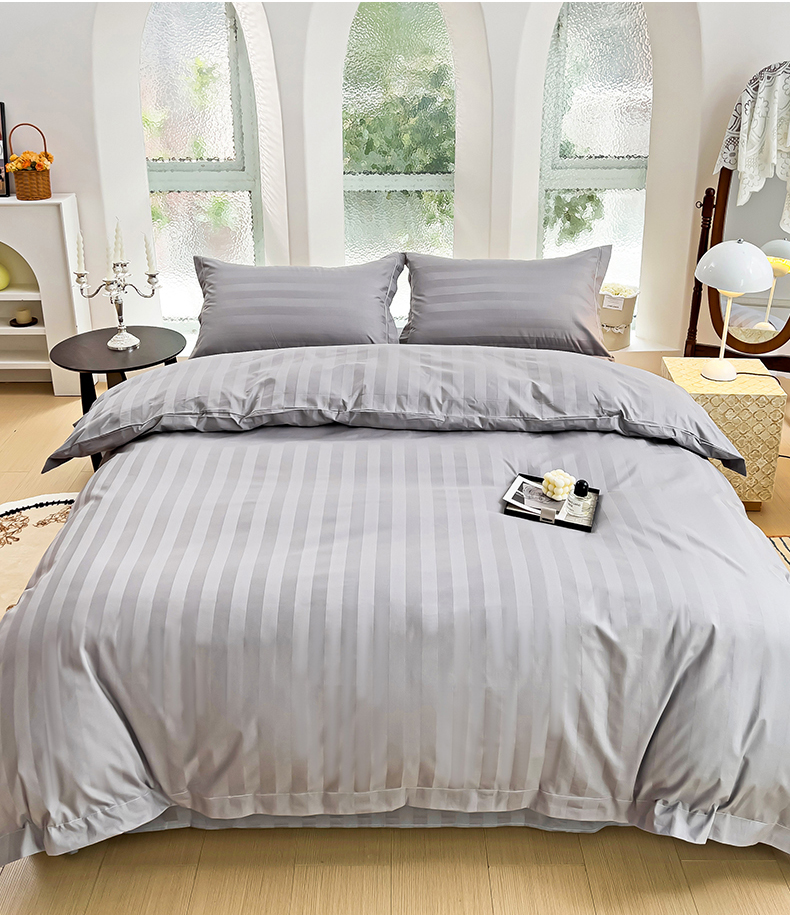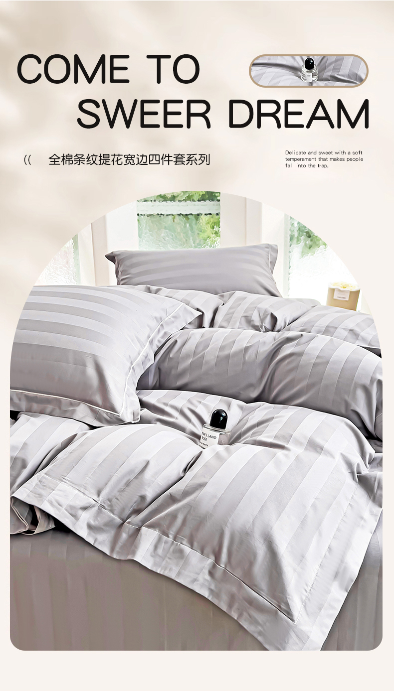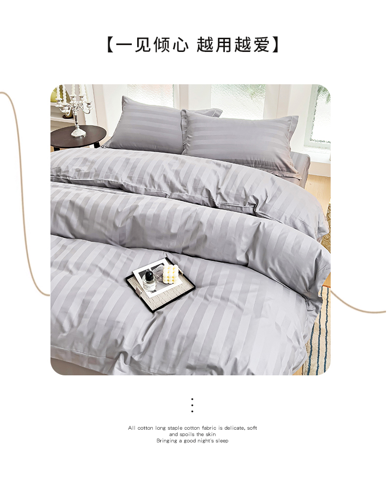品乐家纺 2024新款60支长绒棉条纹宽边四件套 宽边条纹灰