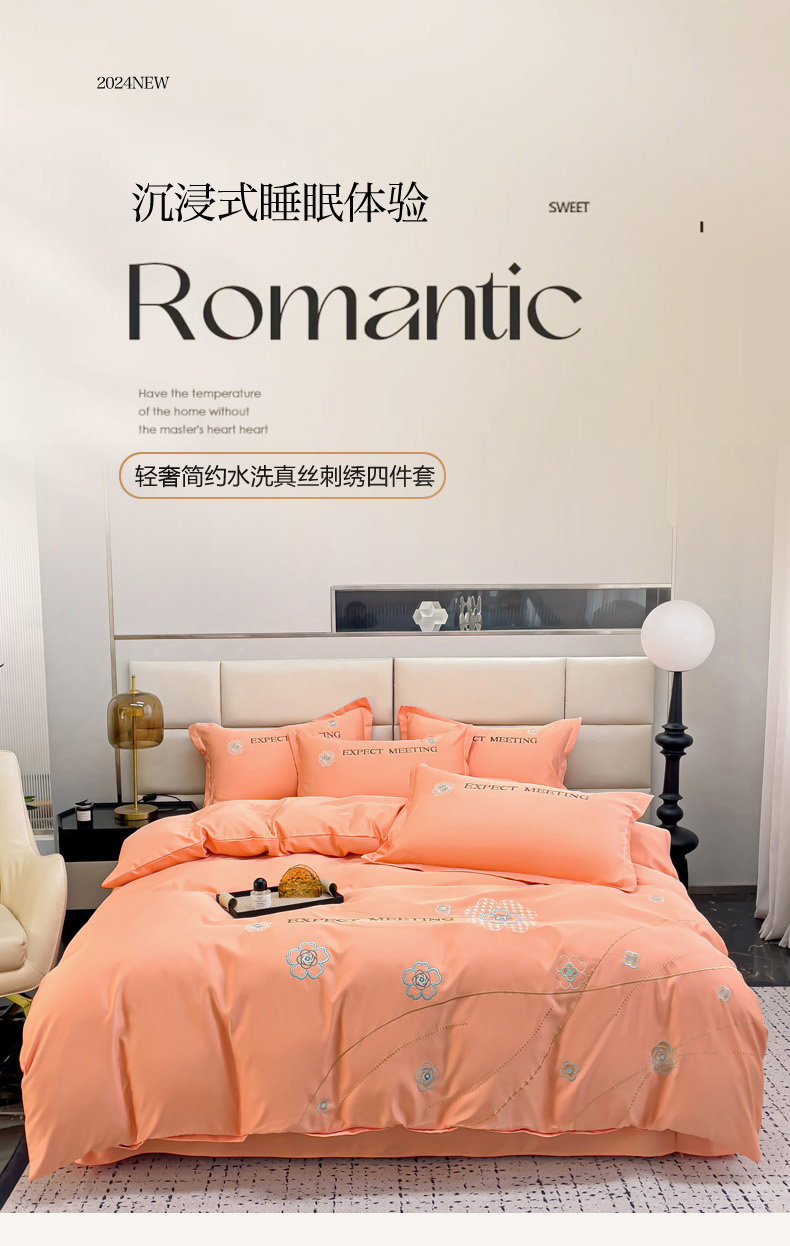 恋佳居 2025新款水洗真丝刺绣四件套 花漾-橘色