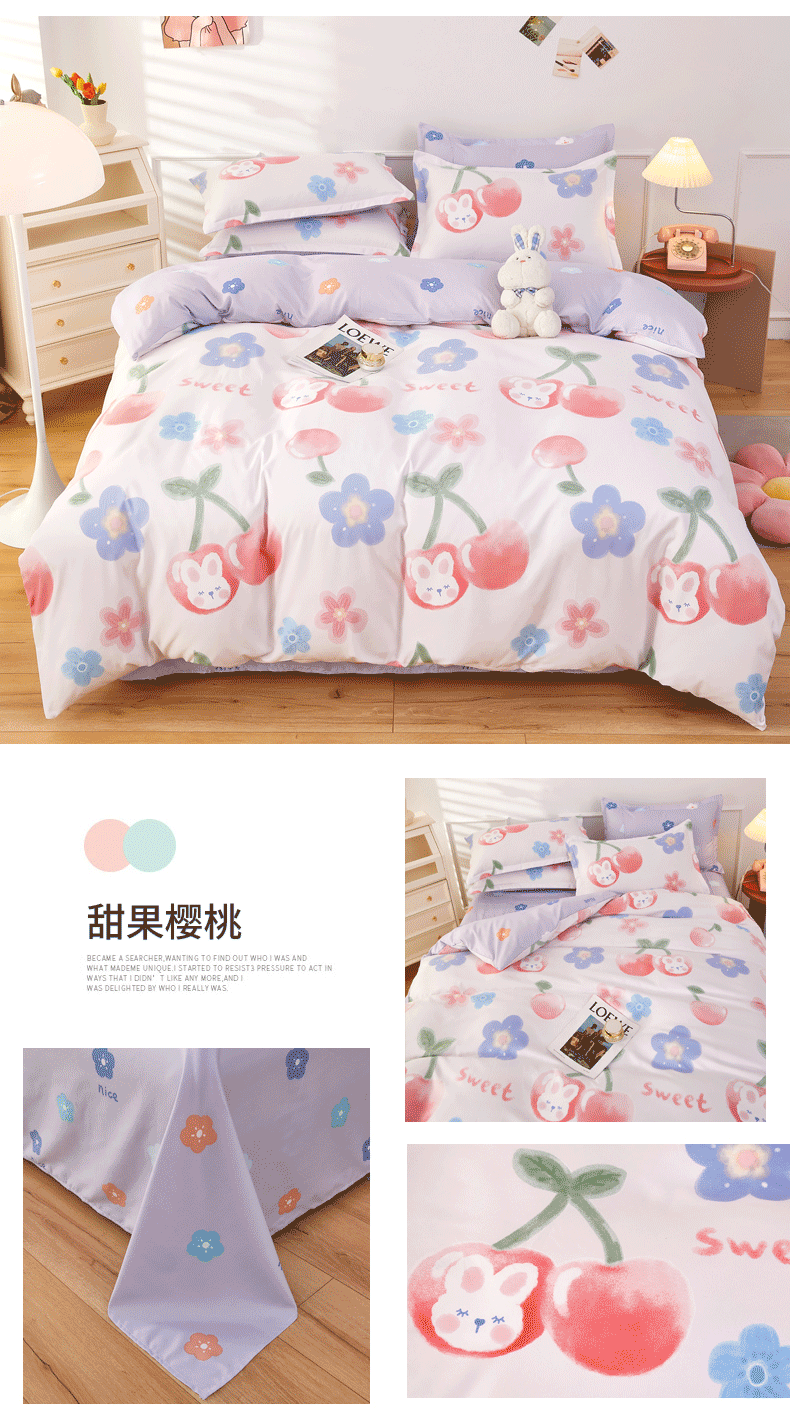 当前位置: 91家纺网 > 商品网购 > 床品套件 > 四件套 > 普通磨毛四件套 > 美宜家 2025新款140克小清新磨毛印花学生四件套 甜果樱桃