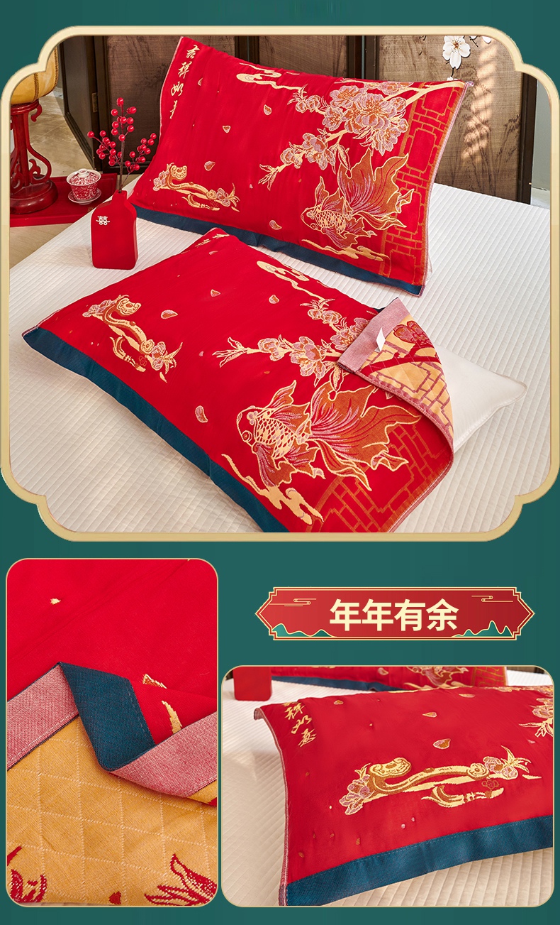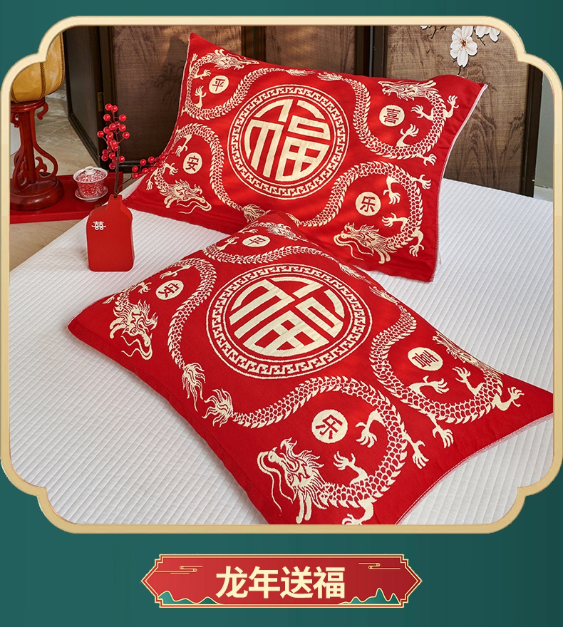 商品名称:美宜家 2025新款龙年全棉国潮大红多层纱布枕巾情侣婚庆枕巾52*78一对装 龙年送福一对