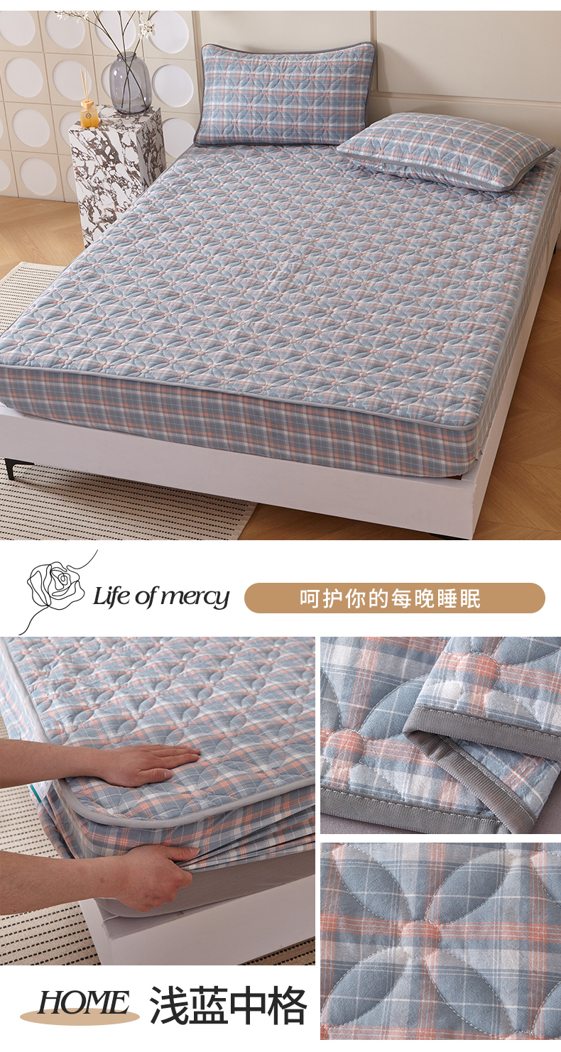 商品名称:杜先生 2024新款无印风水洗棉夹棉床笠 浅蓝中格