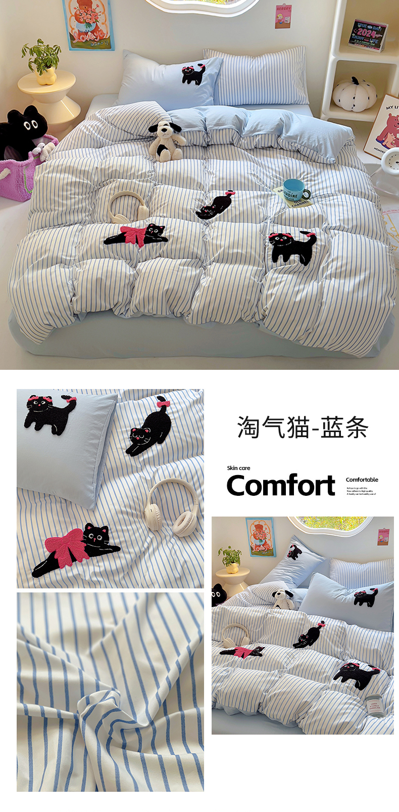 当前位置: 91家纺网 > 商品网购 > 床品套件 > 四件套 > 水洗棉四件套 > 易辰美 2024新款条纹水洗棉毛巾绣四件套(专版) 淘气猫-蓝条