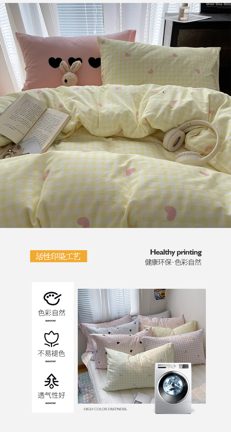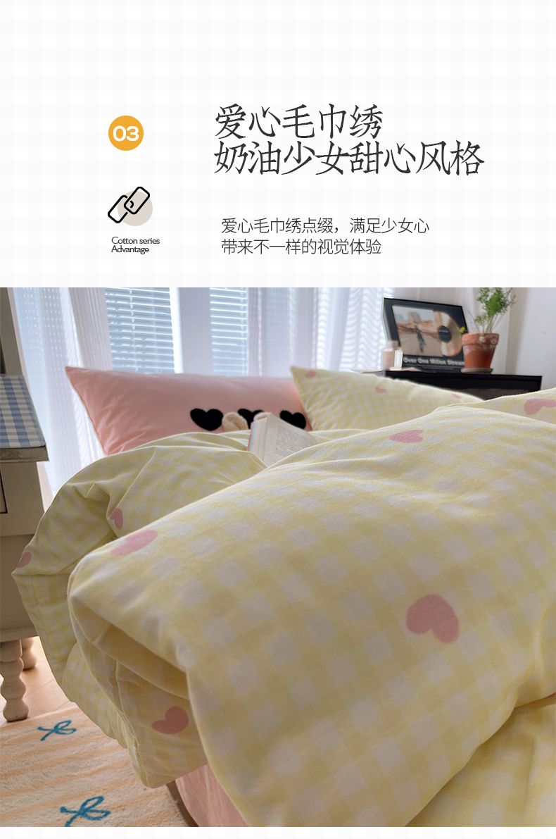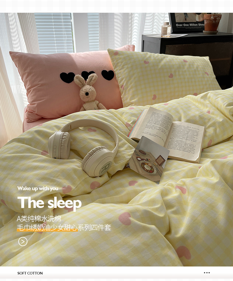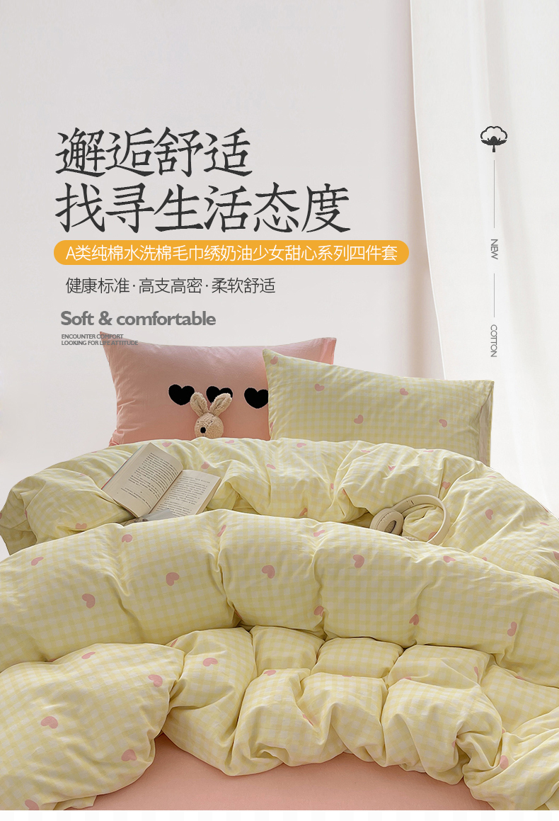 当前位置: 91家纺网 > 商品网购 > 床品套件 > 四件套 > 水洗棉四件套 > 桃子家居 2024新款A类纯棉水洗棉毛巾绣奶油少女甜心系列学生四件套 水洗棉-少女甜心黄粉+粉粉