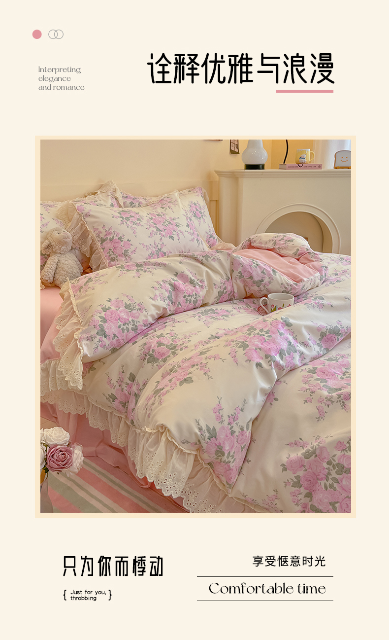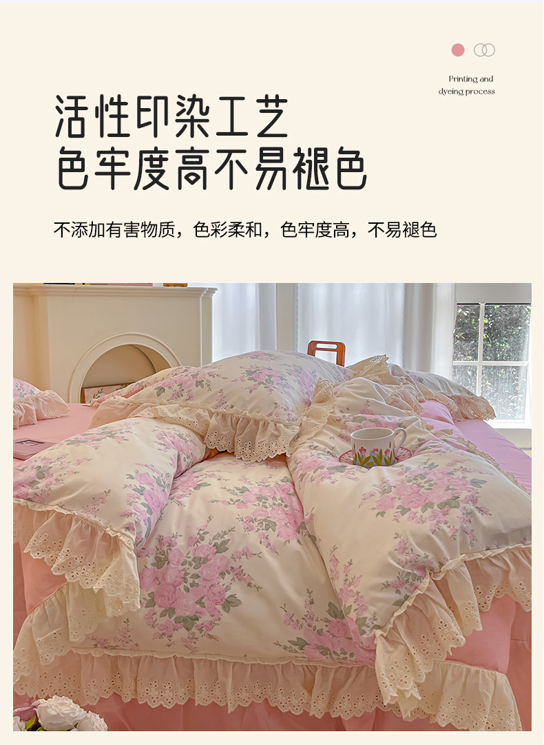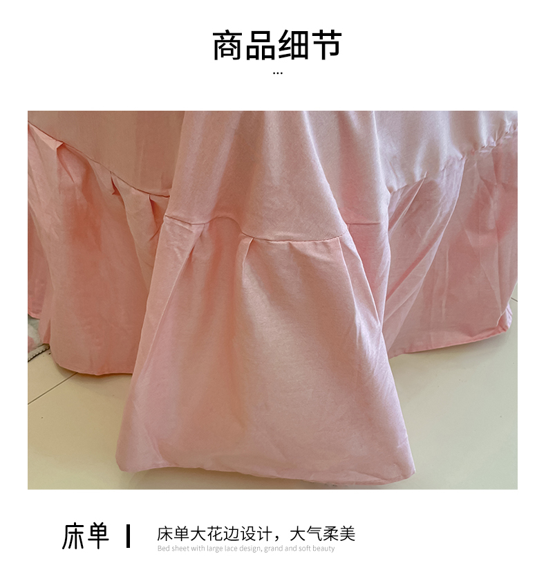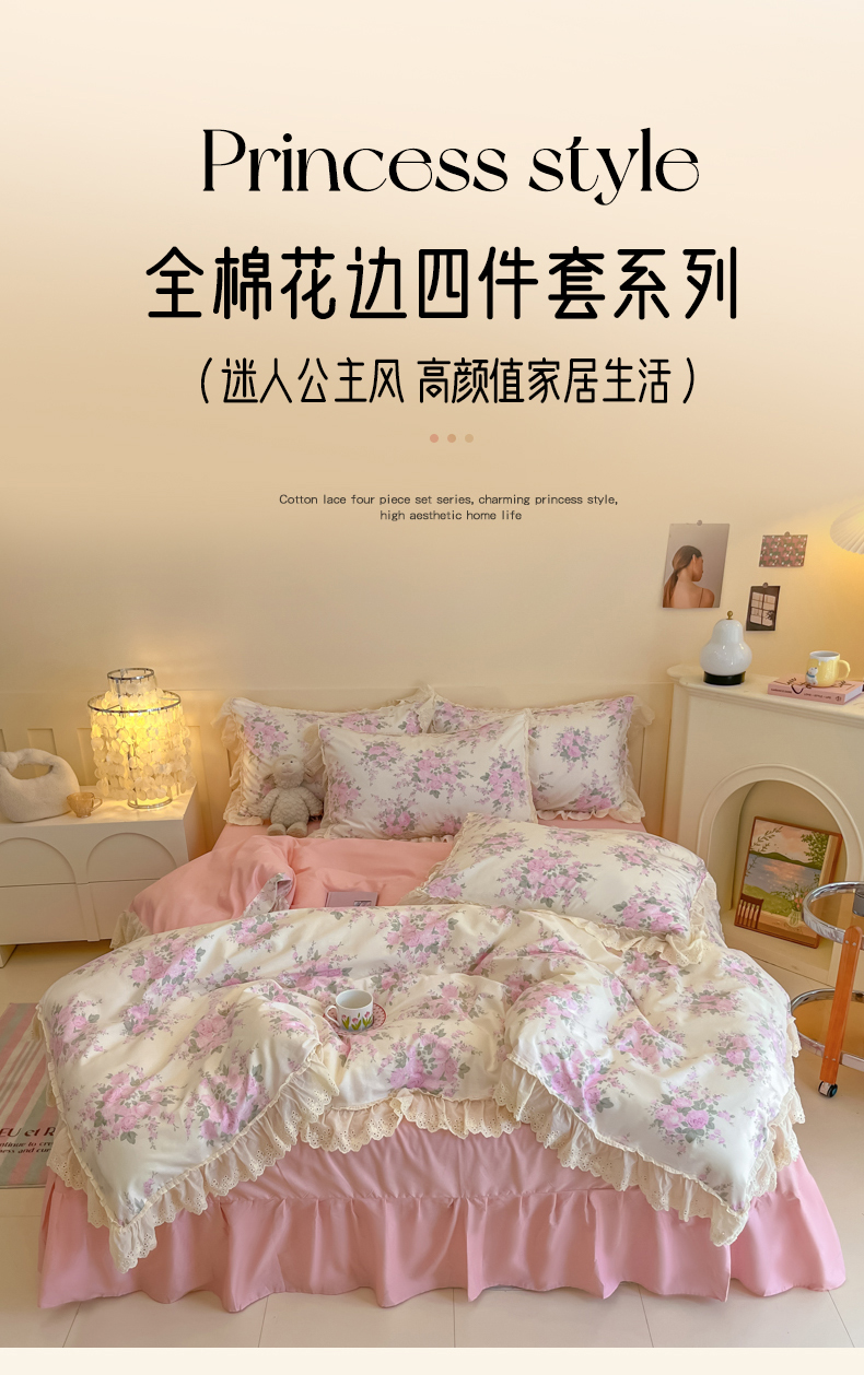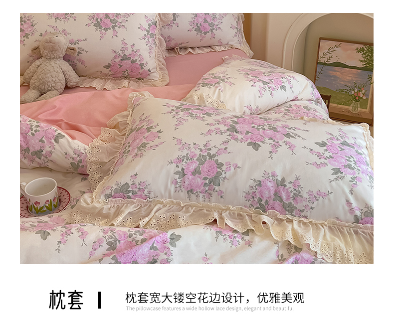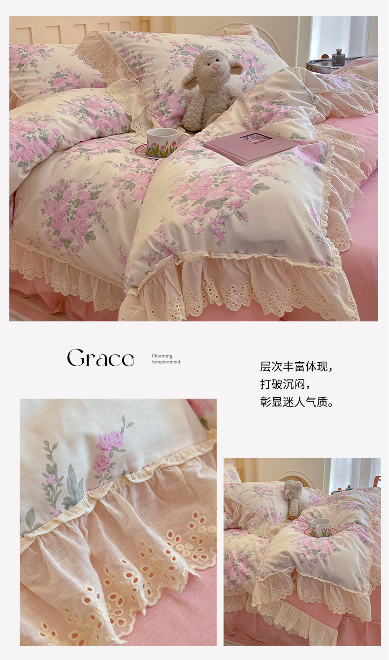 商品名称:金丝鸟家纺 2024新款韩式全棉镂空大花边公主风花卉系列四件套 花涧梦 粉