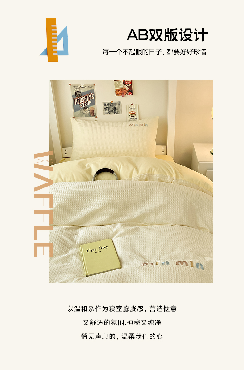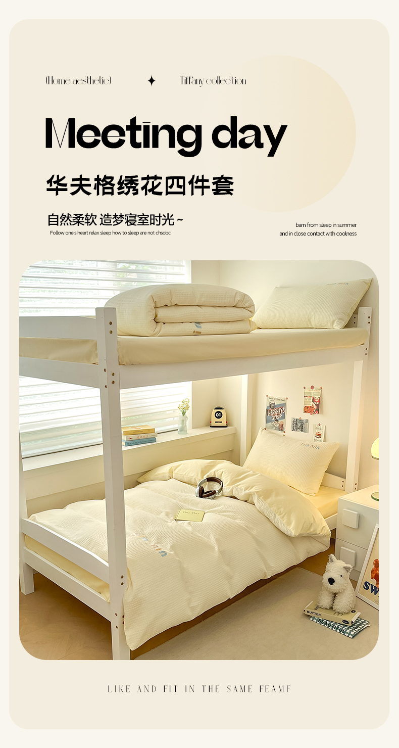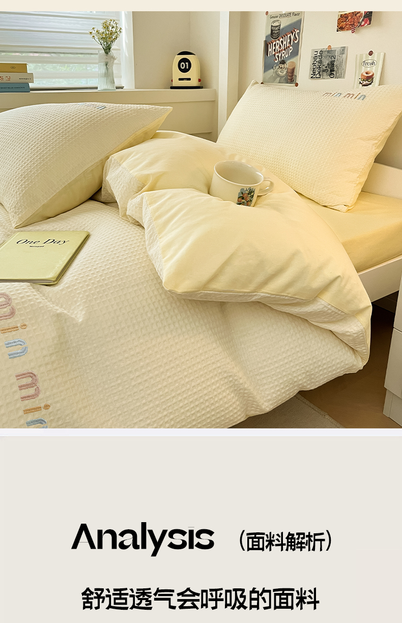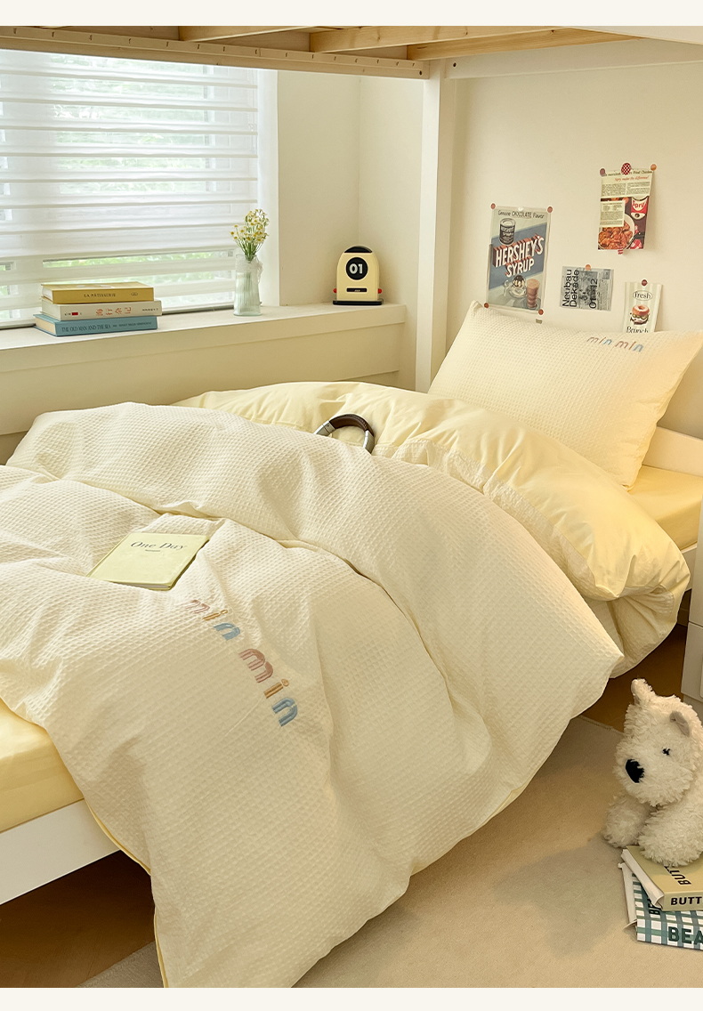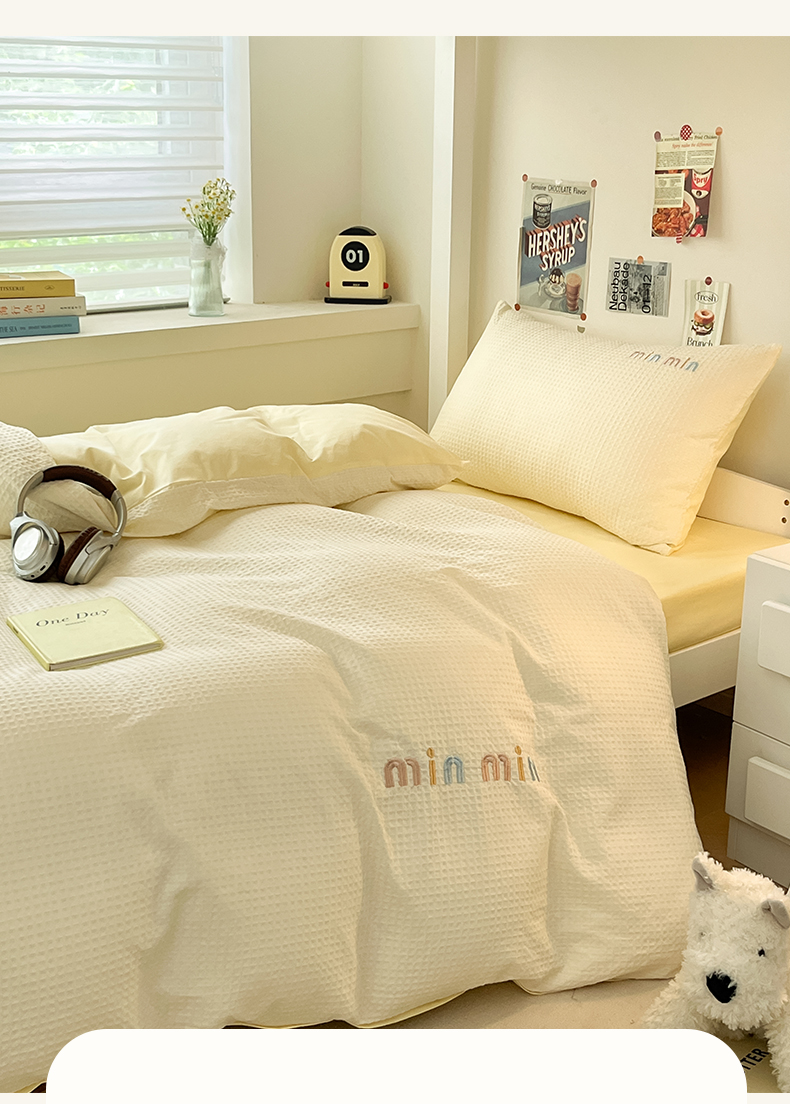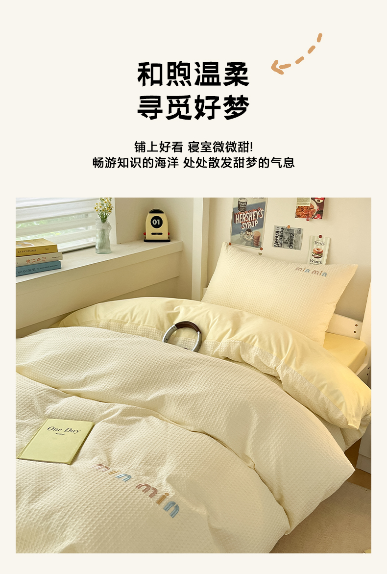 当前位置: 91家纺网 > 商品网购 > 床品套件 > 四件套 > 全棉普通四件套 > 雅居纺家纺 2024新款开学季全棉A类华夫格绣花四件套-Min Min-米黄
