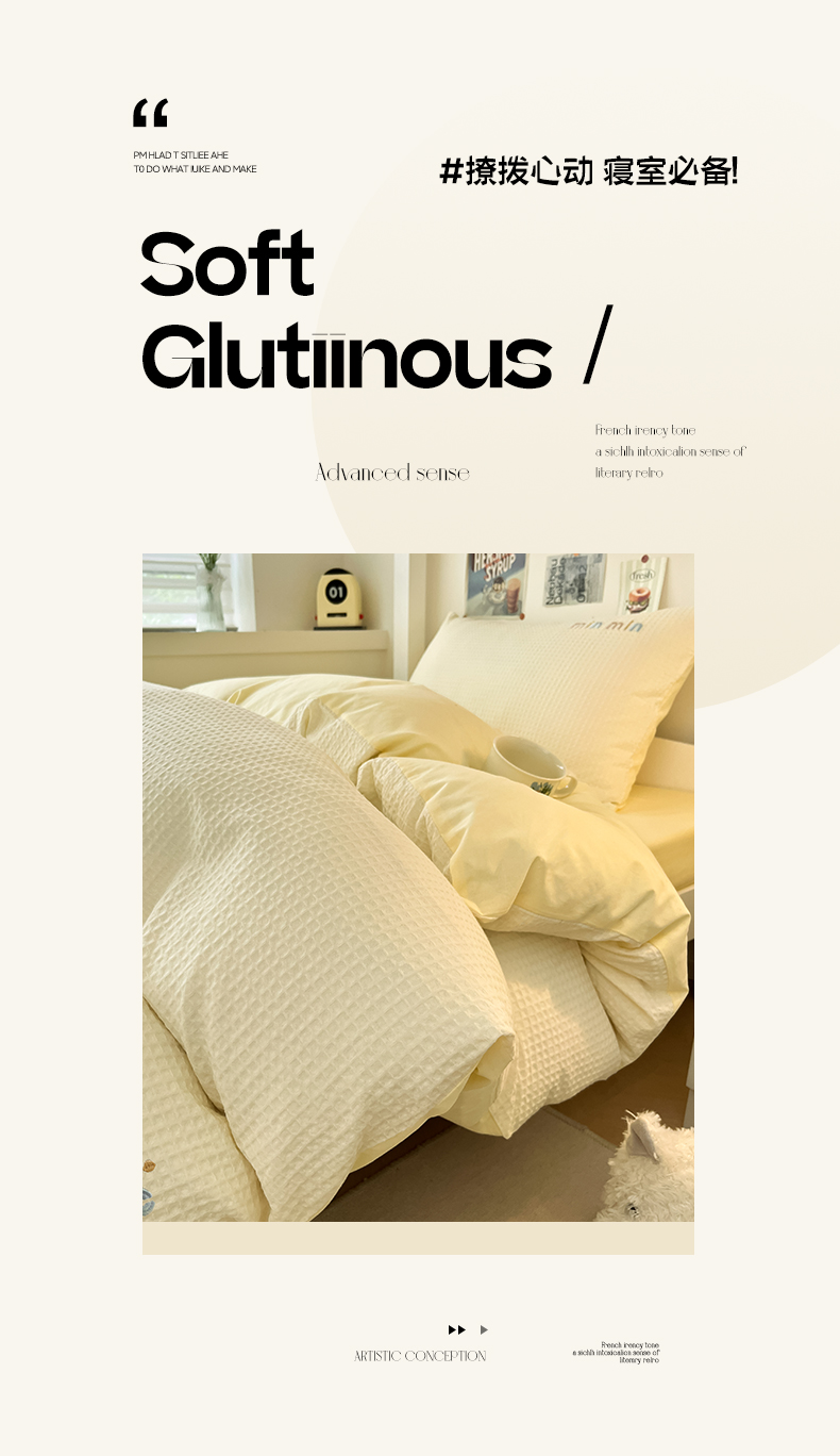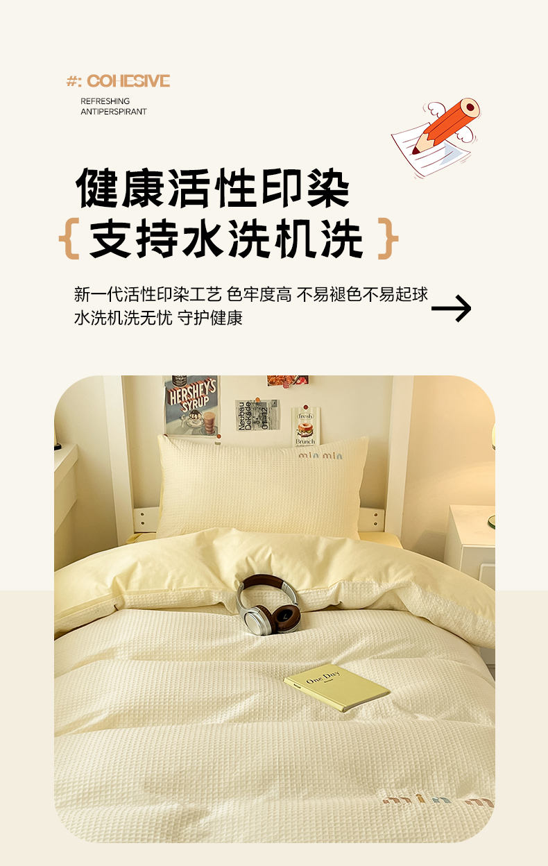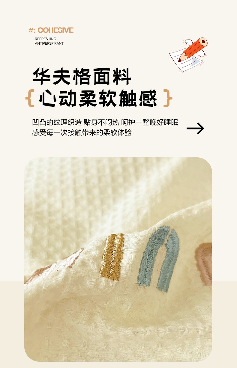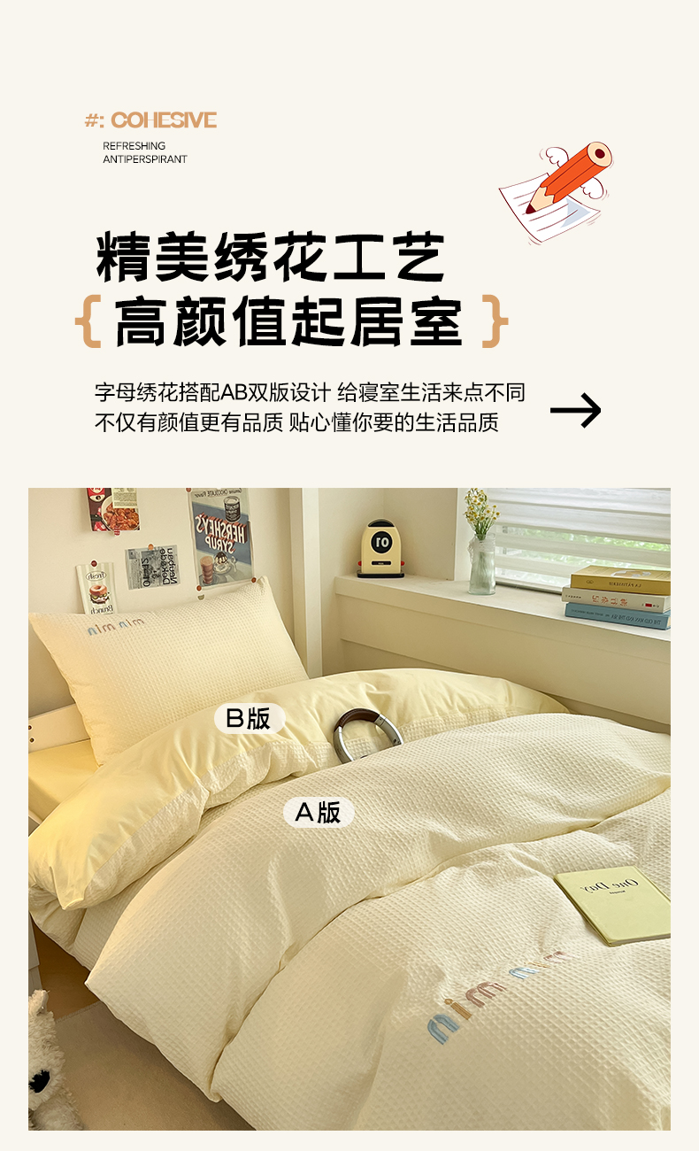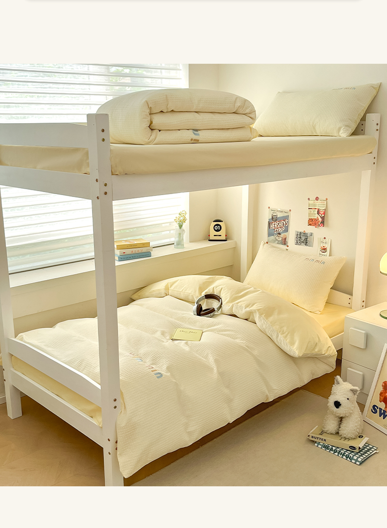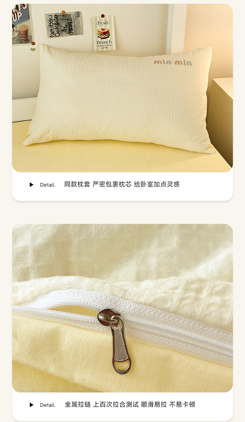 当前位置: 91家纺网 > 商品网购 > 床品套件 > 四件套 > 全棉普通四件套 > 雅居纺家纺 2024新款开学季全棉A类华夫格绣花四件套-Min Min-米黄