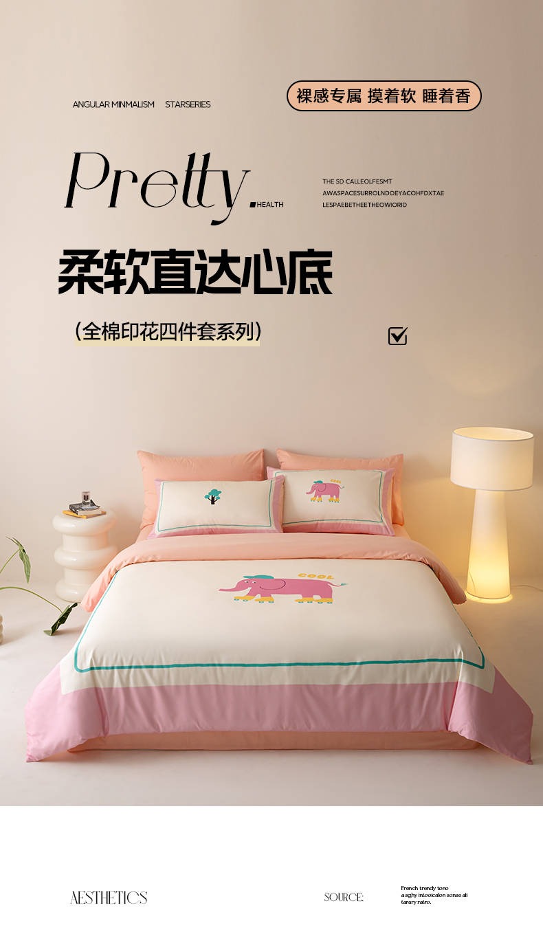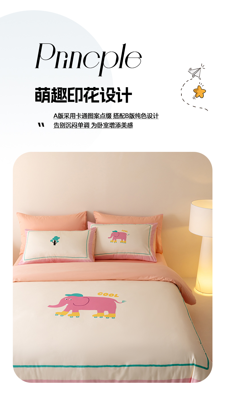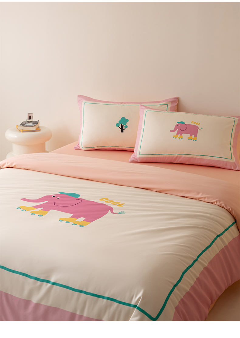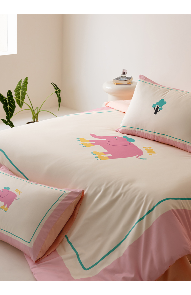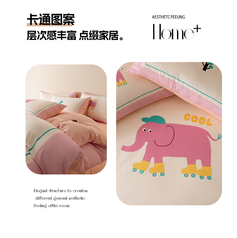 商品名称:雅居纺家纺 2024新款全棉印花13372大版四件套 粉色小象