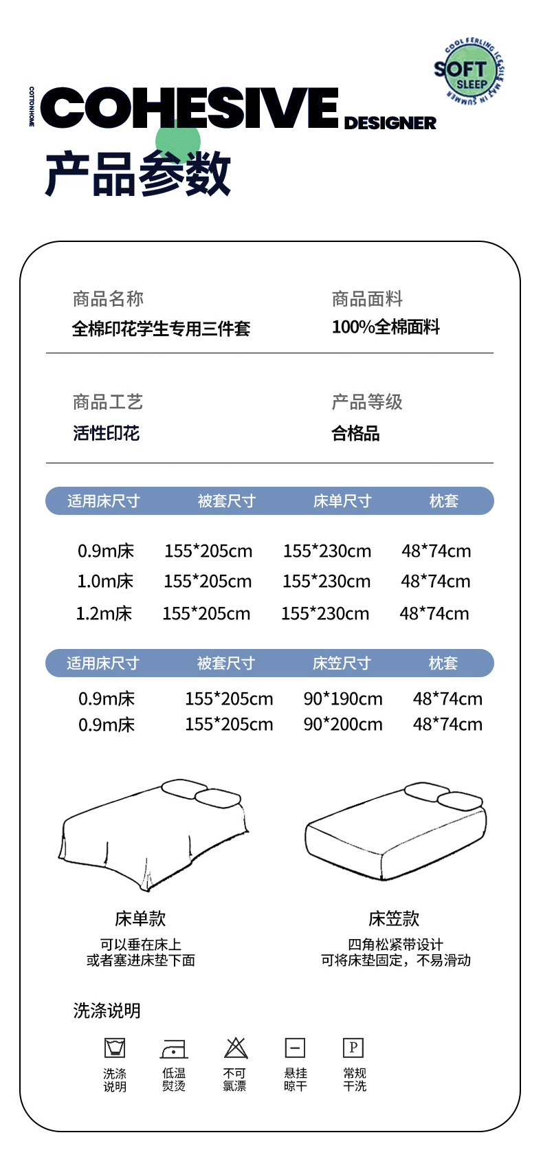 0.9m床单款三件套【被套1.55*2.05床单1.55*230 枕套48*74*1只】