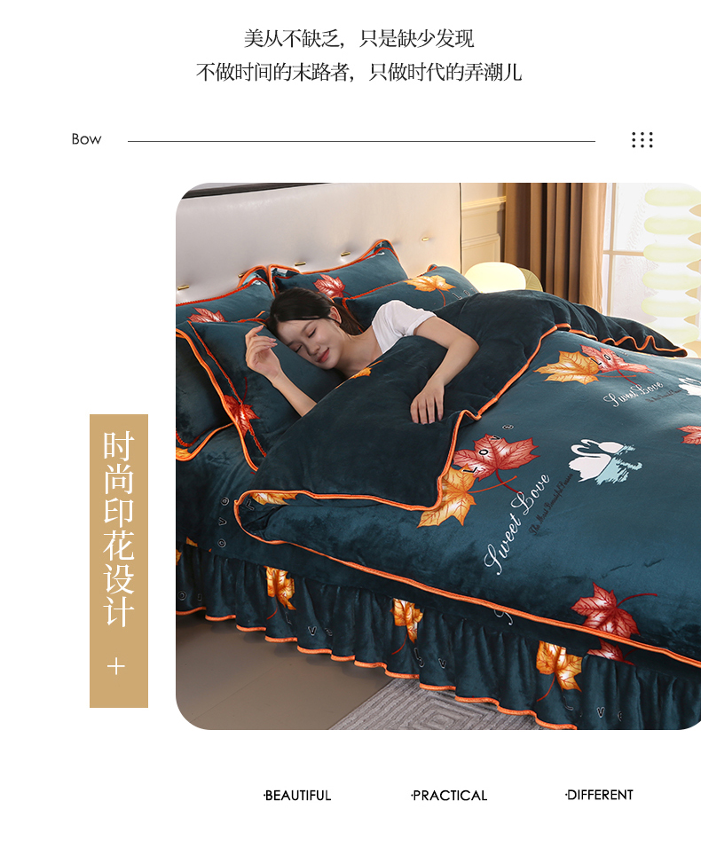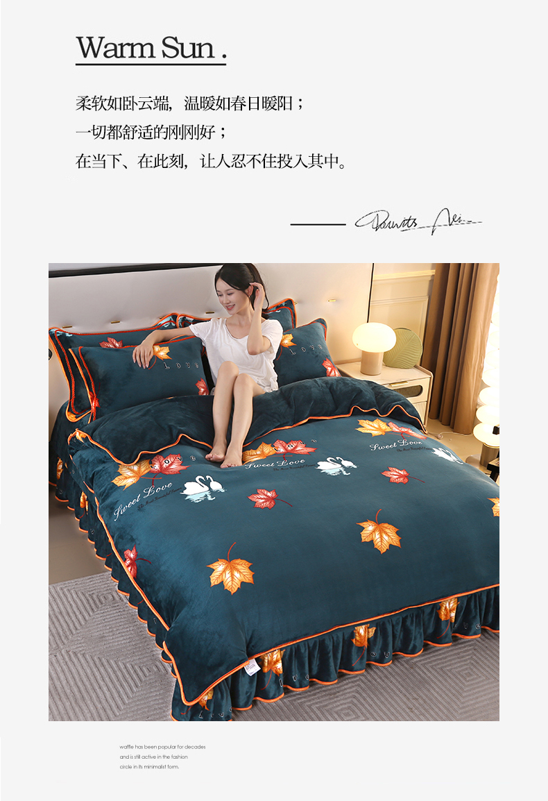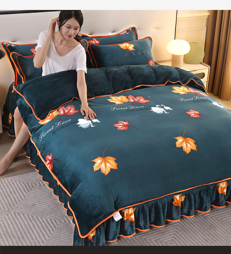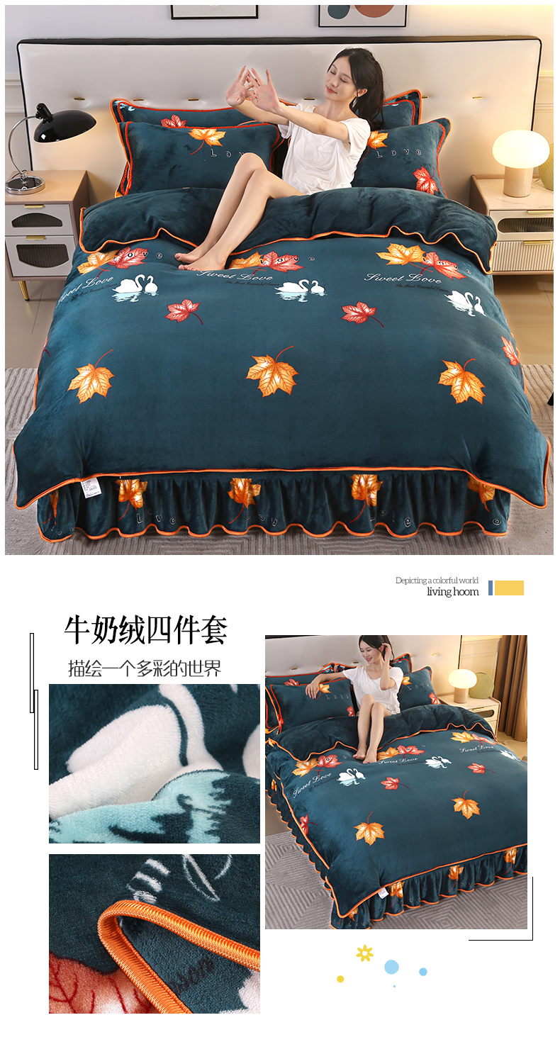 代芙家纺 7斤重牛奶绒金貂四件套抗静电法莱绒珊瑚绒床裙 秋风落叶