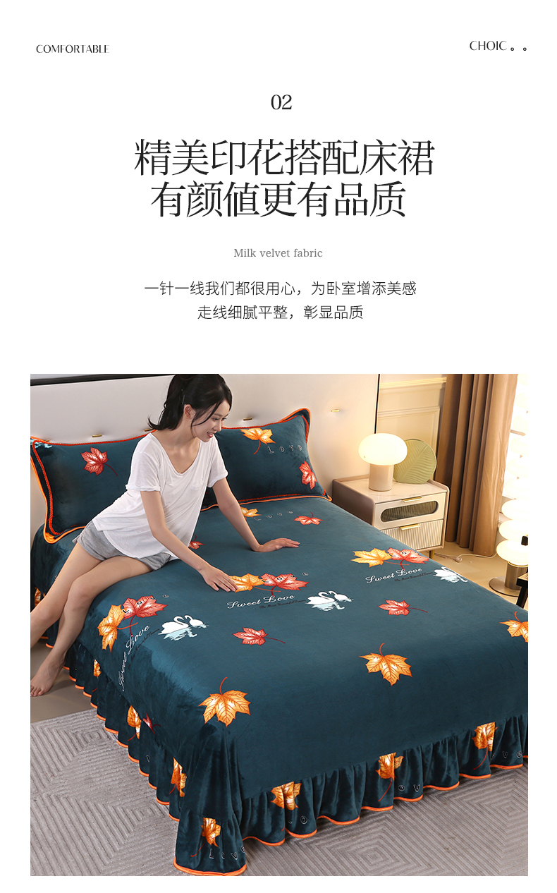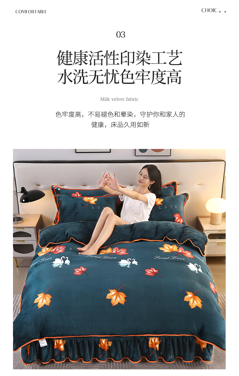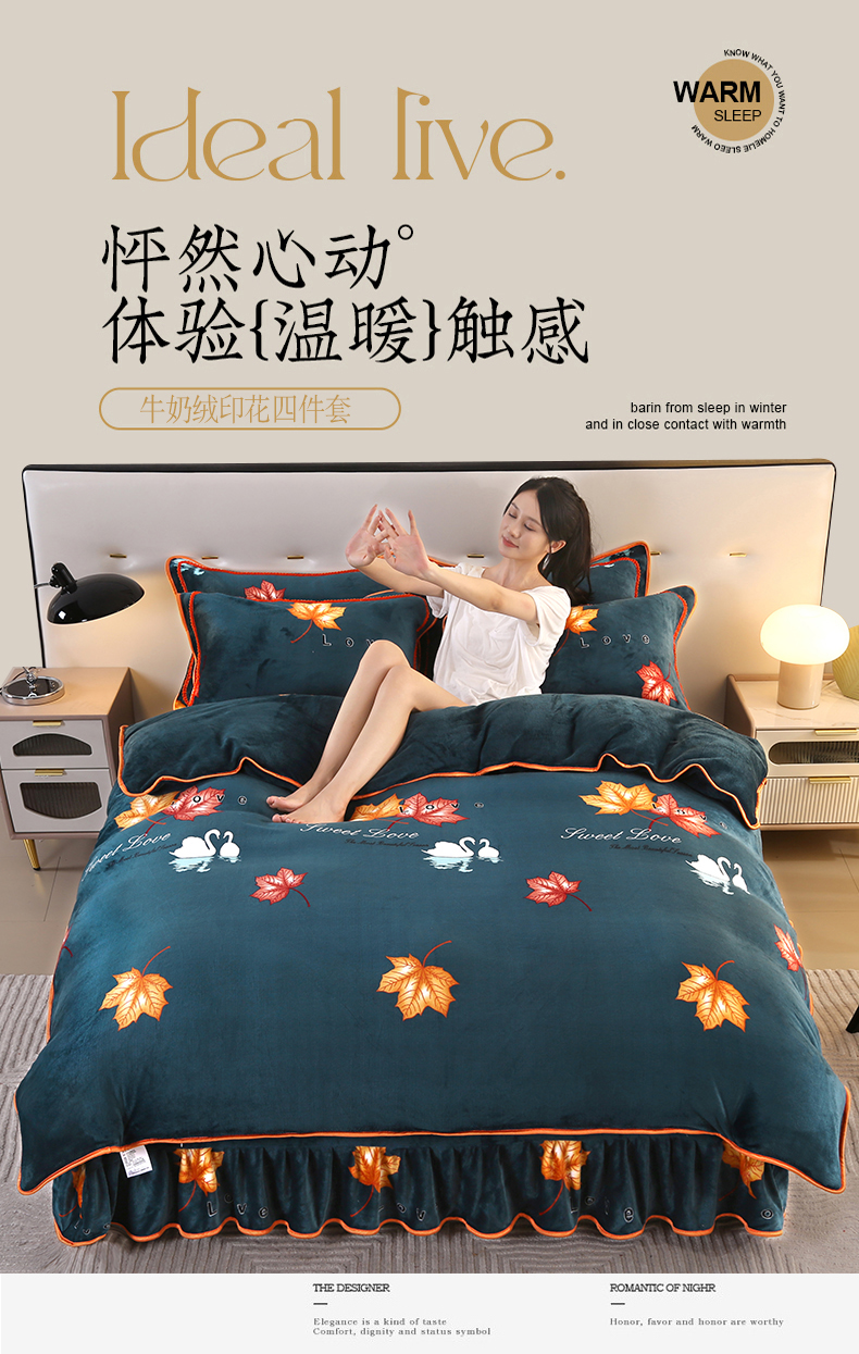 代芙家纺 7斤重牛奶绒金貂四件套抗静电法莱绒珊瑚绒床裙 秋风落叶