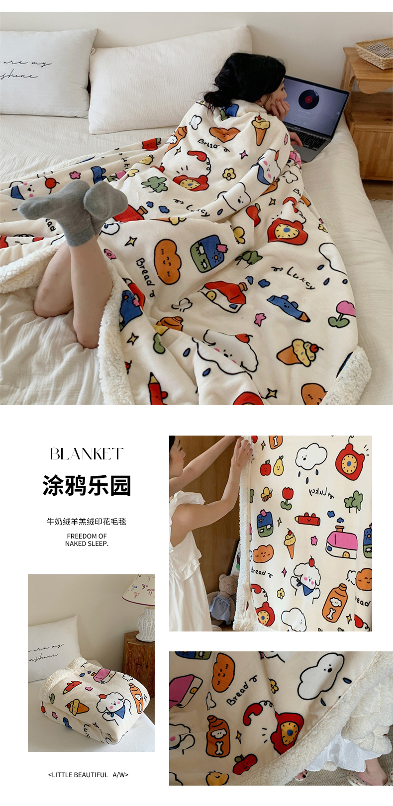 商品名称:桃喜 2024新款亲肤舒适牛奶绒羊羔绒毛毯 涂鸦乐园