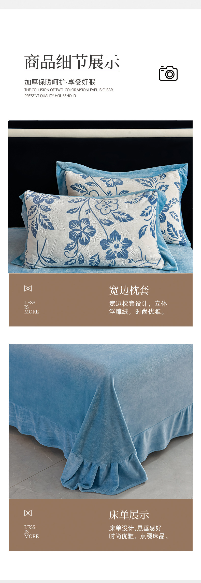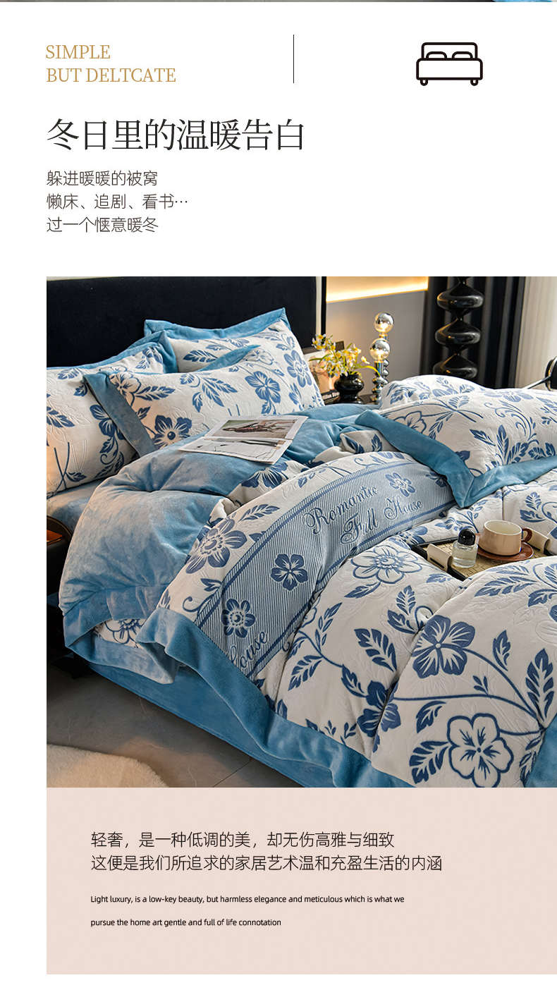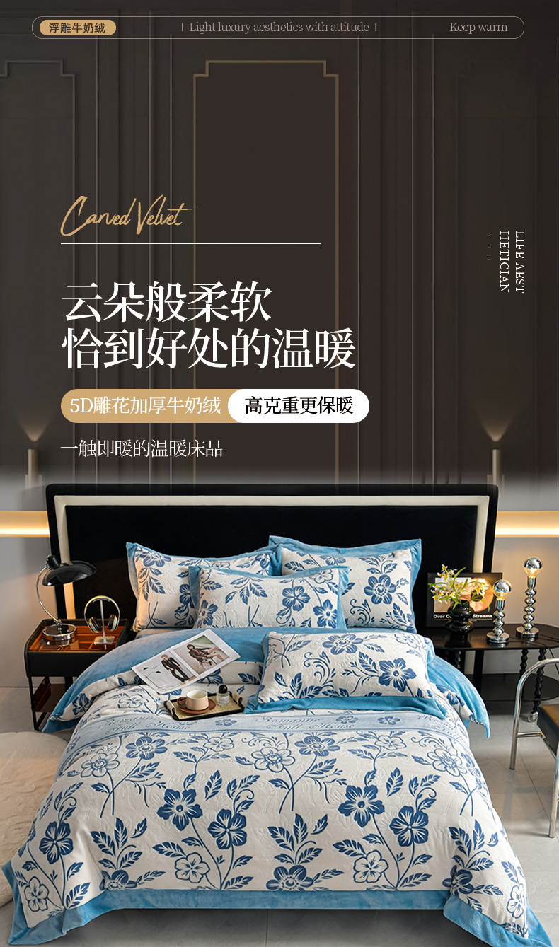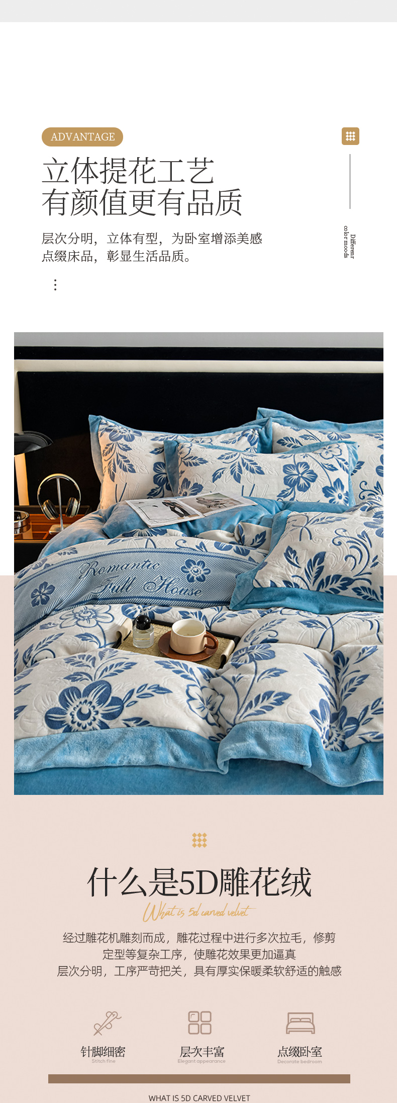 商品名称:馨梦缘 2025新款宽边5D雕花绒牛奶绒四件套 繁花-蓝