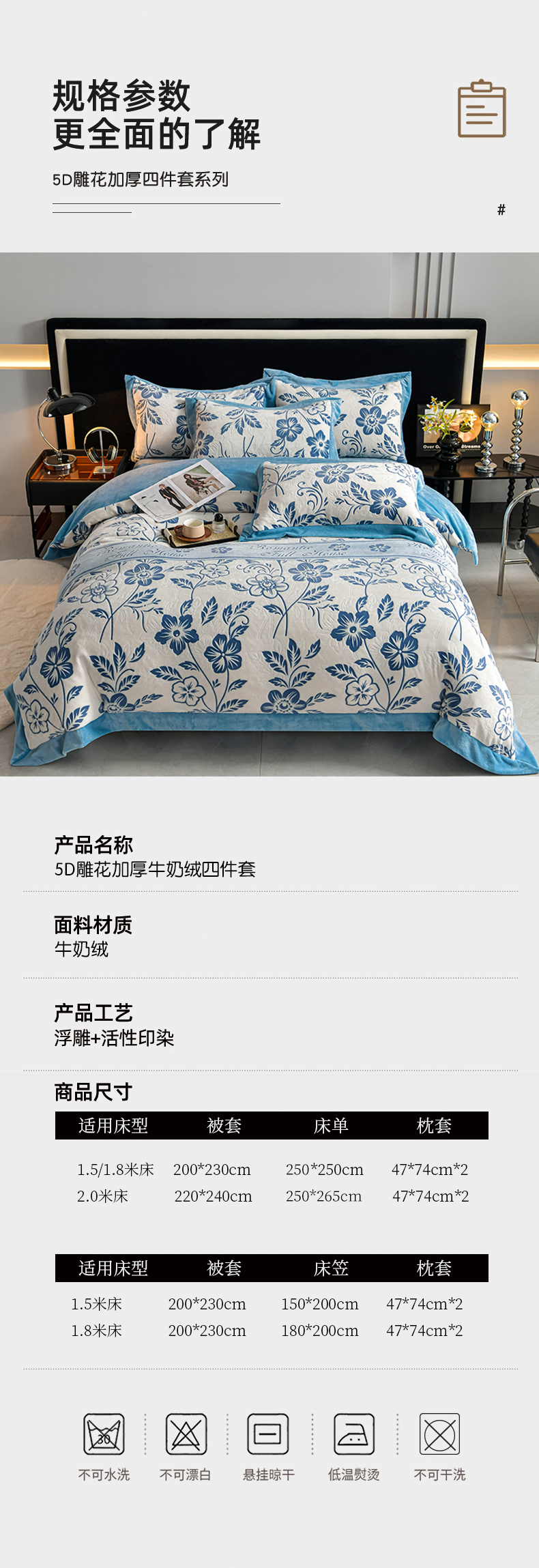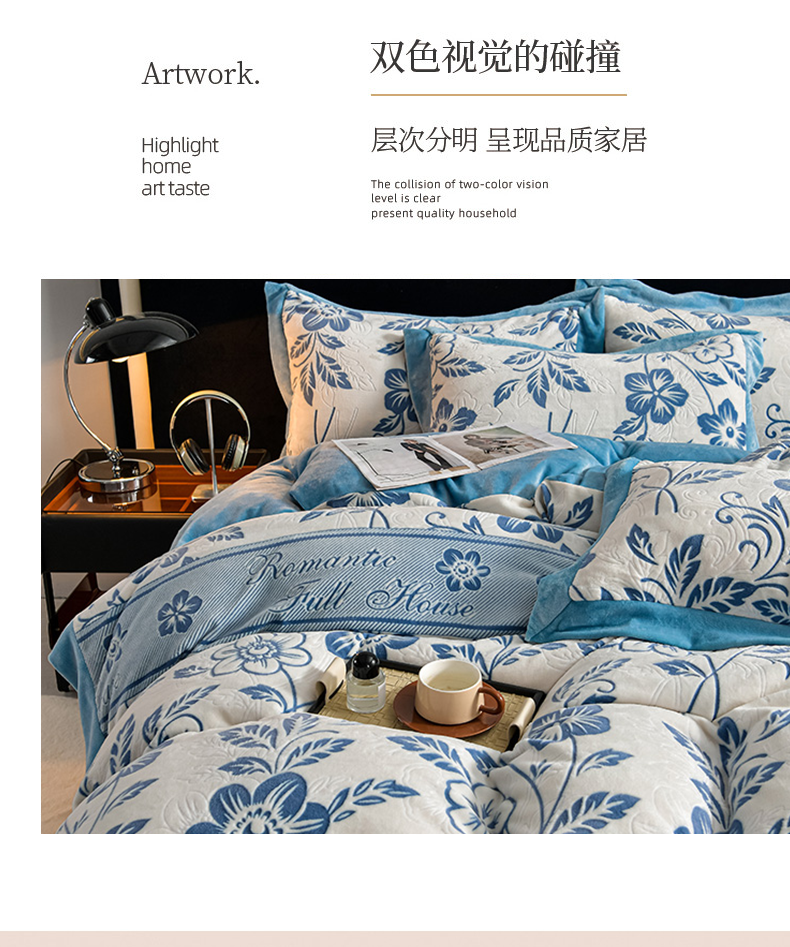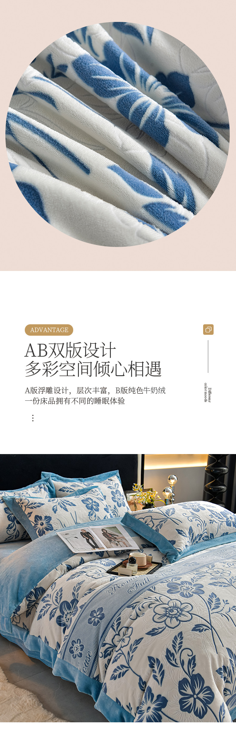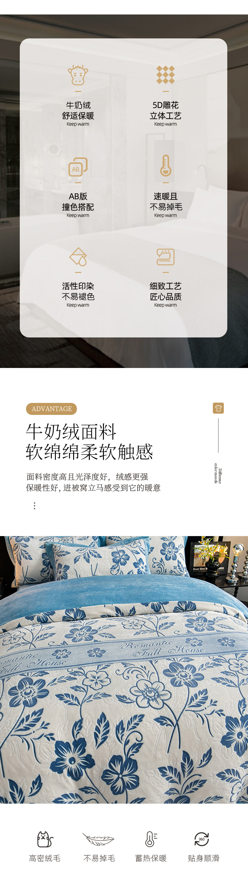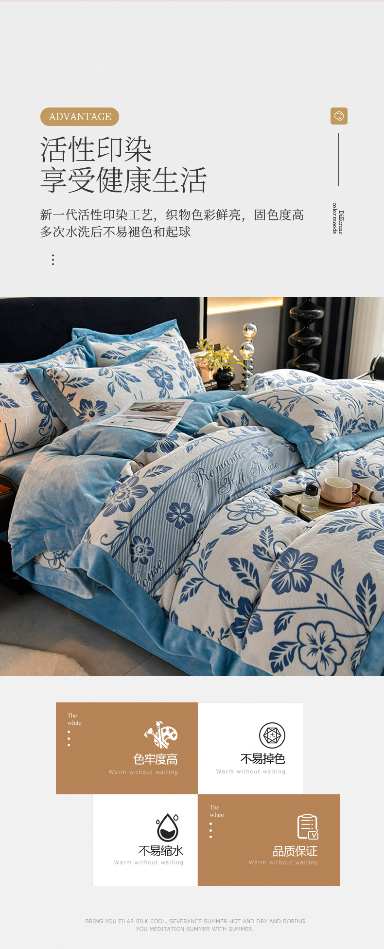 商品名称:馨梦缘 2025新款宽边5D雕花绒牛奶绒四件套 繁花-蓝