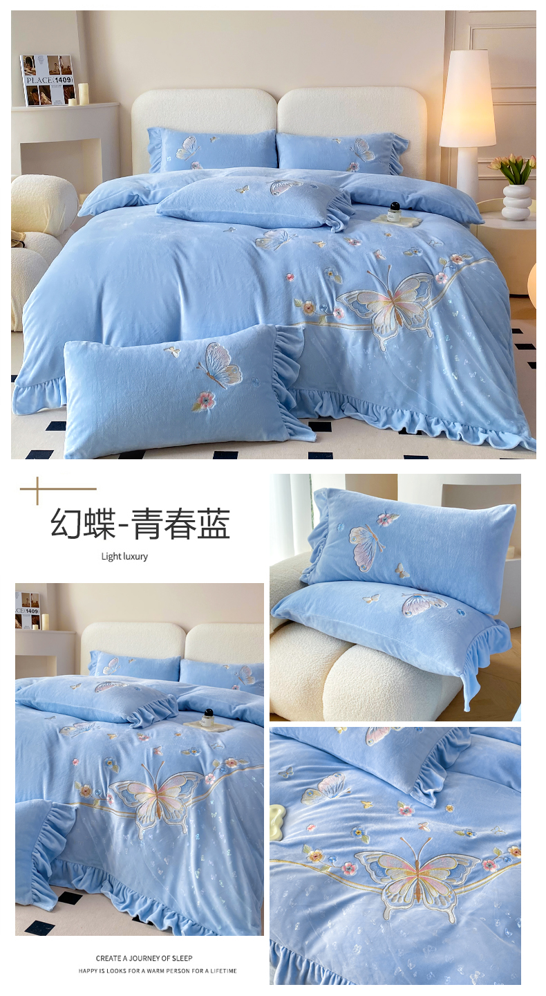 航途席业 2025新款高克重牛奶绒刺绣四件套-梦幻蝶舞 梦幻蝶舞-蓝