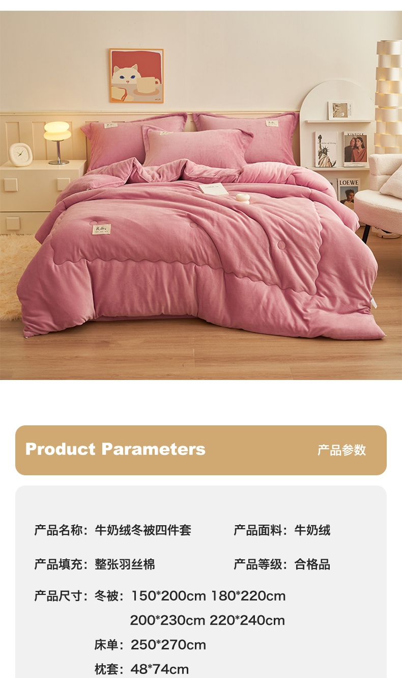 当前位置: 91家纺网 > 商品网购 > 被子 > 冬被 > 2024新款保暖舒适牛奶绒冬被四件套 豆沙
