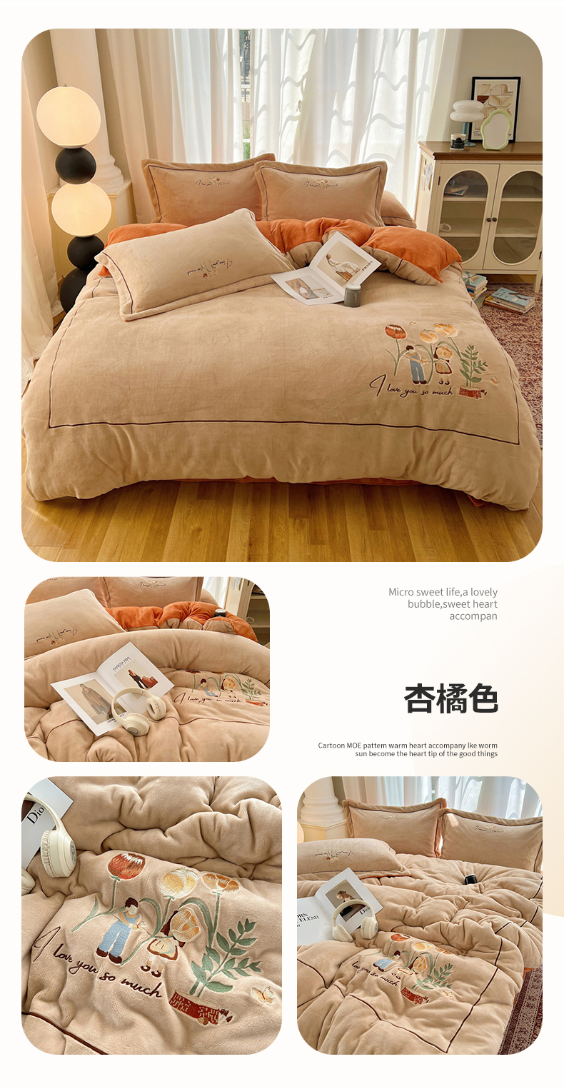丽涵家纺 2024新品消光锦芙绒绣花四件套 杏橘色