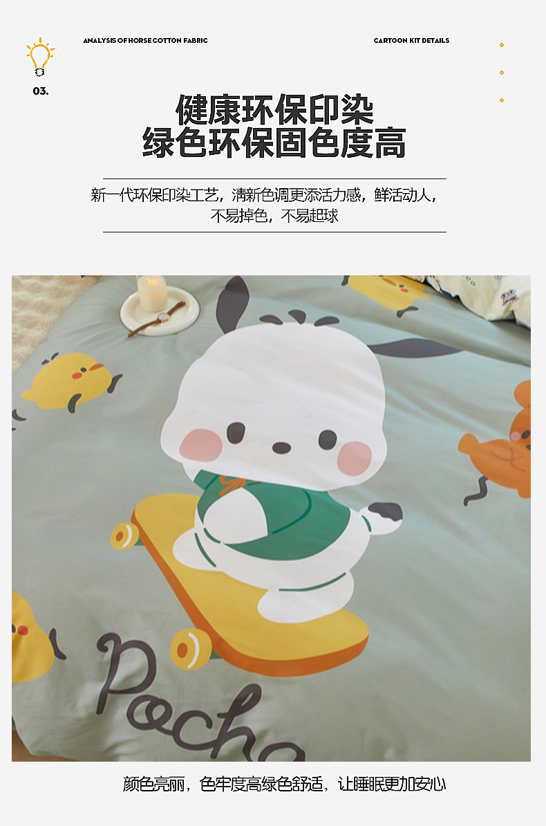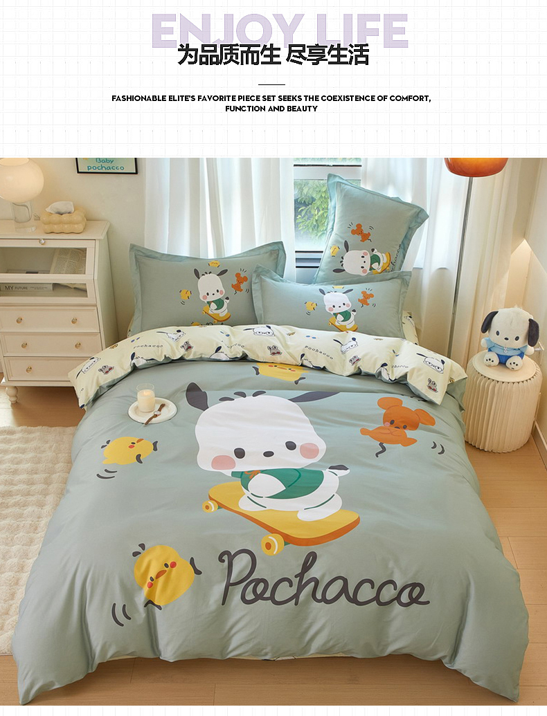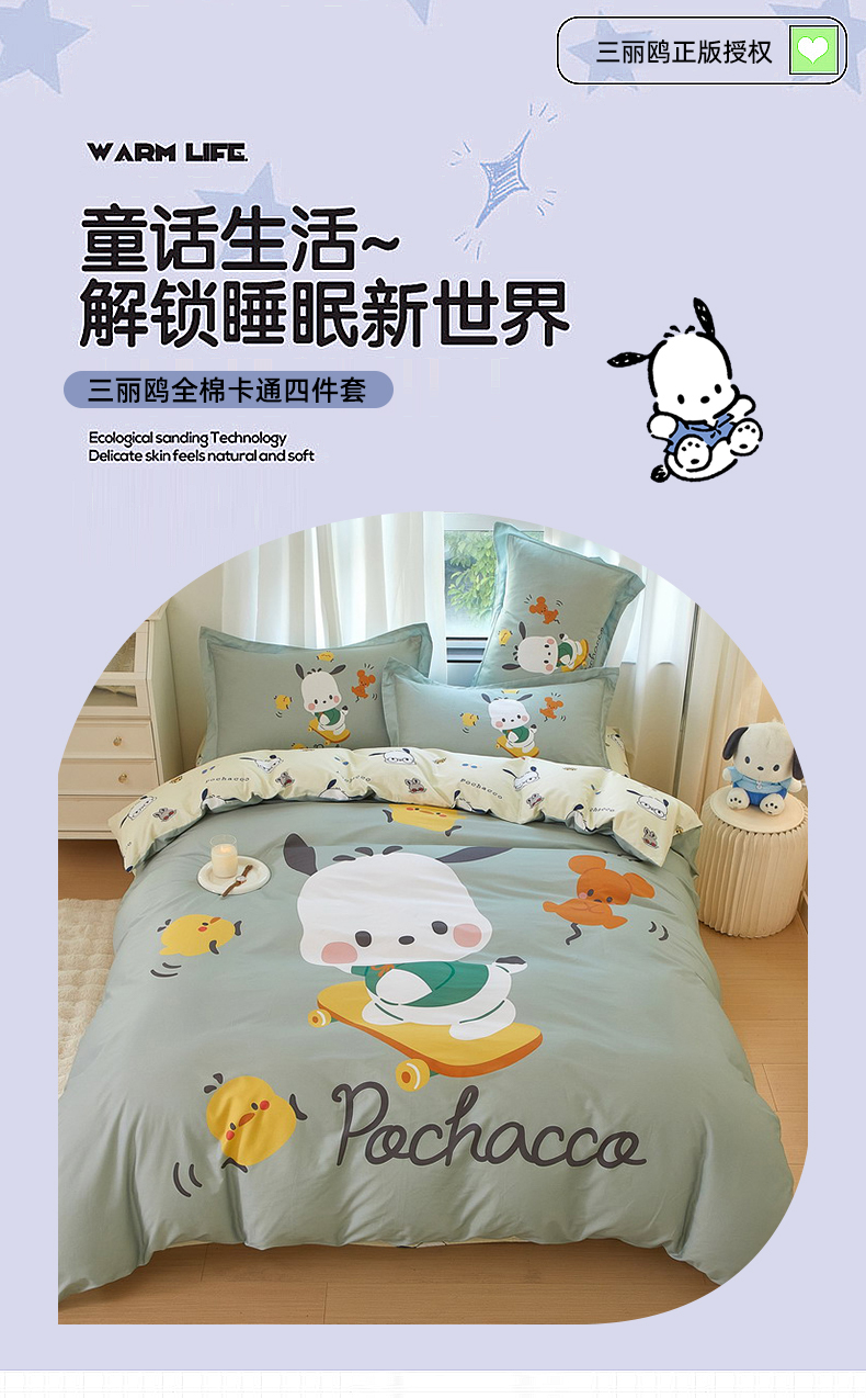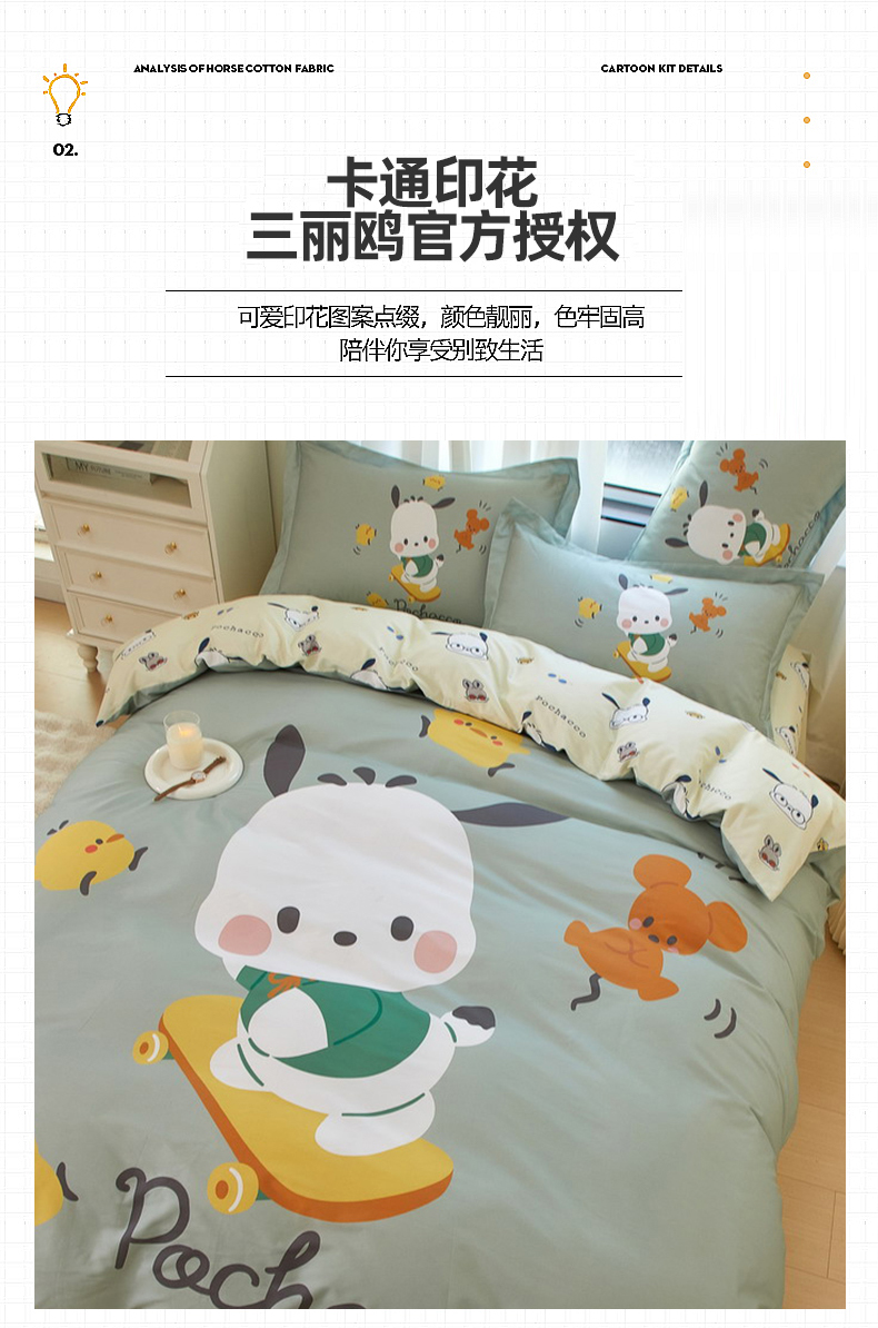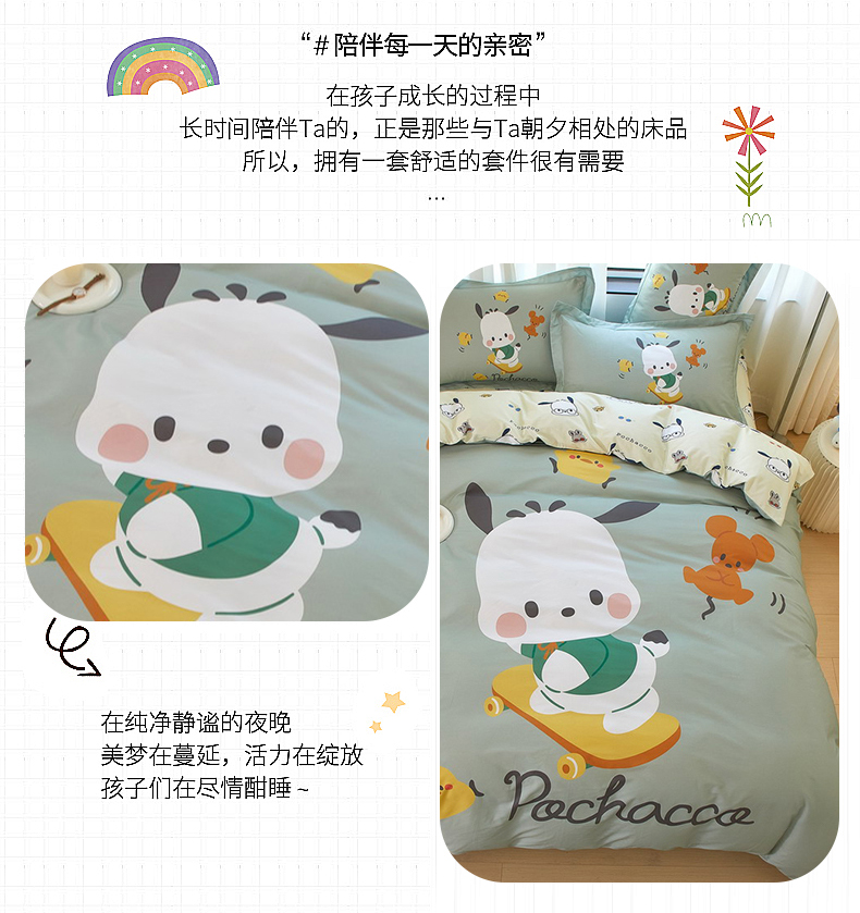 商品名称:蘭菲家纺 2024新款全棉大版卡通三丽鸥四件套 滑板恰恰