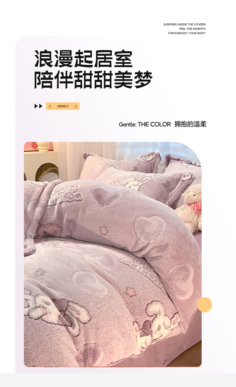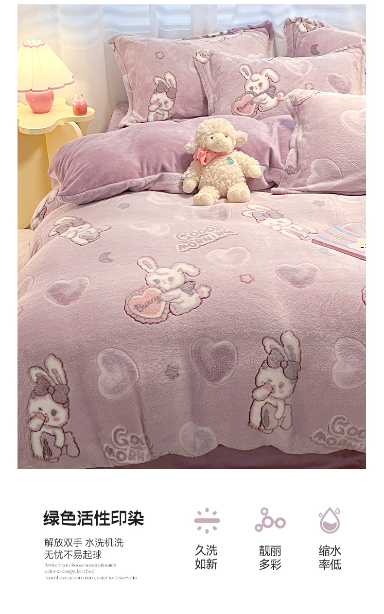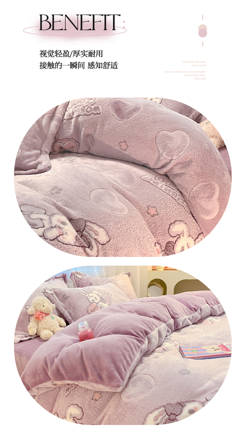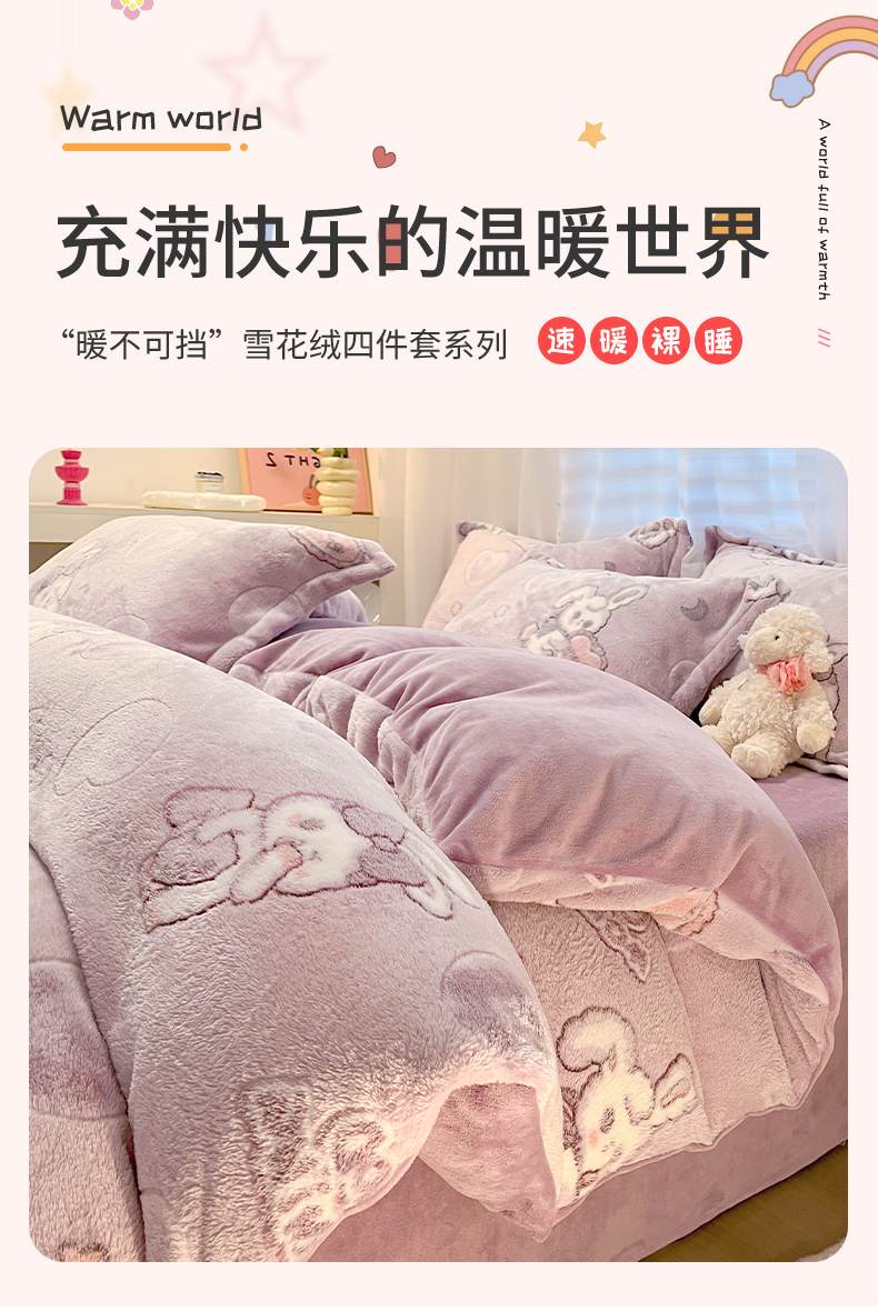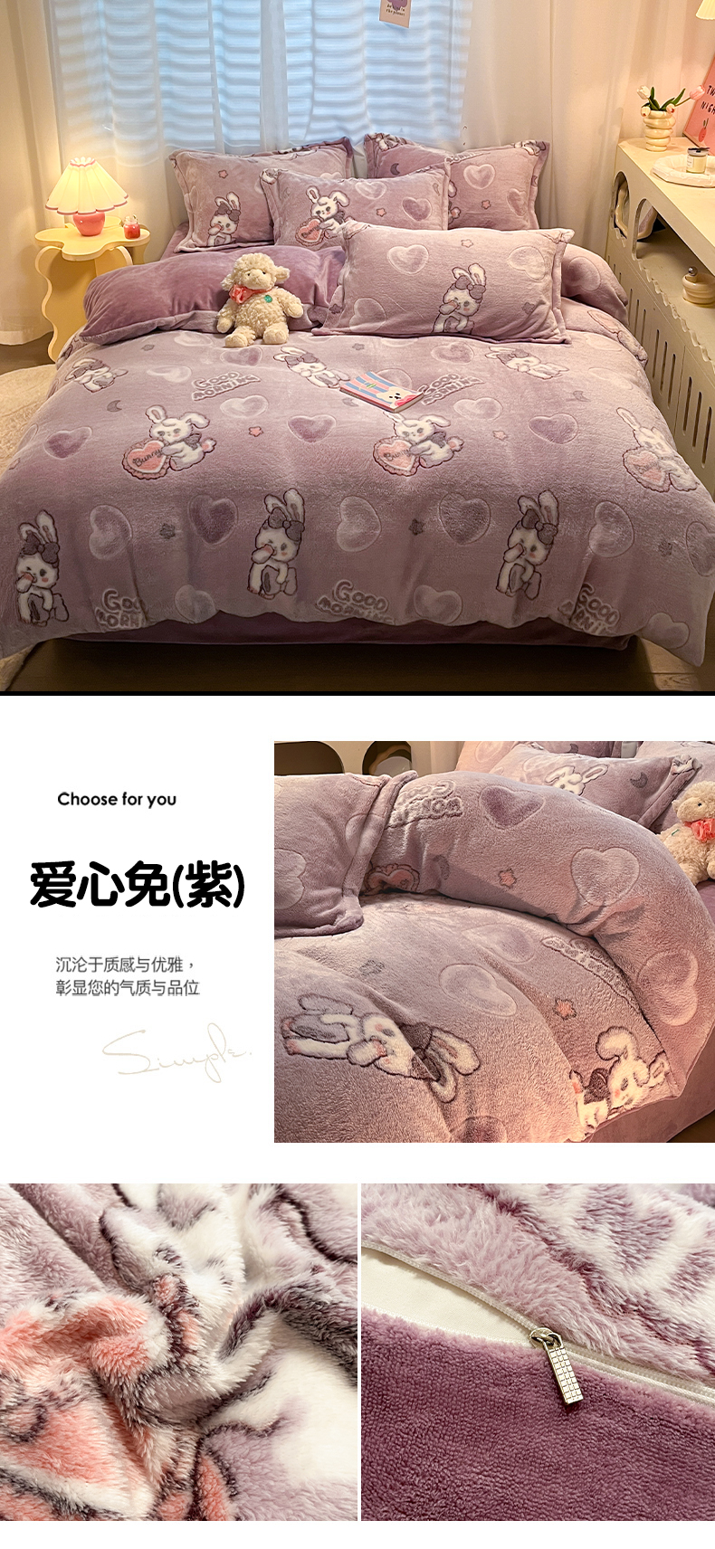 当前位置: 91家纺网 > 商品网购 > 床品套件 > 四件套 > 其它四件套 > 韩巢家纺 2024新款加厚雪花绒印花四件套-风格一(提供卖家秀) 爱心免(紫)