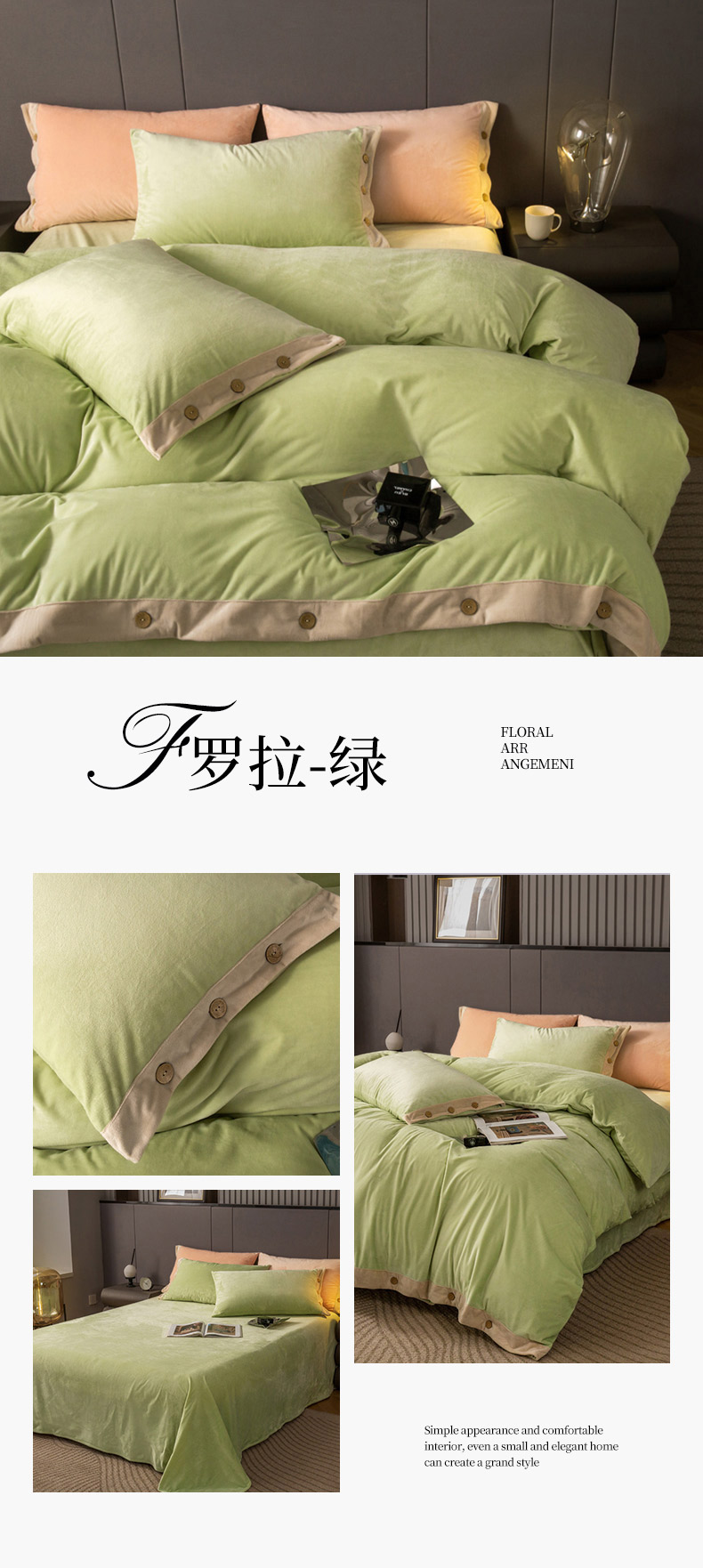 商品名称:库里梦家纺 2024新款纽扣款婴儿绒保暖四件套 罗拉-绿