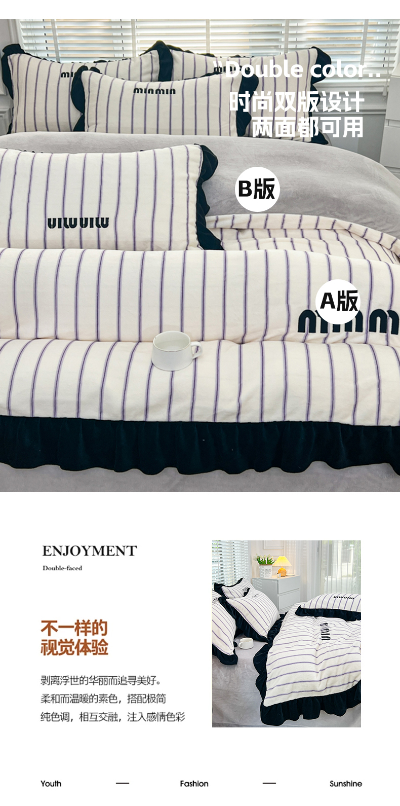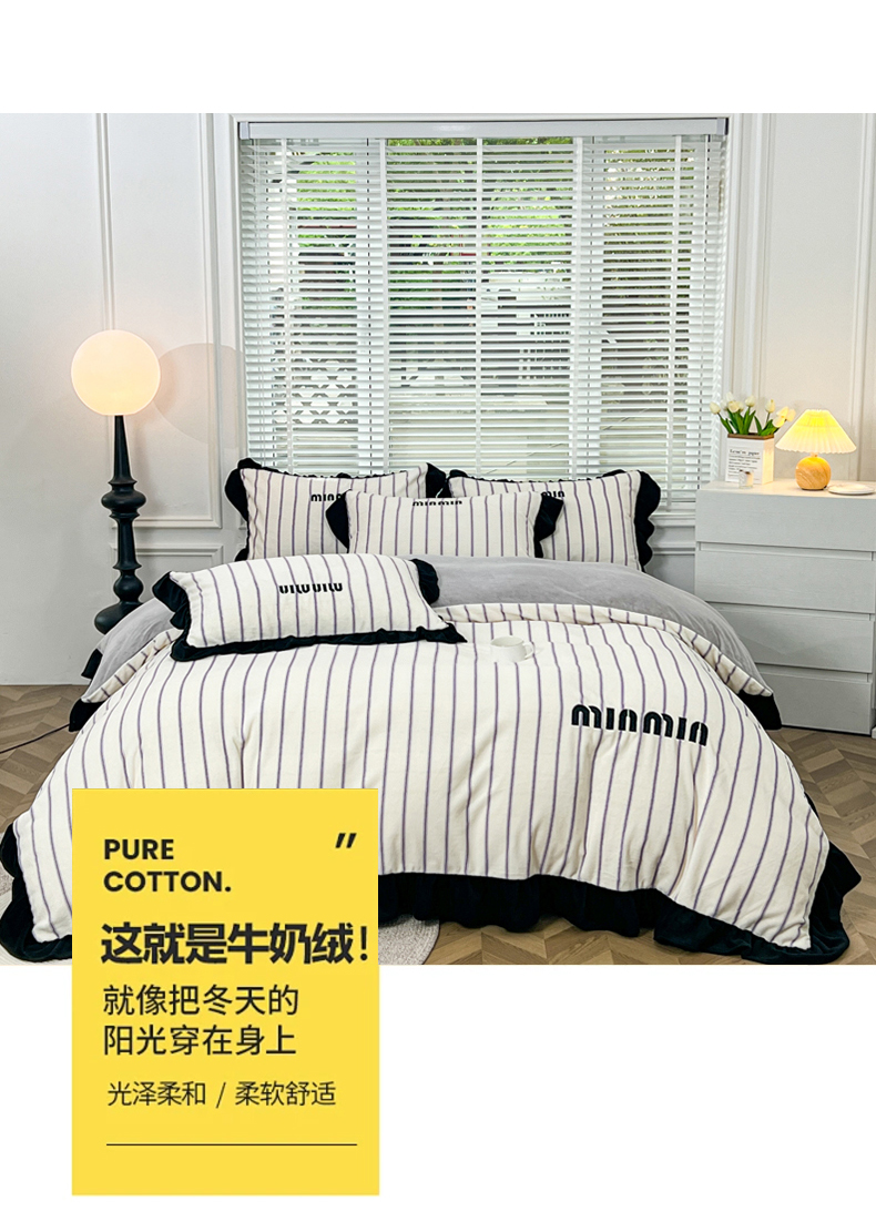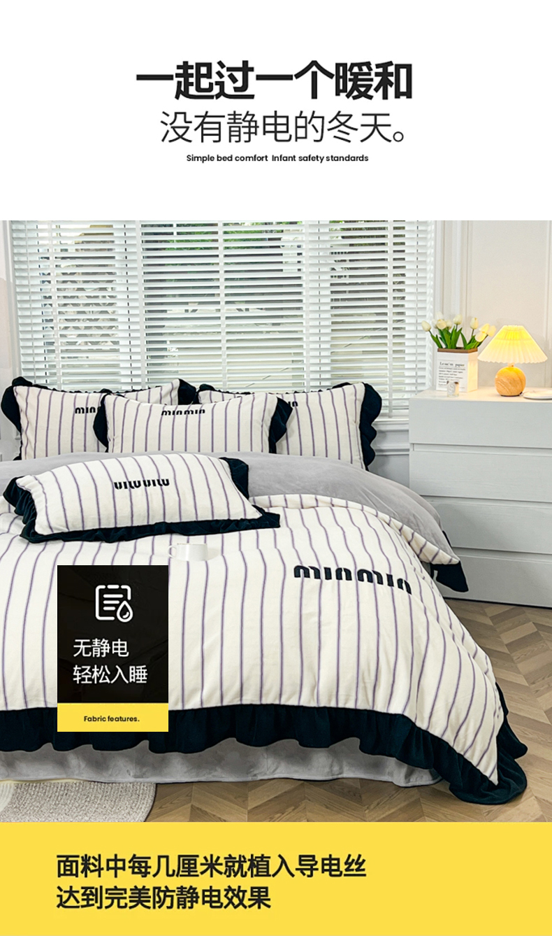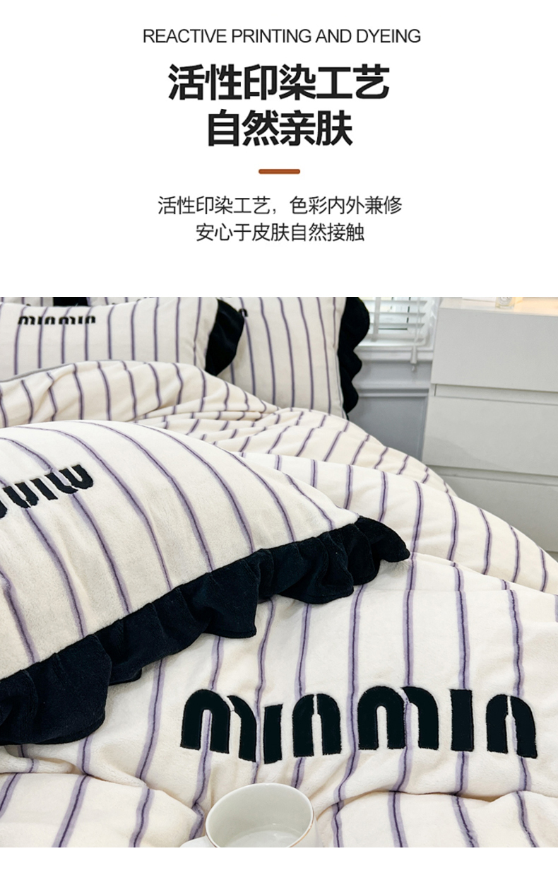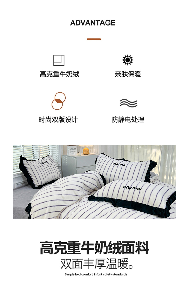 商品名称:(总)子曰 2025新款高克重法式小香风牛奶绒花边条纹系列四件套-罗拉